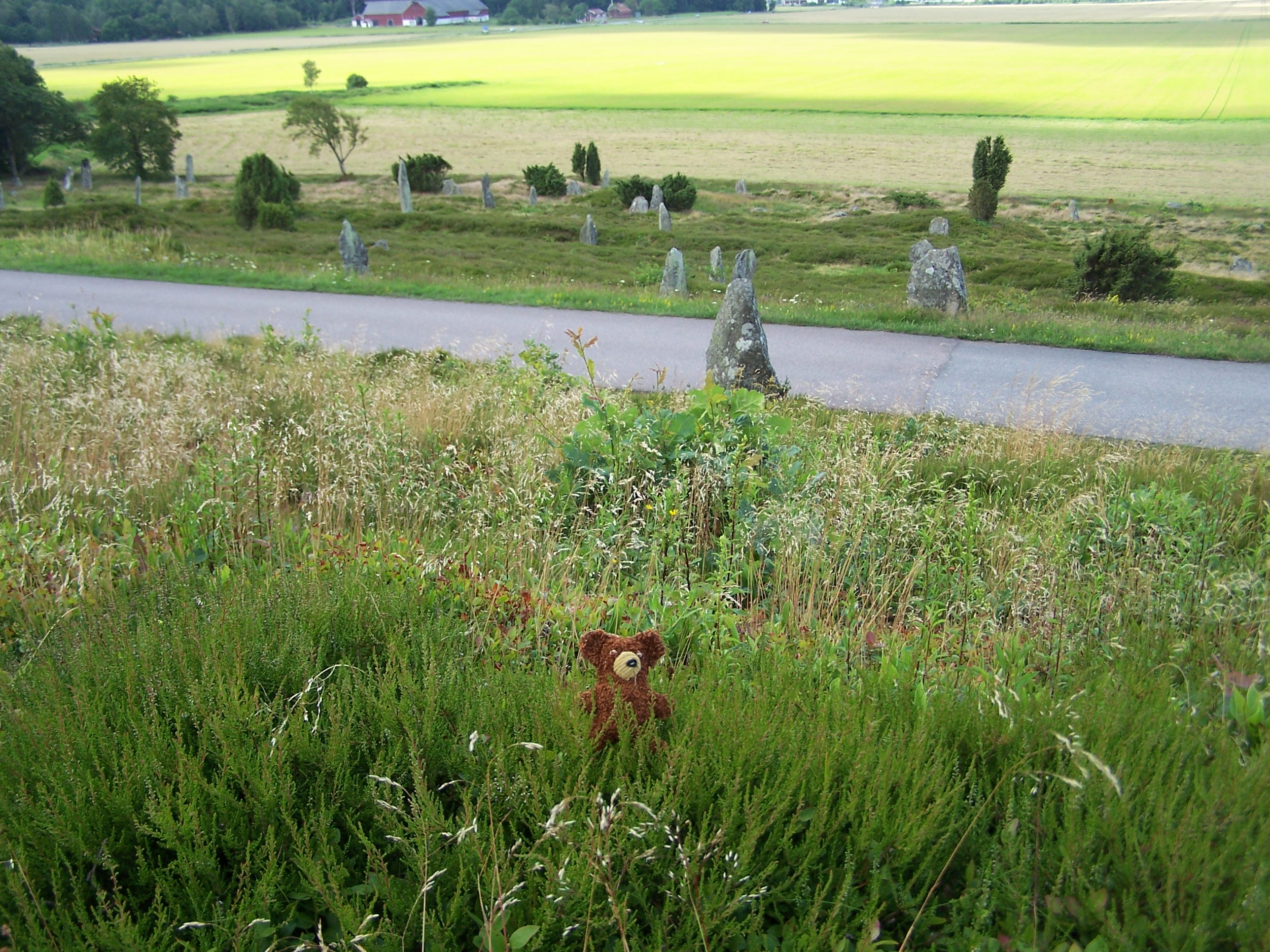 Das Zelt war nach dem gestrigen Gewitter wieder schön trocken und ich fuhr fröhlich zum nächsten Ziel. Fjäras Bräcka ist eine Endmoräne (ein großer Hügel Geröll, den das Eis vor sich hergeschoben hat). Von hier aus hat man eine tolle Aussicht aufs Umland und ein altes Grabfeld mit großen Steinen gibt es hier auch.