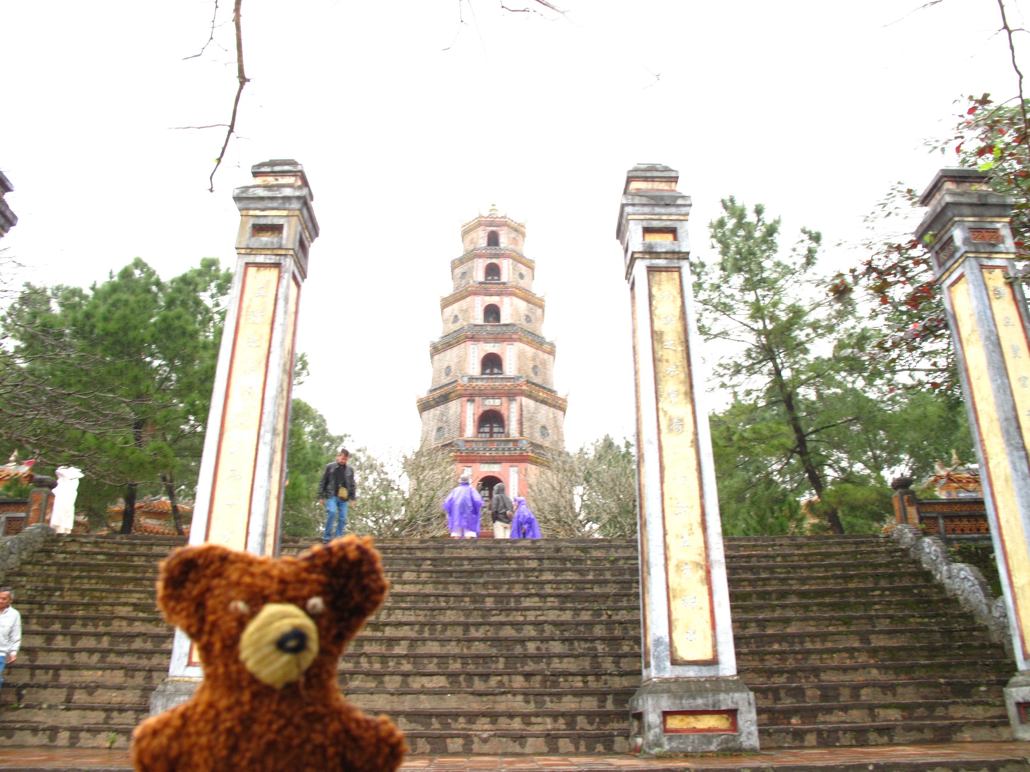 In Hue fuhr ich am Morgen auf dem Parfümfluss zur Pagode der Himmelsgöttin (Chua Thien Mu). Hier überraschte mich mein erster Regenschauer. Aber ich saß ja zum Glück im Boot.