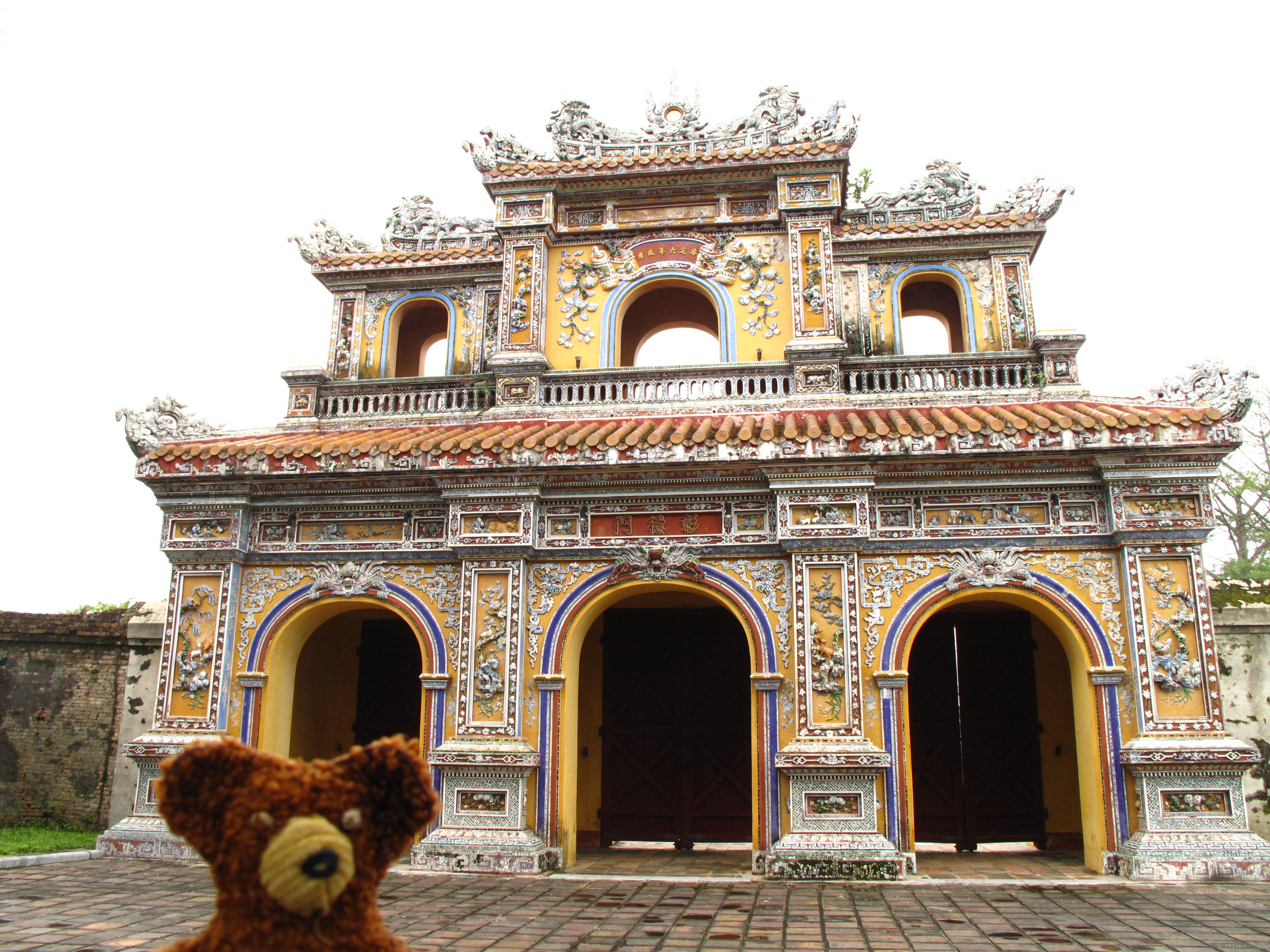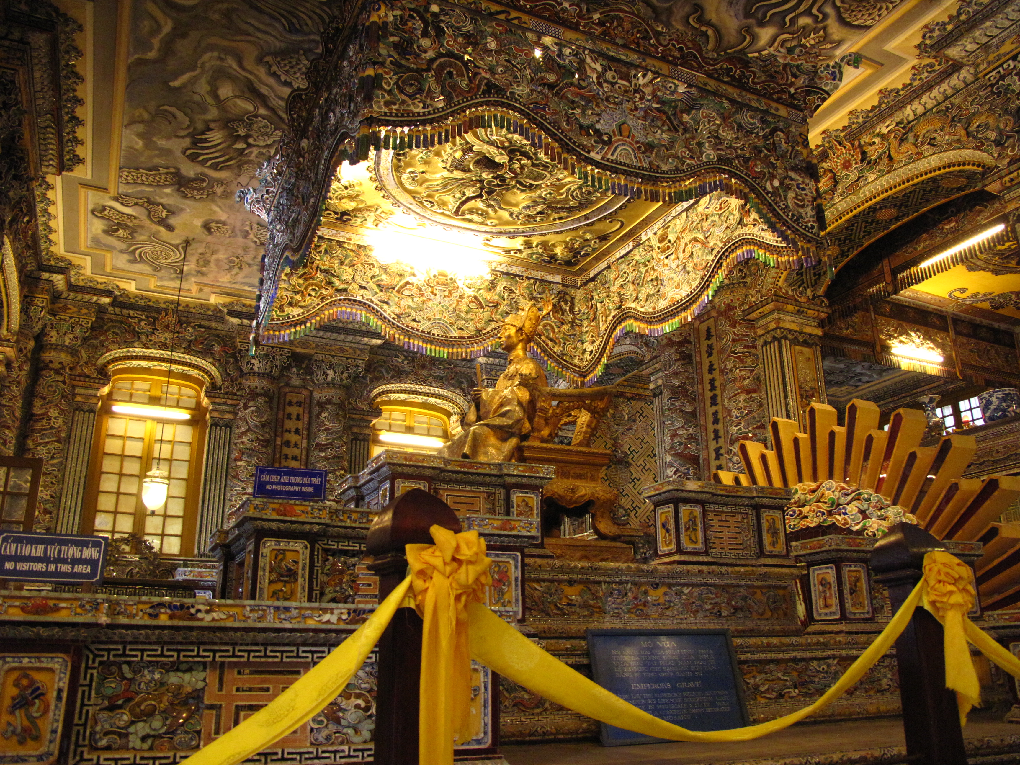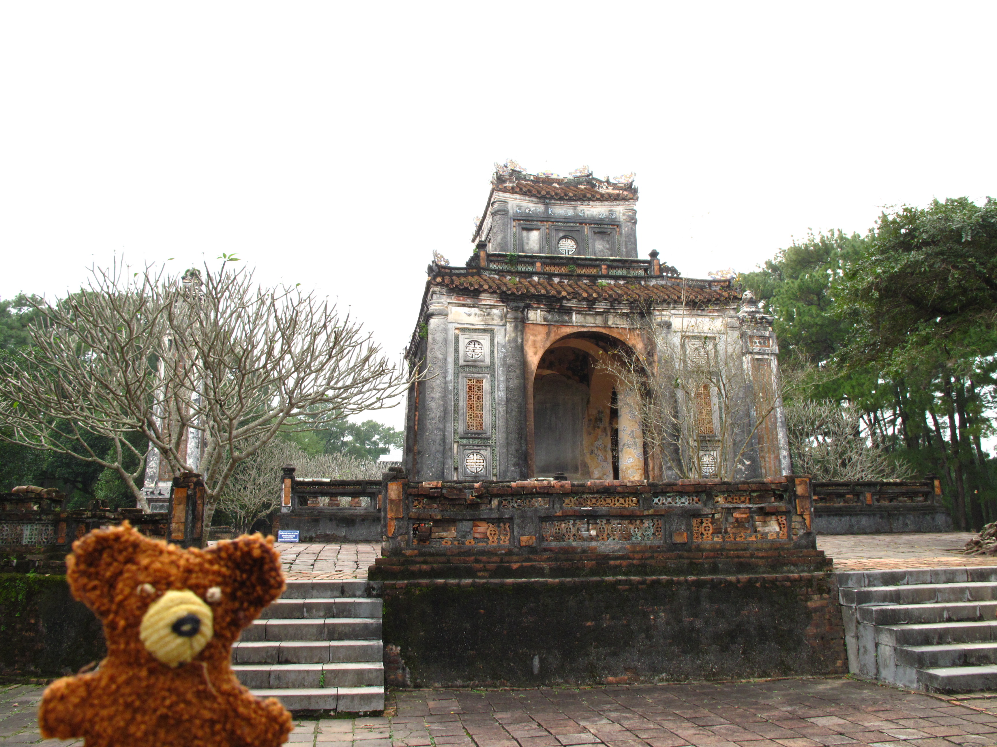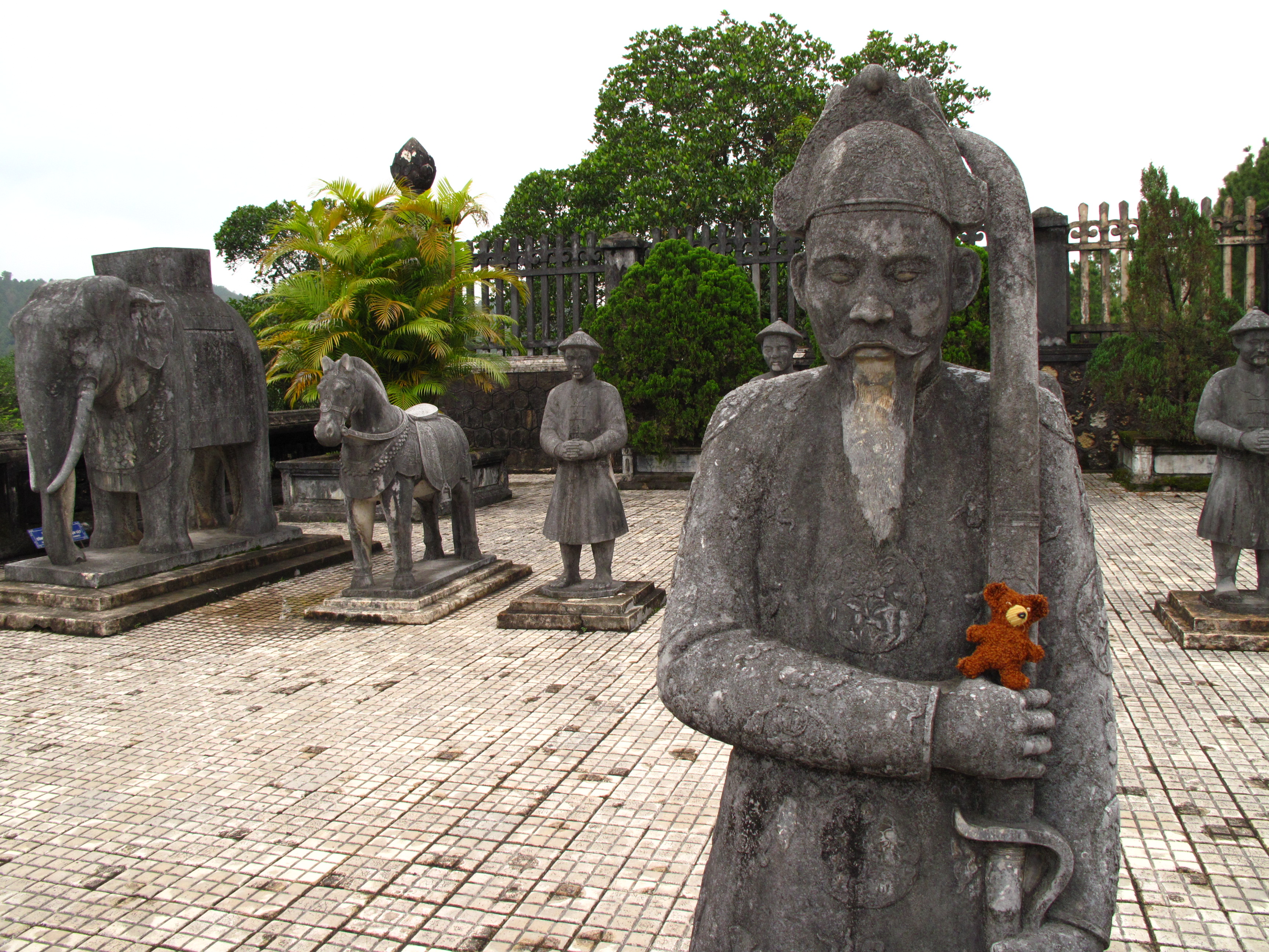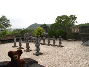 Als letzten Punkt für heute, schauten wir uns das Grab von Khai Dinh an (1931). Am Fuße vor den Eingangstoren verläuft ein natürlicher Fluß. Das Gelände ist über einen ganzen Hügel in drei Ebenen aufgeteil, so dass man viele Stufen erklimmen muss. Auf dem Foto befinde ich mich auf der 2. Ebene mit der Ehrenallee. Hier stehen Pferde, Elefanten und Mandarinen.