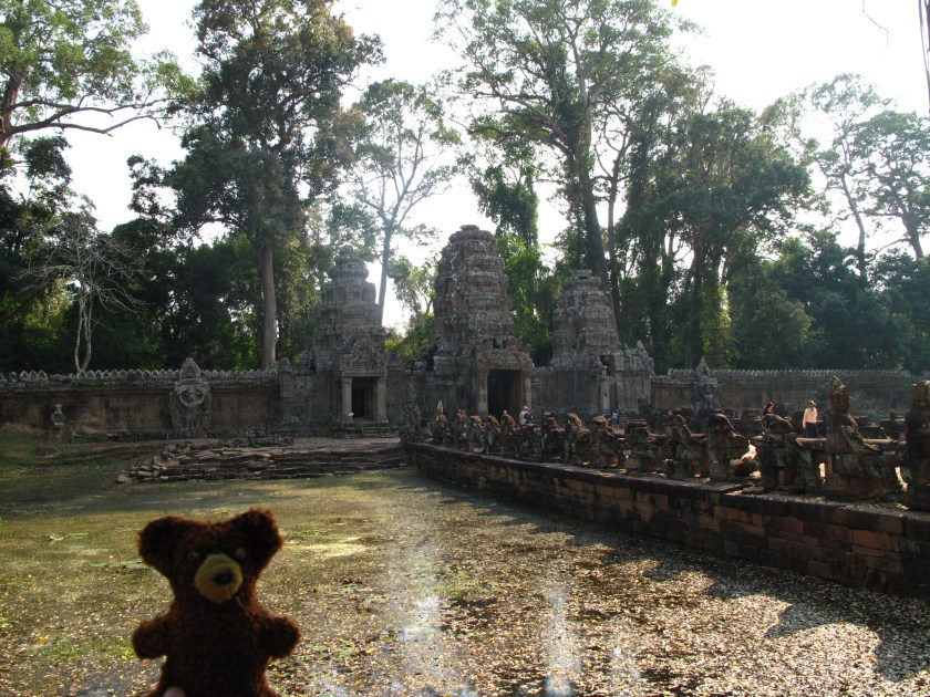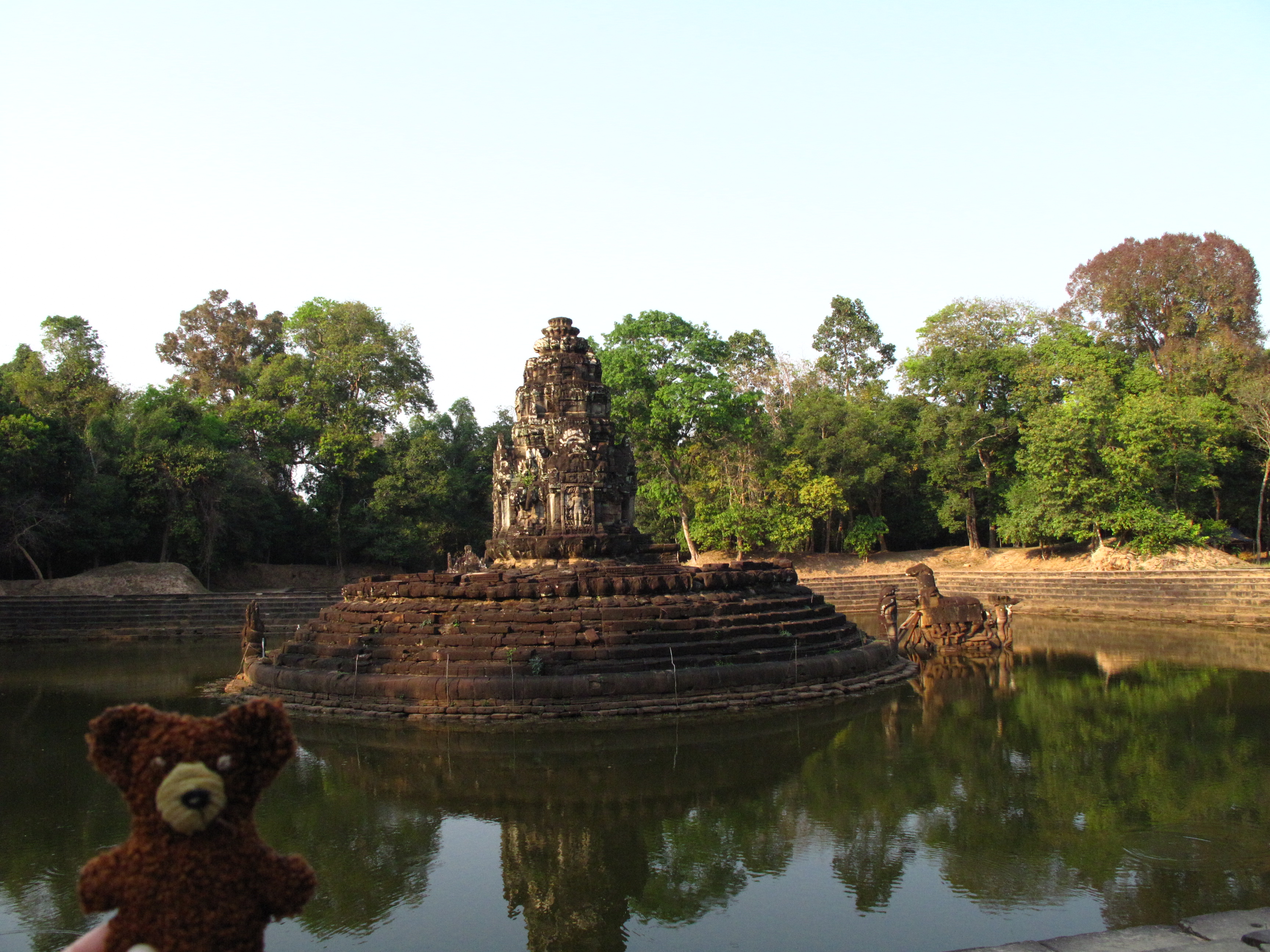Und ab gehts zum nächsten Tempel, dem Neak Pean. In der Mitte dieses Wassertempels befindet sich ein Heiligtum, dass eine Lotusknospe darstellt, in der sich ein meditierender Buddha befinden soll. Am Rand dieser „Insel“ stehen zwei siebenköpfige Nagas, die dem Tempel den Namen geben. Neak Pean bedeutet „Sich windende Schlange“.