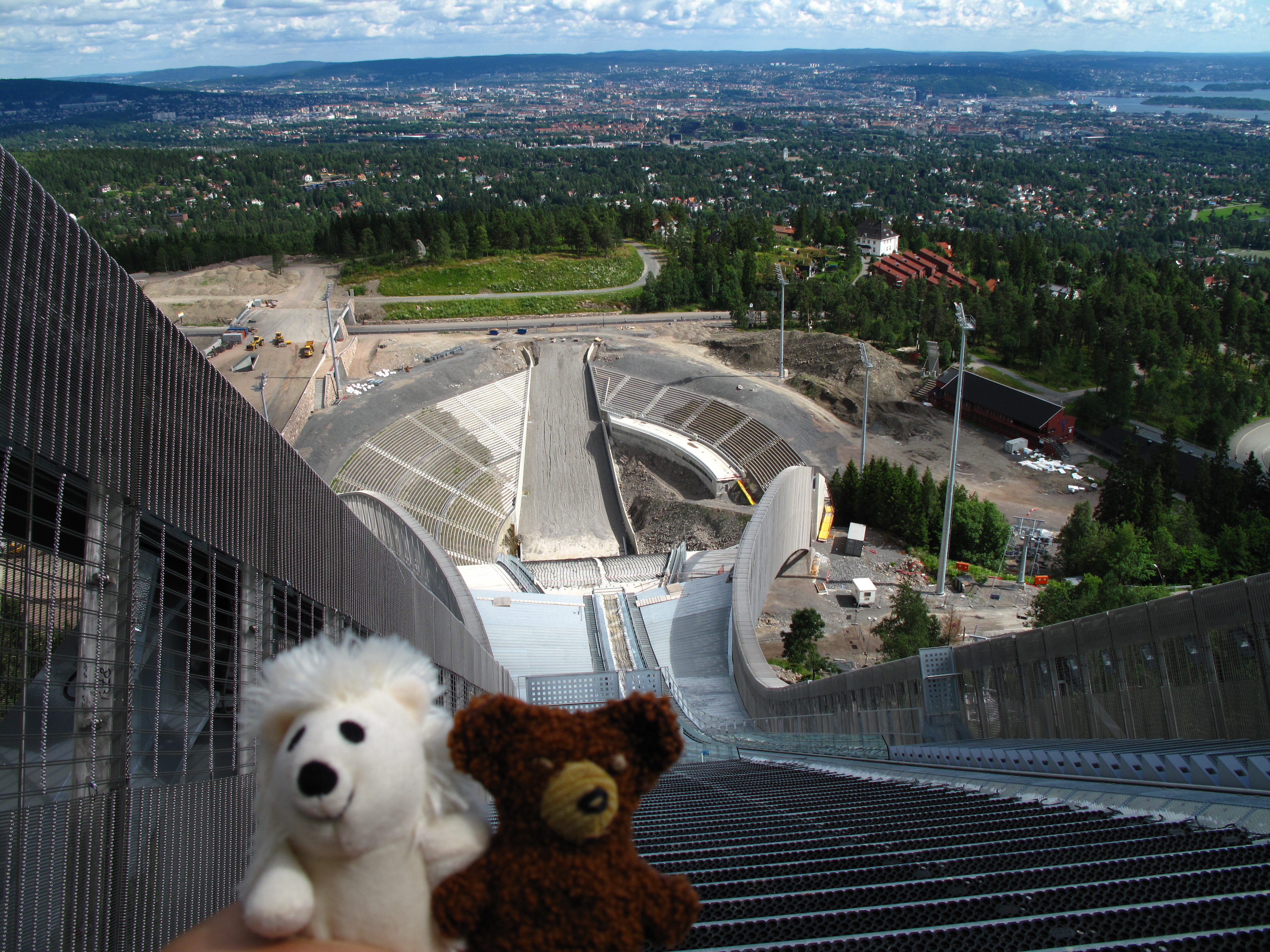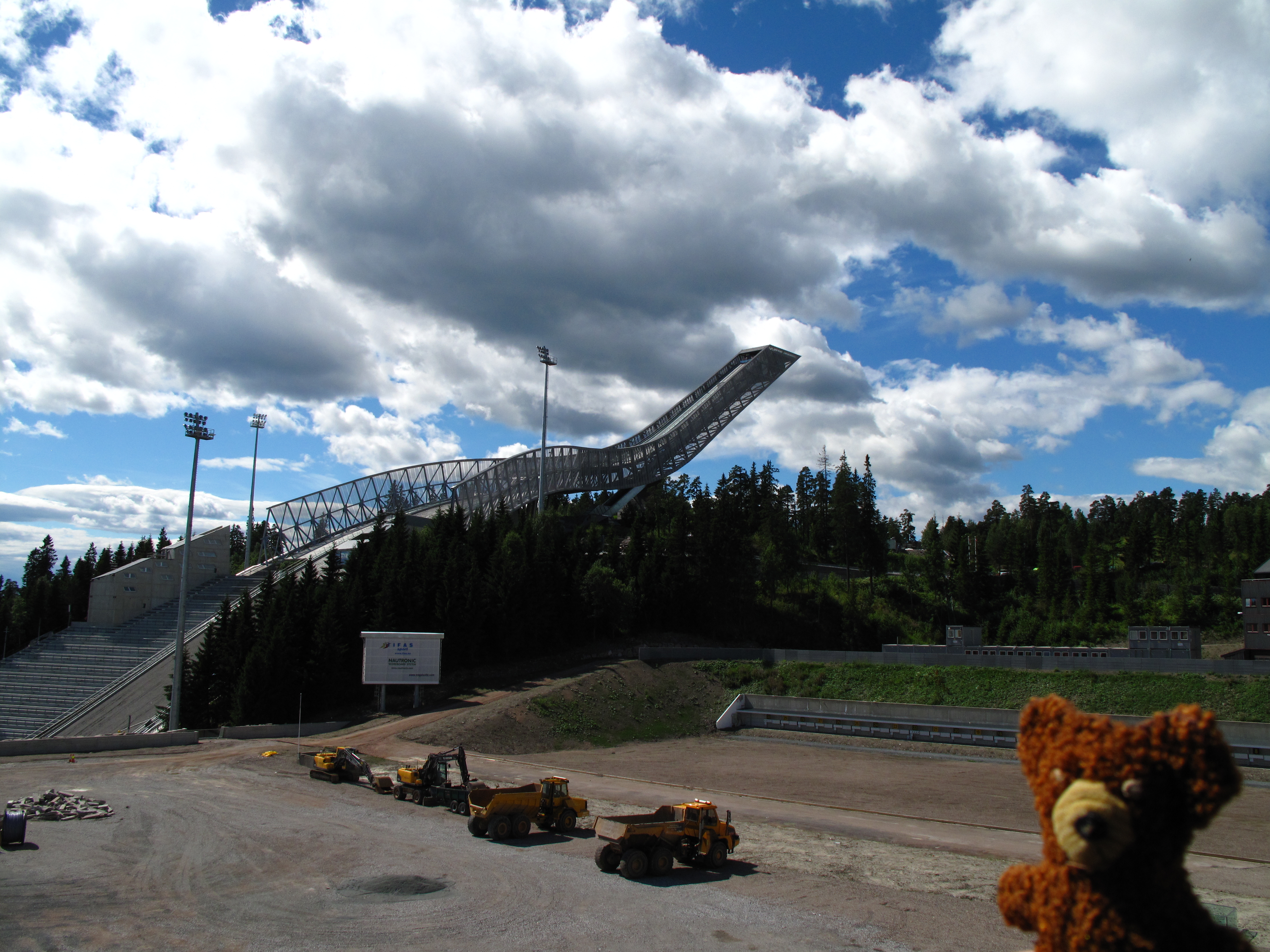 Für den nachfolgenden Trip in luftige Höhen deckten wir uns noch mit lecker Nudelsalat und Rosinenbrötchen ein. Ab gings mit dem Bus auf den Holmenkollen. Die neue Skisprungschanze ist echt toll, im Winter sieht man dann sicher auch die Baustelle nicht mehr.