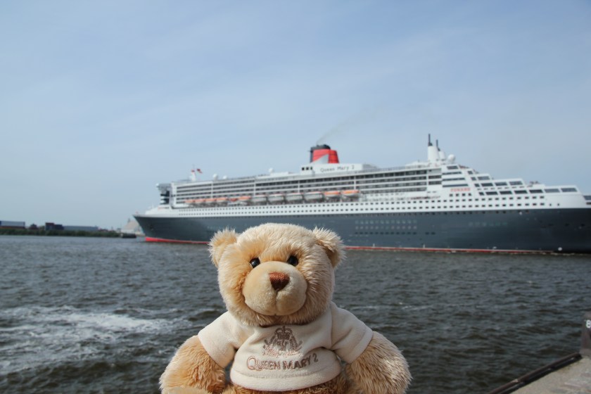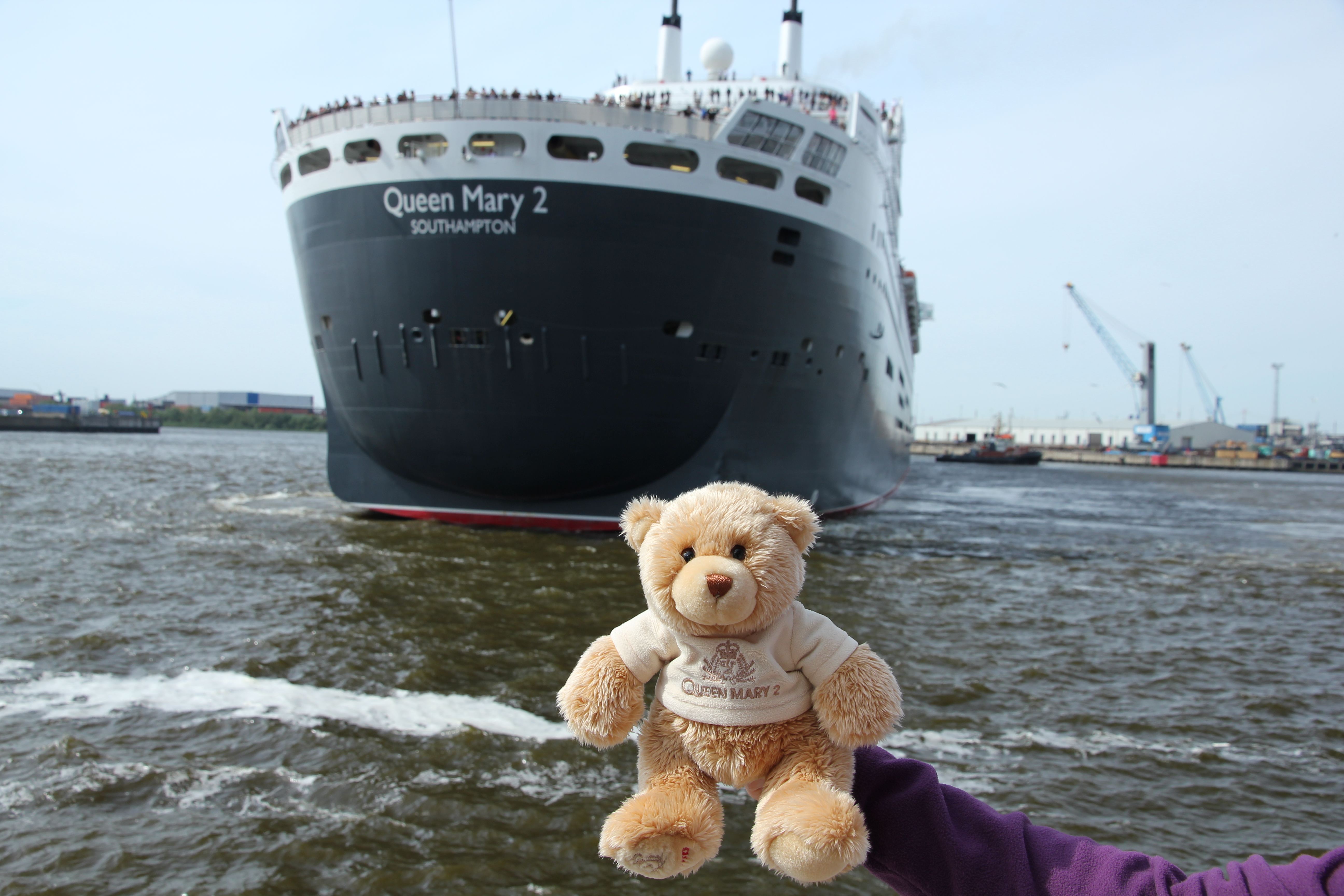 So, nun zurück zum vor Vorfreude platzenden QM2-Bär. Um 10 Uhr rum begaben wir uns zum Cruise Terminal in der HafenCity zu Hamburg. Kurz darauf konnte man schon von Weiten das laute Tuten hören und die riesigen Schornsteine sehen. Und dann erschien der Kolos und musste sich zum Anlegen um 180° drehen. An dem reich besuchten Pier hatten wir uns eine ideale Aussichtsposition gesucht um dem imposanten Wendemanöver zu zuschauen. Selbst QM2-Bär hatte das noch nicht gesehen à war ja sonst immer auf dem Schiff.