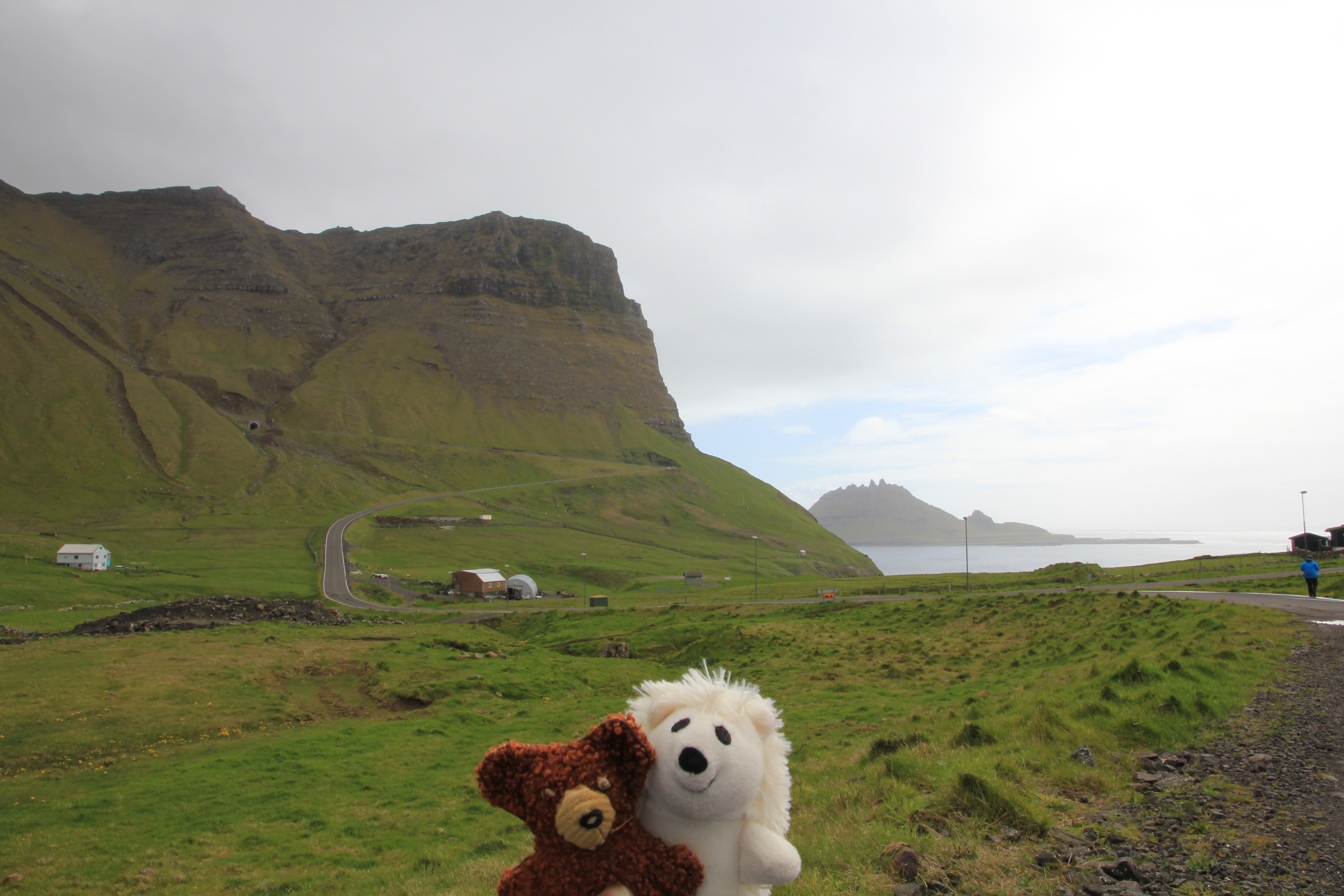 Zum Glück kamen wir auch auf dem Rückweg wieder gut durch den eben erwähnten Tunnel. Wir hielten kurz an einem der schönsten Aussichtspunkte an. Im Hintergrund sieht man die kleinen Inseln Tindholmur mit seinen 5 burgartigen Zinnen und den flachen Gasholmur.
