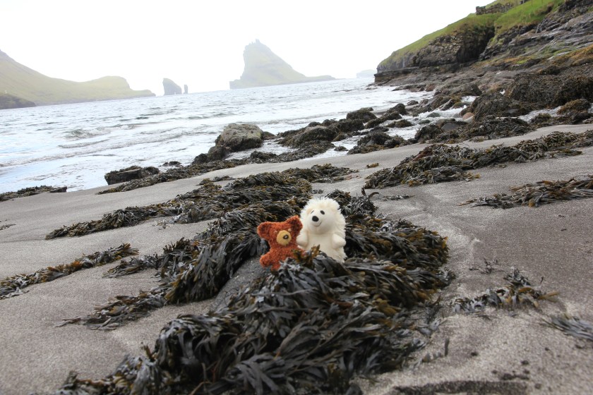 Am Strand hat man ebenfalls eine tolle Aussicht auf das Sörvagsfjord. Im Hintergrund sind wieder die Insel Tindholmur und die beiden freistehenden Felsen Dranganir, die die Form eines Portals bilden, zu sehen.