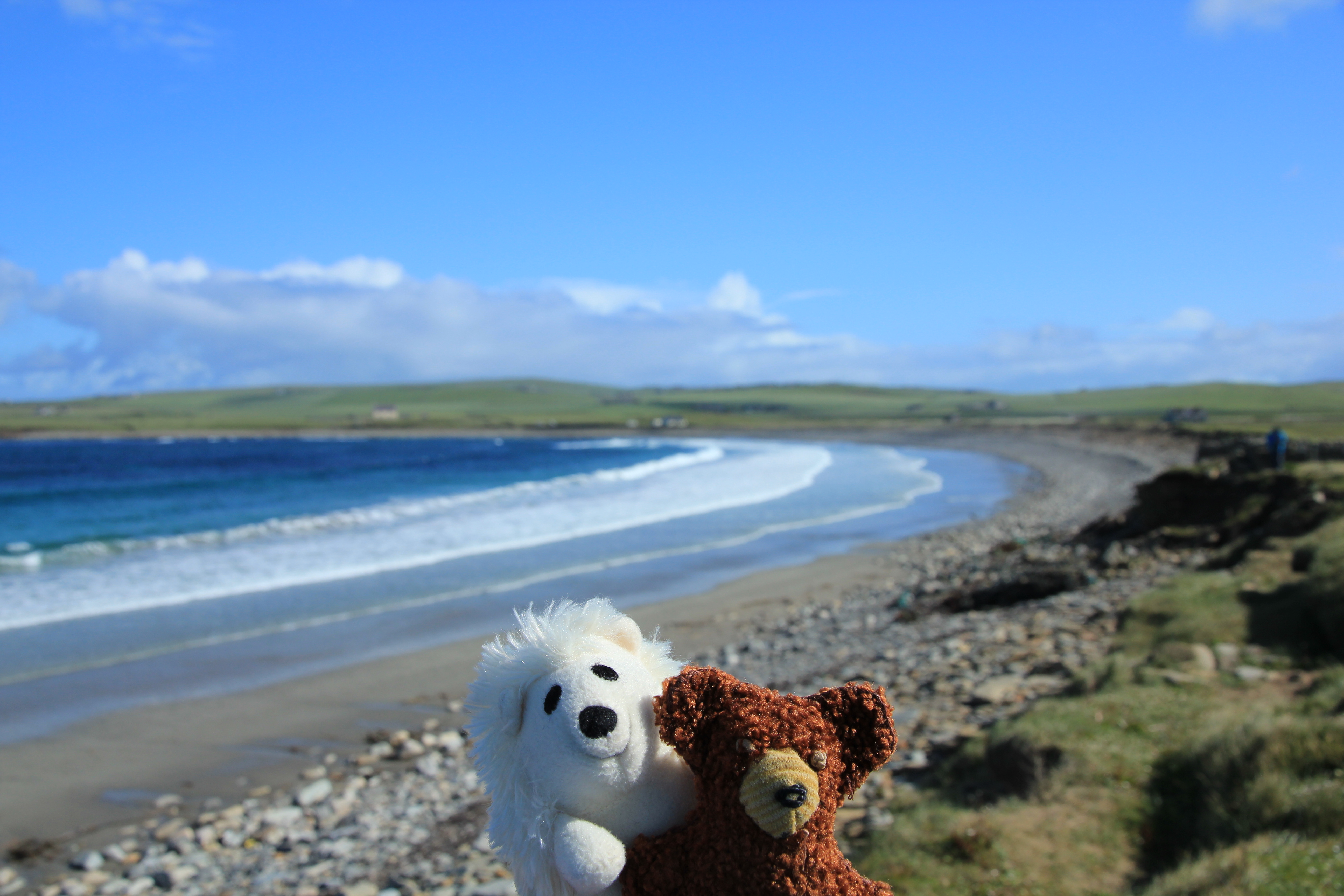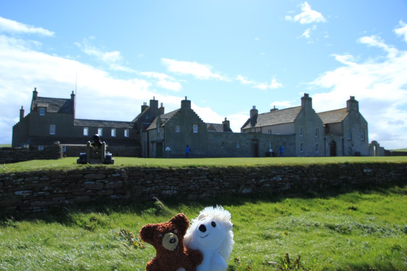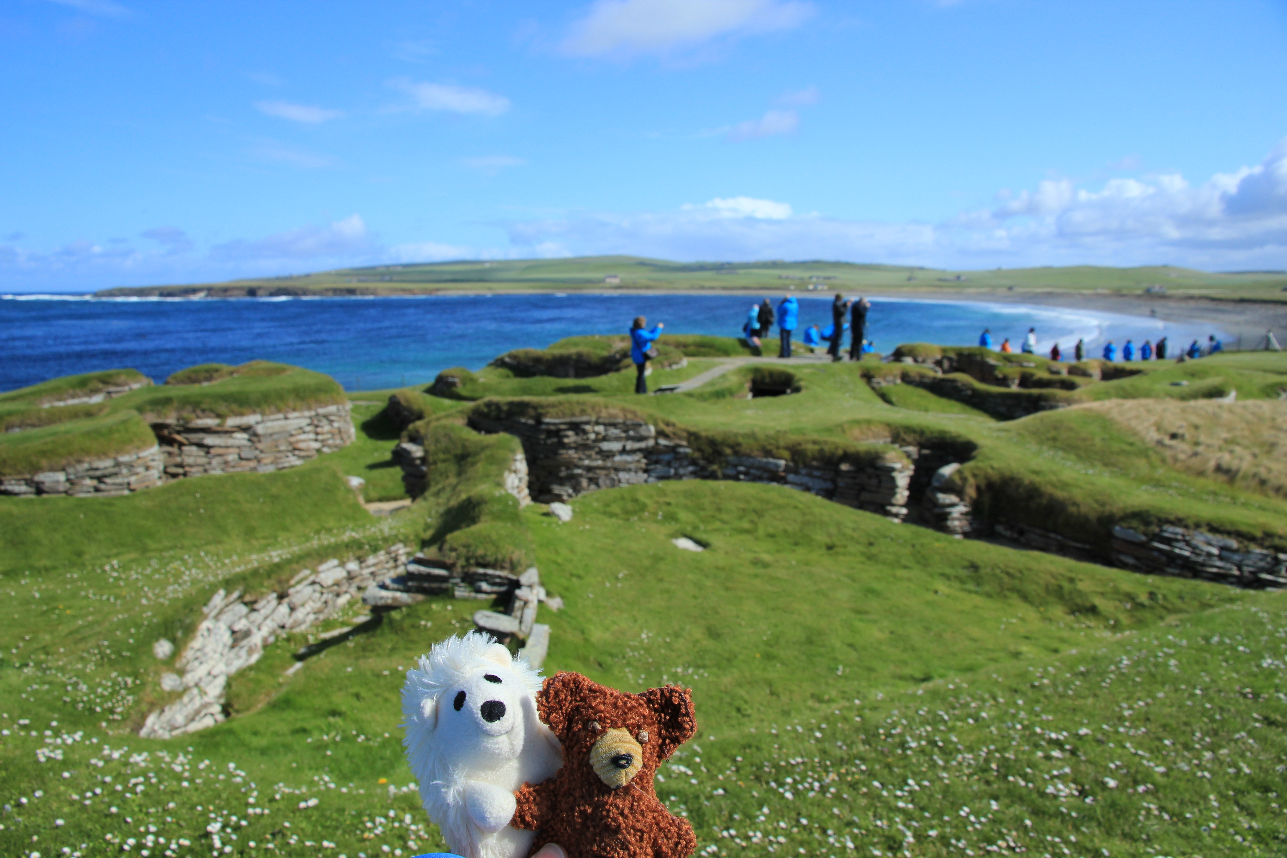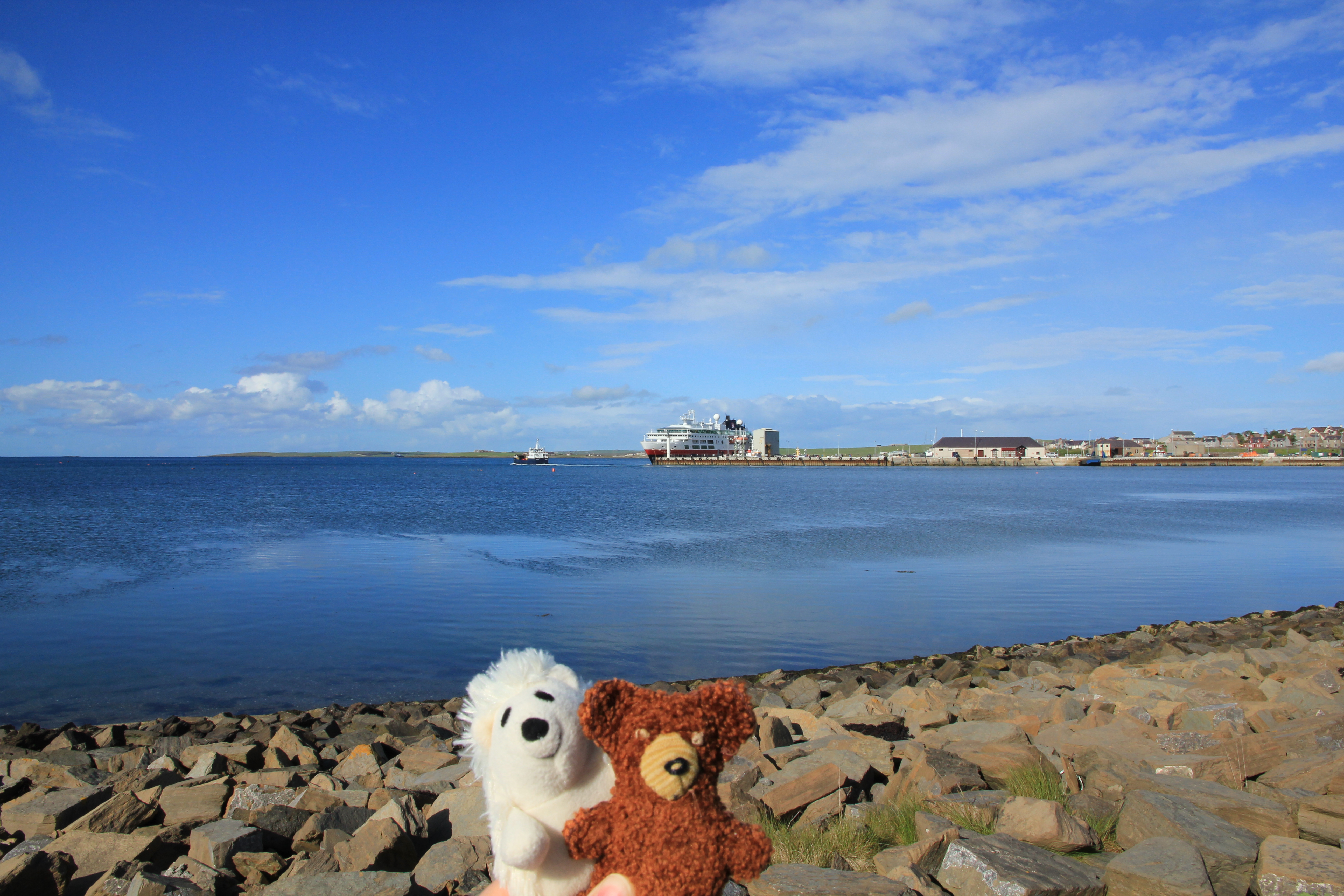 Meine plüschigen Begleiter und ich hatten es wieder geschafft den Wettergott zu überzeugen, so dass heute die Sonne mal wieder alles überstrahlte . Heute waren wir auf den Orkney-Inseln, ein aus 67 Inseln bestehendes Archipel nordöstlich von Schottland. Die rund 20.000 Bewohner leben hauptsächlich auf der größten Insel namens Mainland und davon die Meisten in der Hauptstadt Kirkwall, wo auch wir anlegten. Unsere 13 Stunden Landaufenthalt teilten wir in einen Ausflug am Vormittag und eine Privattour am Nachmittag auf. Die nette ausgewanderte Fränkin namens Melanie führte uns mit vielen Informationen durch die Highlights von Mainland. Die Route ging entlang der Nordküste Scapa Flow (dem berühmten Marineankerplatz), über Moorlandschaften und vorbei an vielen grünen Feldern auf denen Schafe und die Aberdeen Agnes Kühe weiden.