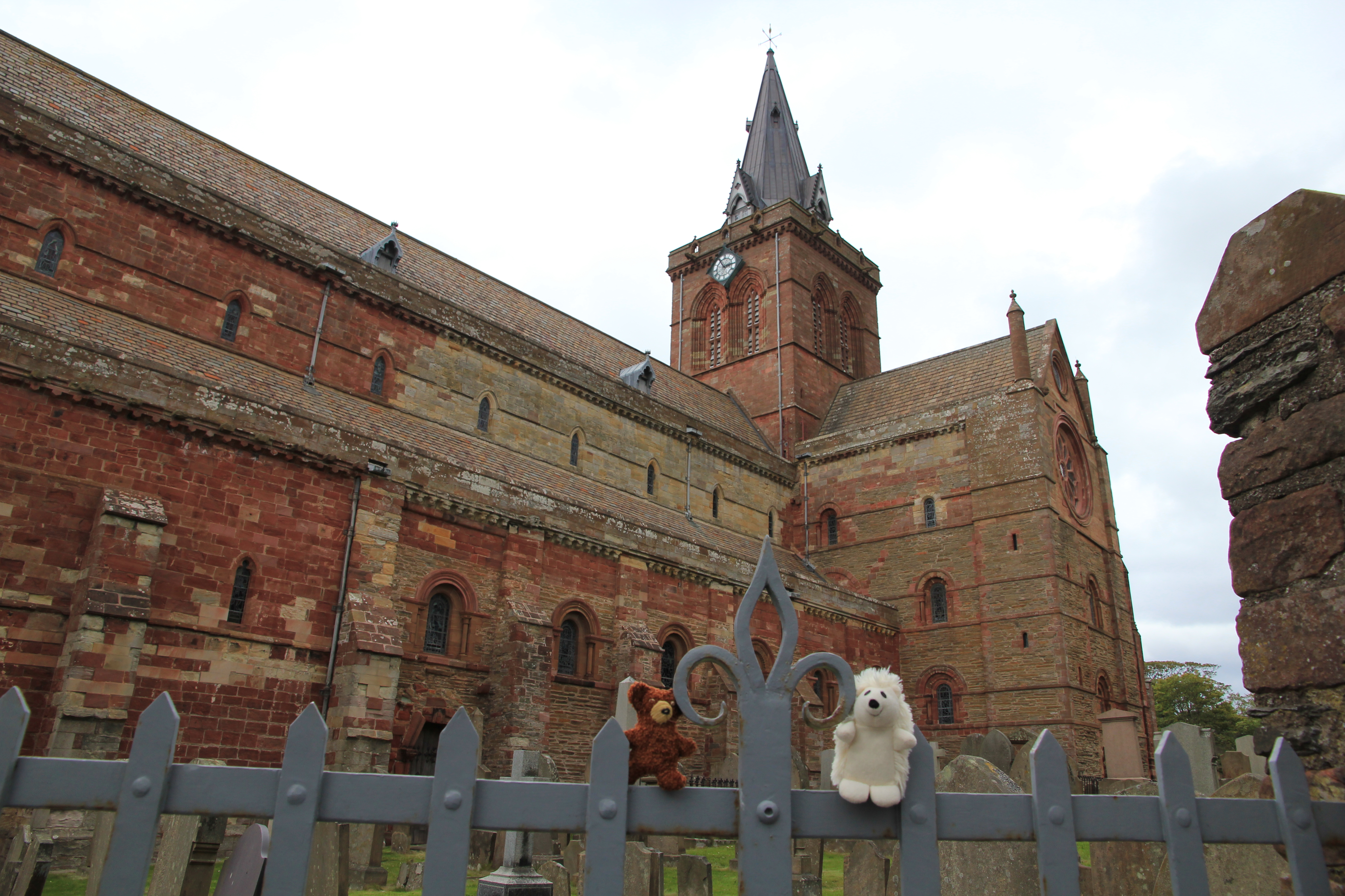 Zurück am Schiff legten wir noch einen kurzen Stopp beim Buffet ein um gestärkt unseren Rundgang durch Kirkwall zu starten. Von weiten ragt die große rotbraune St. Magnus Cathedral über alles hinweg. Im Jahr 1134 wurde mit der Grundsteinlegung durch Graf Rognvald mit dem Bau zu ehren seines Onkels begonnen. Dieser ist ein heiliggesprochener Märtyrer.