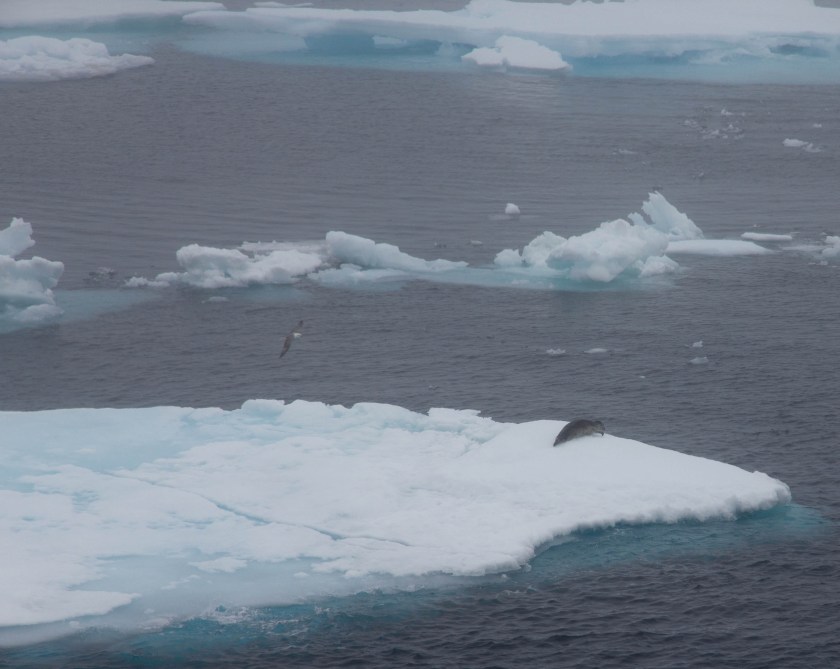 Und so ganz nebenbei kam dann auch noch eine faule Robbe auf einer Eisscholle dahergeströmt. Hat die kein zu Hause? (Der kleine graue Fleck auf der Eisscholle):