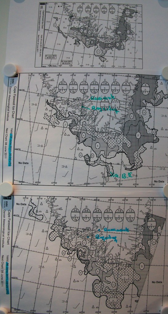 Kurz nach dem Frühstück wurde die Anlandung offiziell abgesagt. Aufgrund der dicken Eisdecke und dem dichten Nebel hatten wir in der Nacht zu viel Zeit verloren. Um den Passagieren ein besseres Bild der Lage zu verschaffen, wurde uns anhand von Eiskarten (Quelle: DMI) die aktuelle Situation erklärt. Anhand der Eiskarten vom 3., 5. und 6. Juni kann man die Wanderung des Eises sehen. Innerhalb von drei Tagen hat sich die Eissituation im Kap Farvel drastisch geändert.