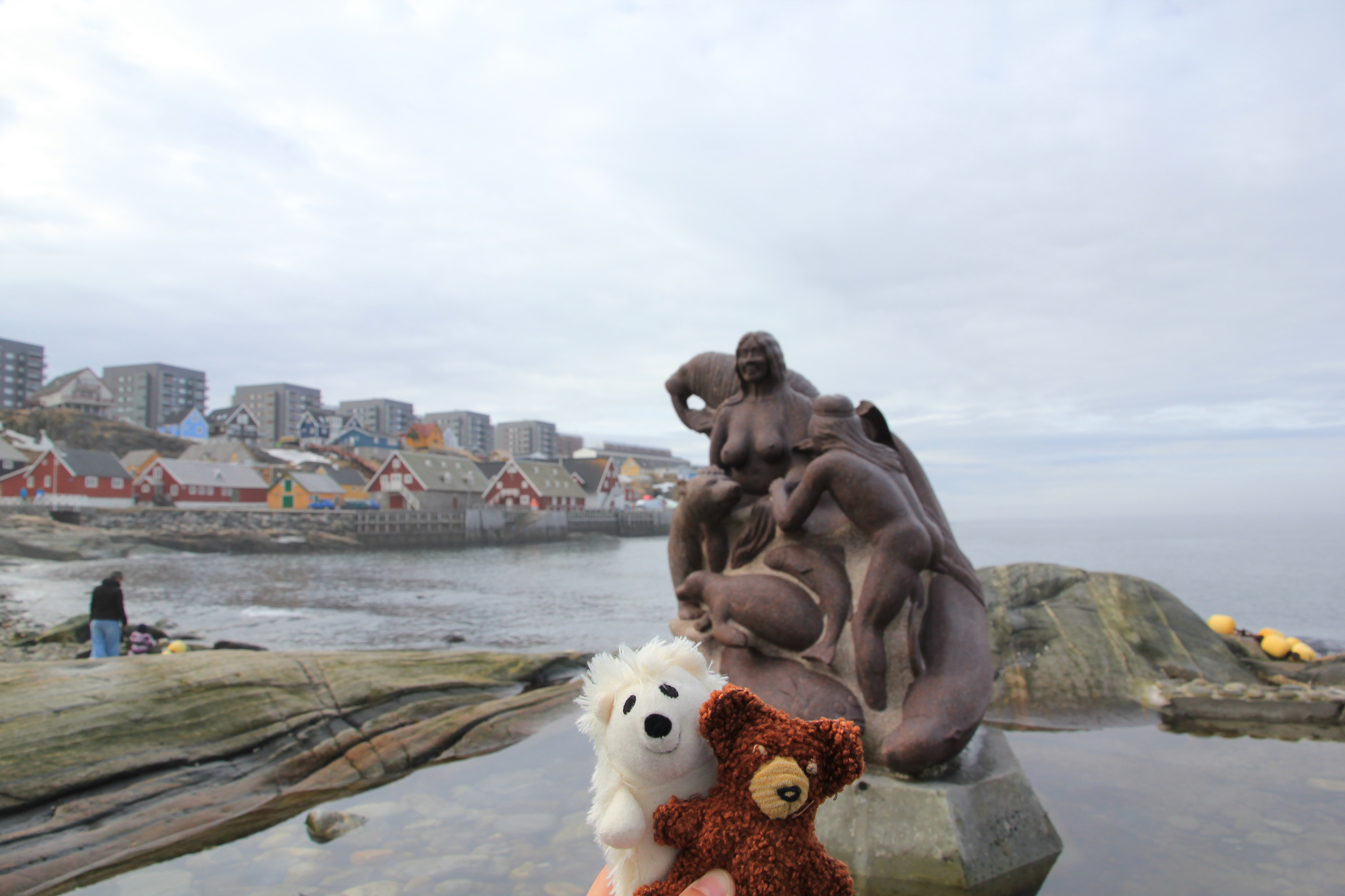 Unten am Wasser steht die „Mutter der Meere“. Sie ist umgeben von Eisbären, Robben, einem Wal, Seehunden, Delfinen und einem Walross. Also von allen Tieren des Meeres.