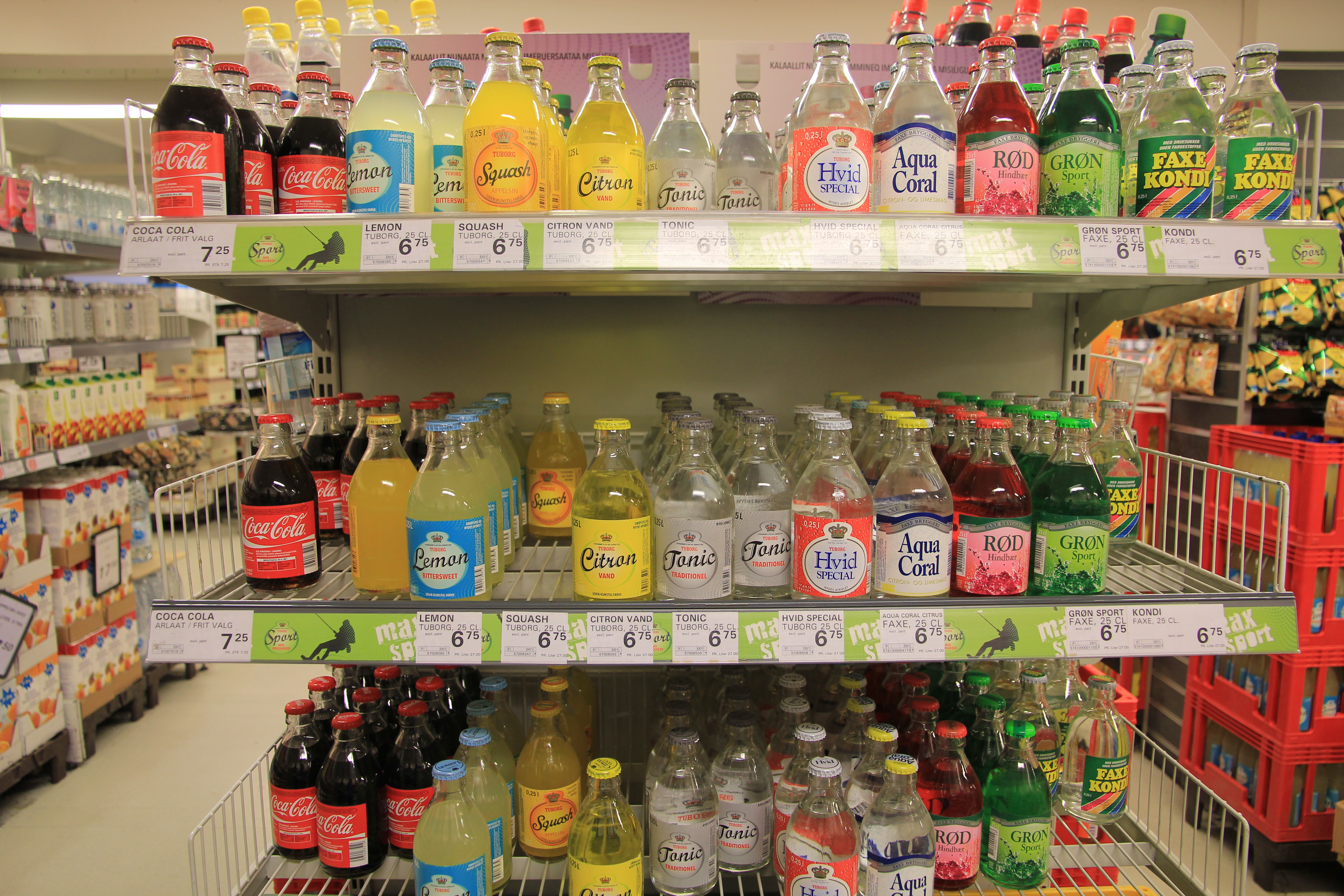 Im Anschluß an so viel Kultur sind wir noch etwas durch das moderne Zentrum von Nuuk geschlendert und haben unsere Postkarten eingeworfen. Natürlich durfte ein Besuch des großen Konsumparadieses nicht fehlen. Die füllen ihre Limo in süßen Fläschchen ab 🙂