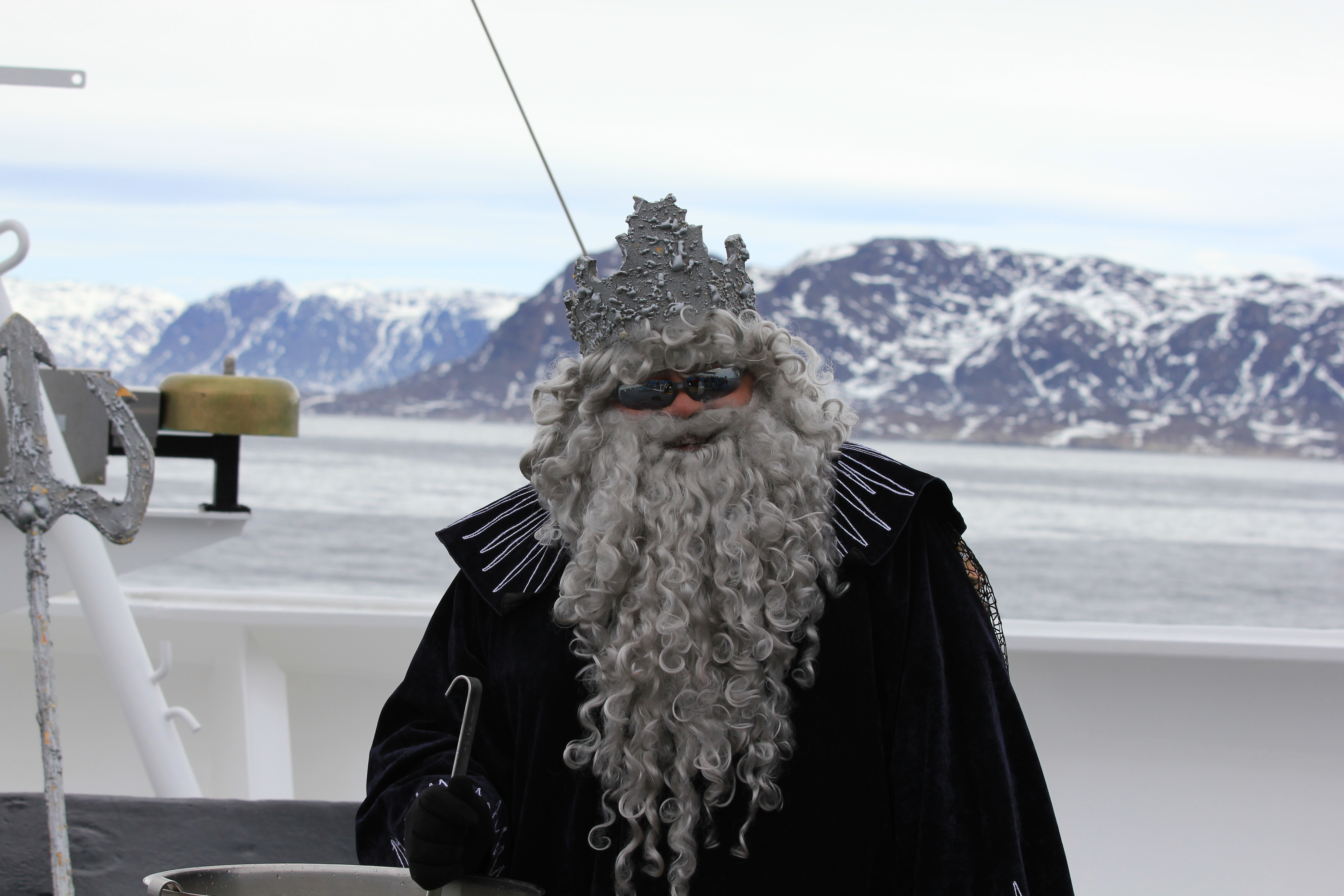 Bevor wir unser heutiges Anlandungsziel erreichten war es endlich soweit: Neptun persönlich verabreichte mutigen Passagieren und genötigten Crewmitgliedern eine kalte Eiswürfeldusche *hehe*. Eisigel und ich haben uns erfolgreich versteckt und sind trocken geblieben. Hier ein Bild vom Mann mit der Eiswürfel-Schöpfkelle kurz nach der Überquerung des Polarkreises.