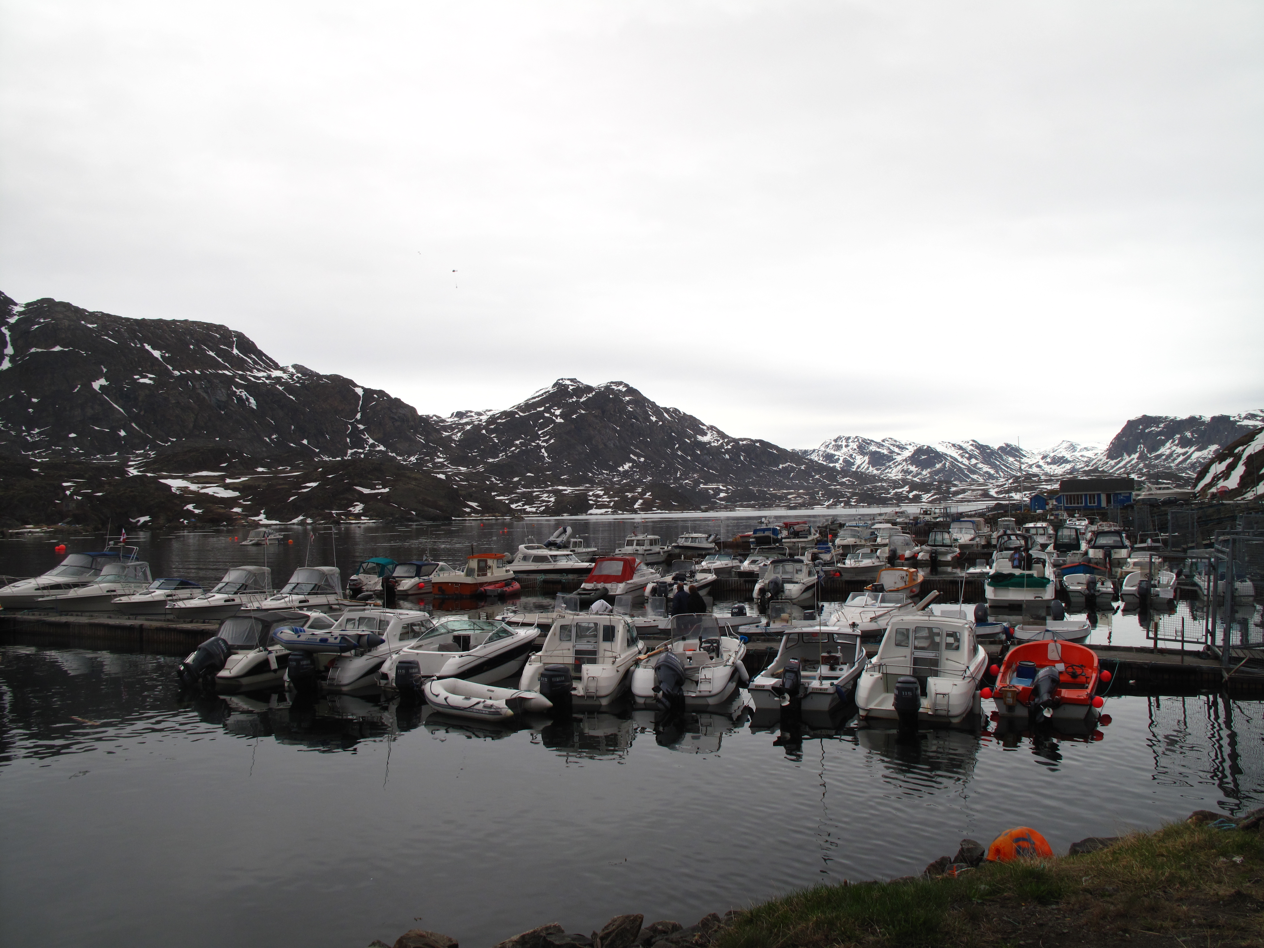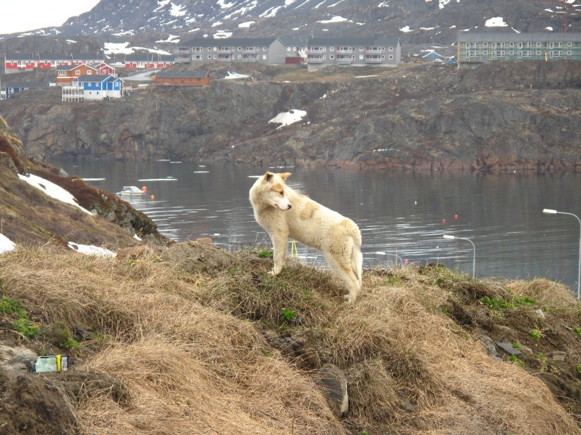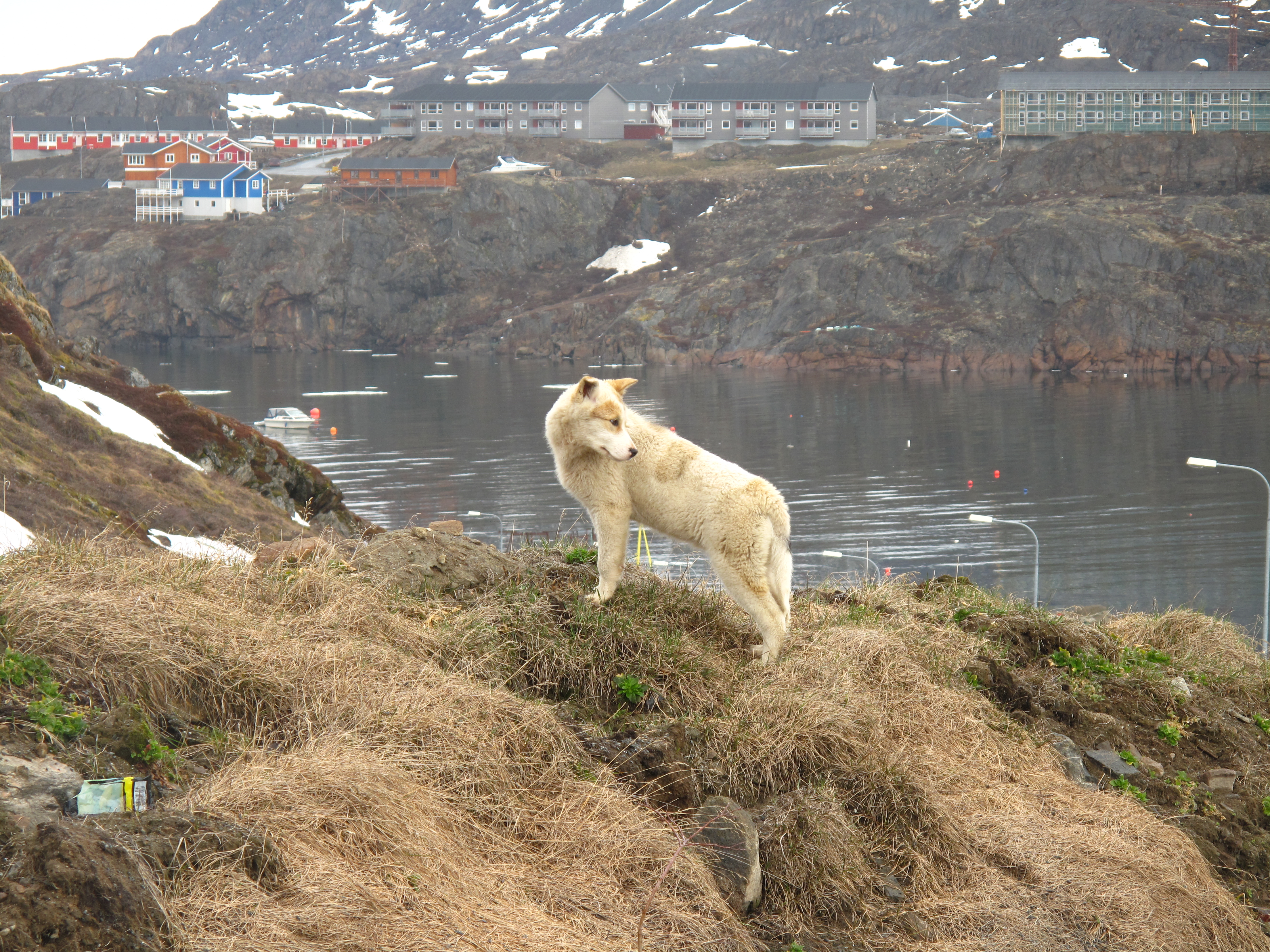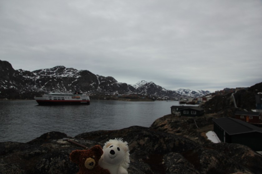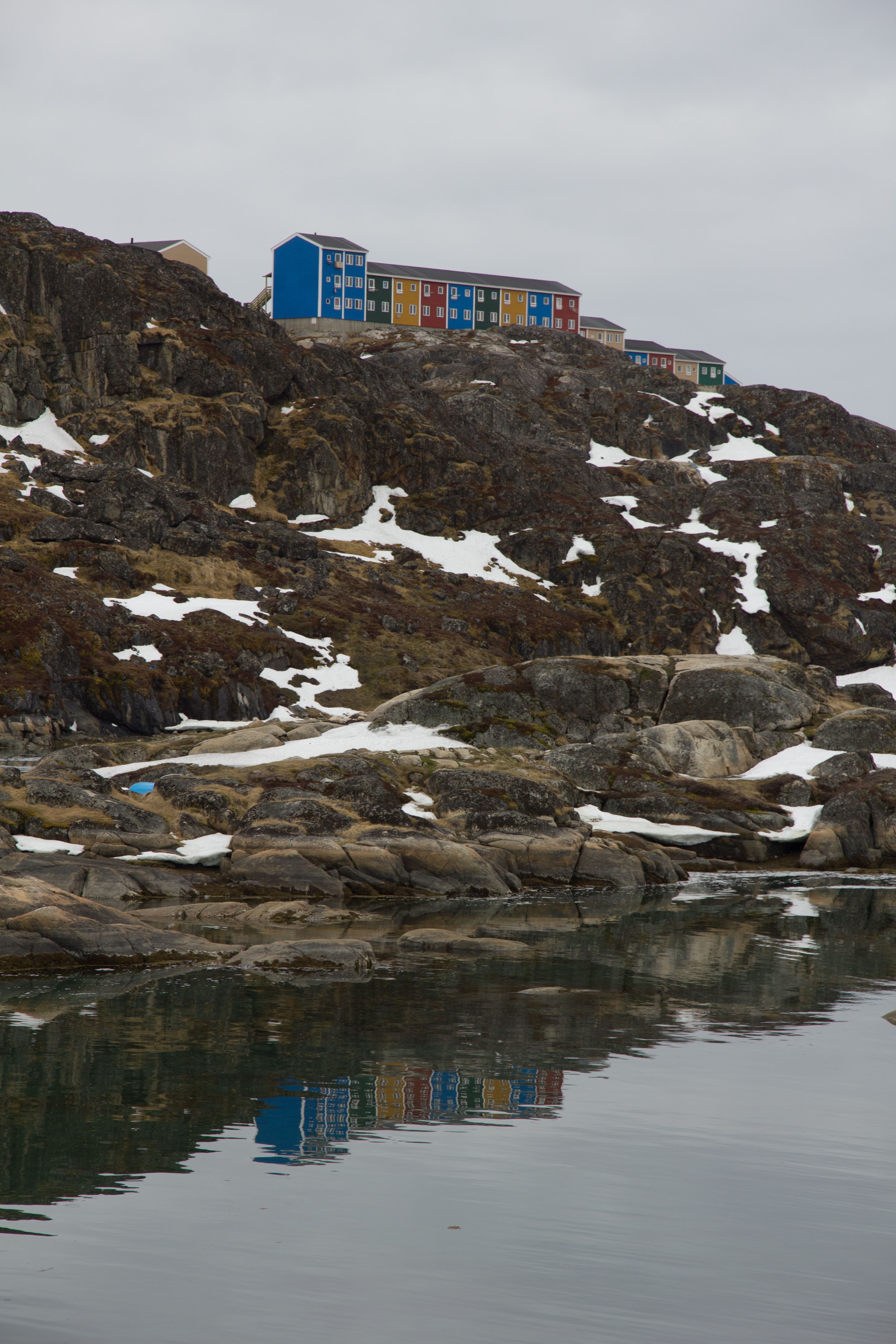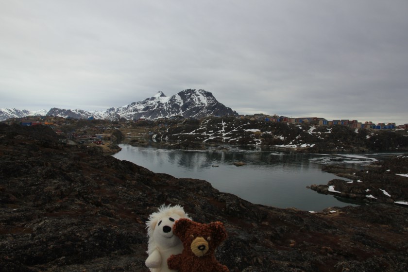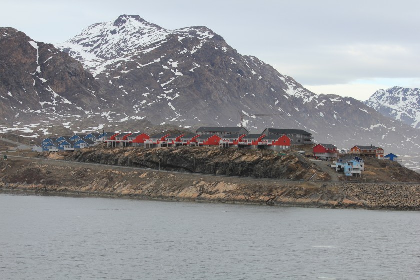 Im Hintergrund sieht man den Hausberg Nasaasaaq, der 784 Meter hoch ist und der Form nach einer Kapuze eines Frauenanoraks gleicht. Die Inuit haben früher ihre Kinder auf den Schulter mit unter der Kapuze getragen :-).