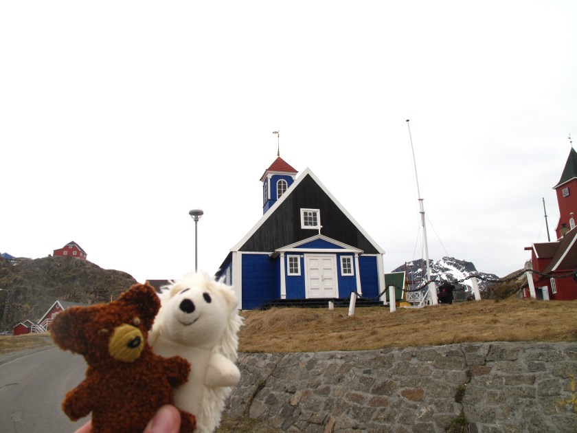 Nach so viel Wanderung erreichten wir den steilen Anstieg vom Hafen hinauf zum Kolonialzentrum. Wir dachten ja noch die Anja will uns verschaukeln, aber Hossa, zum Glück habe ich noch genug Muckies in den Beinen. Auch hier steht wieder eine schöne bunte Kirche mit einem Walunterkiefer als Eingangstor. Der dazugehörige Grönlandwal wurde 1901 tot im Fjord vor der Stadt gefunden. Ob da ein gutes Zeichen ist? Bei der Berthel-Kirche handelt es sich um die älteste Holzkirche Grönlands. Eigentlich wurde die Kirche 1773 aufgebaut. Da die Holzfracht aber einen Winter in Norwegen festsaß, konnte sie erst im Januar 1775 eingeweiht werden.
