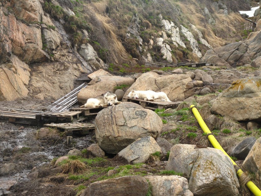 Die Hauptstraße führt weiter steil den Berg hinauf. Hin und wieder kommt man an den Hundeplätzen vorbei, wo die Schlittenhunde im Sommer rumlungern. Diese Grönlandhunde dürfen nur nördlich des Polarkreises gehalten werden.