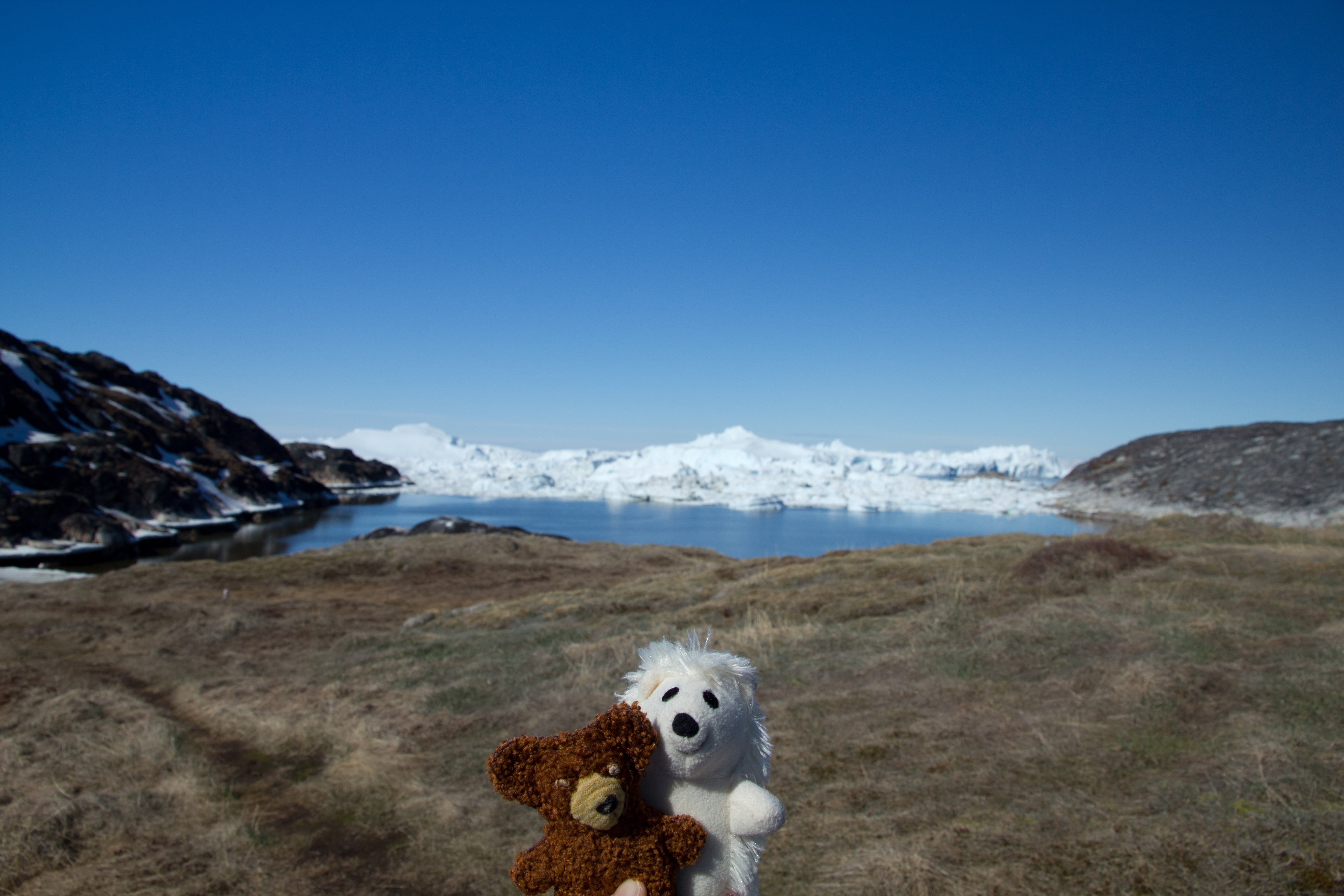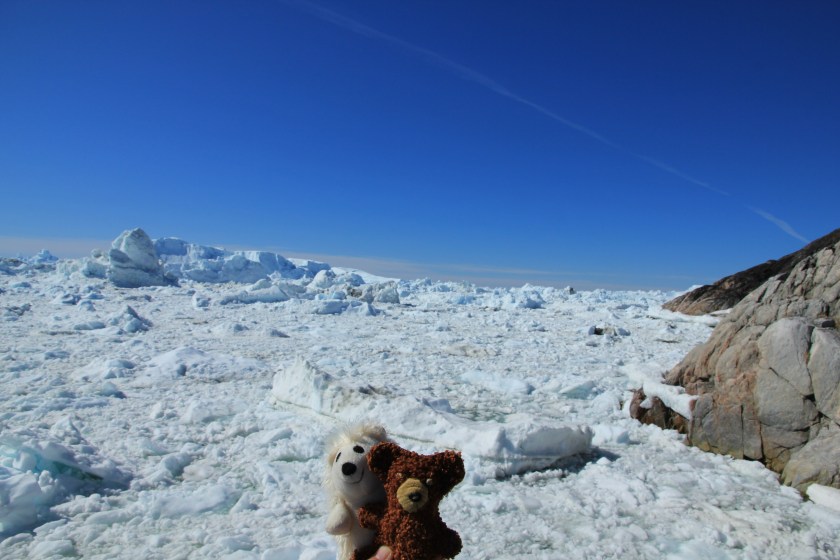 Mit den Polarcirkelbooten sausten wir an Land und warteten auf den Janus um unsere Wanderung nach Sermermiut zu starten. Dies ist ein Siedlungsplatz ganz in der Nähe vom Eisfjord. Aber eigentlich wollten wir ja wegen dem Eisfjord Kangia dahin. Die Wanderung führte quer durch die Stadt Richtung Süden. Beim ehemaligen Heliportplatz endete die Straße, wo auch ein riesiger müffelnder Grönlandhundeplatz war. Über einen schönen Holzsteg ging es weiter hinab durch das Naturschutzgebiet Richtung Eis :-). Nach kurzer Zeit tauchten die weißen Giganten am Horizont auf. Wildes Kamerageknipse umsäuselte meine Teddyohren.