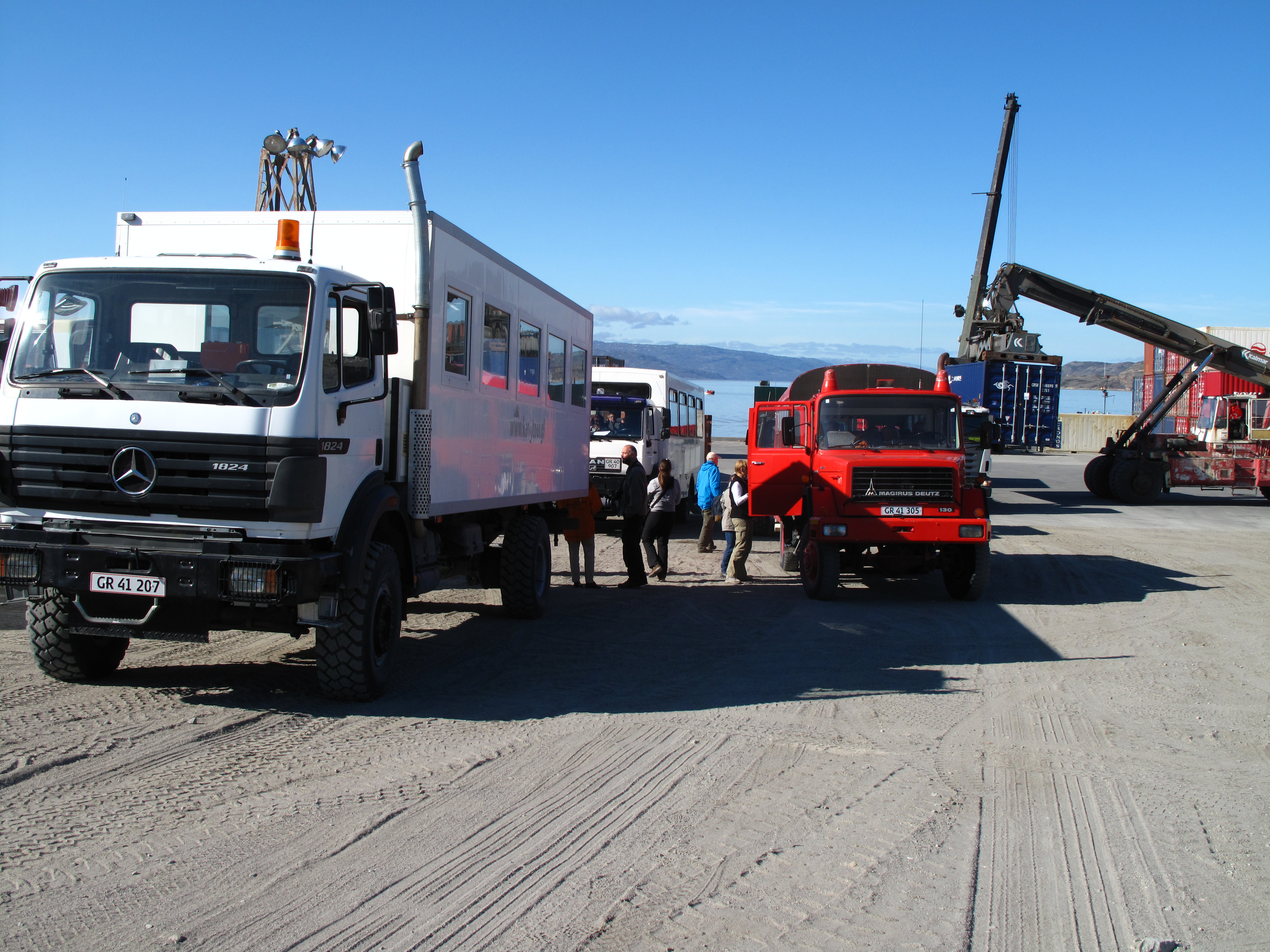 In Grüppchen und mit Schwimmweste bewaffnet wurden wir mit den Polarcirkelbooten an Land gebracht. Das Gepäck hatten wir vorher schon an Bord bei Air Greenland abgegeben. Nur mit unserem Handgepäck ausgerüstet, wechselten wir den fahrbaren Untersatz. Mit absolut coolen 4×4-Schlitten gings die längste am Stück befahrbare Straße Grönlands in Richtung Stadt.
