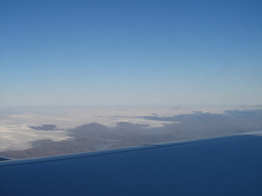 Und dann war es soweit: Die bösen grönländischen Monstermücken schwärmten aus in Richtung Grillplatz wo die Passagiere nichts ahnend ihr Grillfleisch verspeisten :-). So ein blödes, ehlendes …. Vieh hat mich doch tatsächlich in die Tatze gestochen. Die dicke Beule wird mich noch Tage begleiten. Also, nichts wie weg hier und auf zum Flughafen. Nach kurzer Wartezeit und strenger Sicherheitskontrolle nahmen wir unseren Fensterplatz ein. Während des Fluges hatte man eine schöne Aussicht auf das gewaltige Inlandeis.