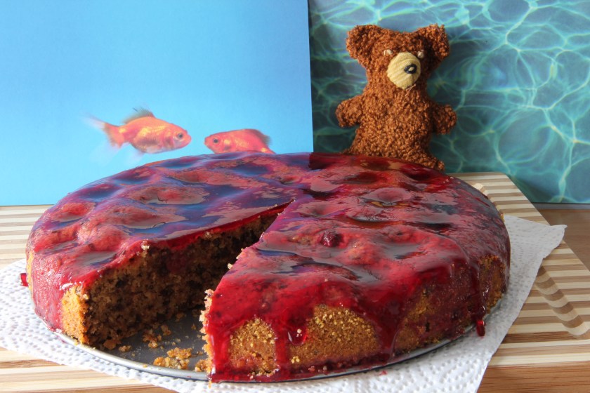 Jetzt den Tortenguß nach Anweisung mit dem Kirschsaft zubereiten und auf dem abgekühlten Kuchen verteilen :-). Das Ganze etwas stehen lassen und danach genießen.