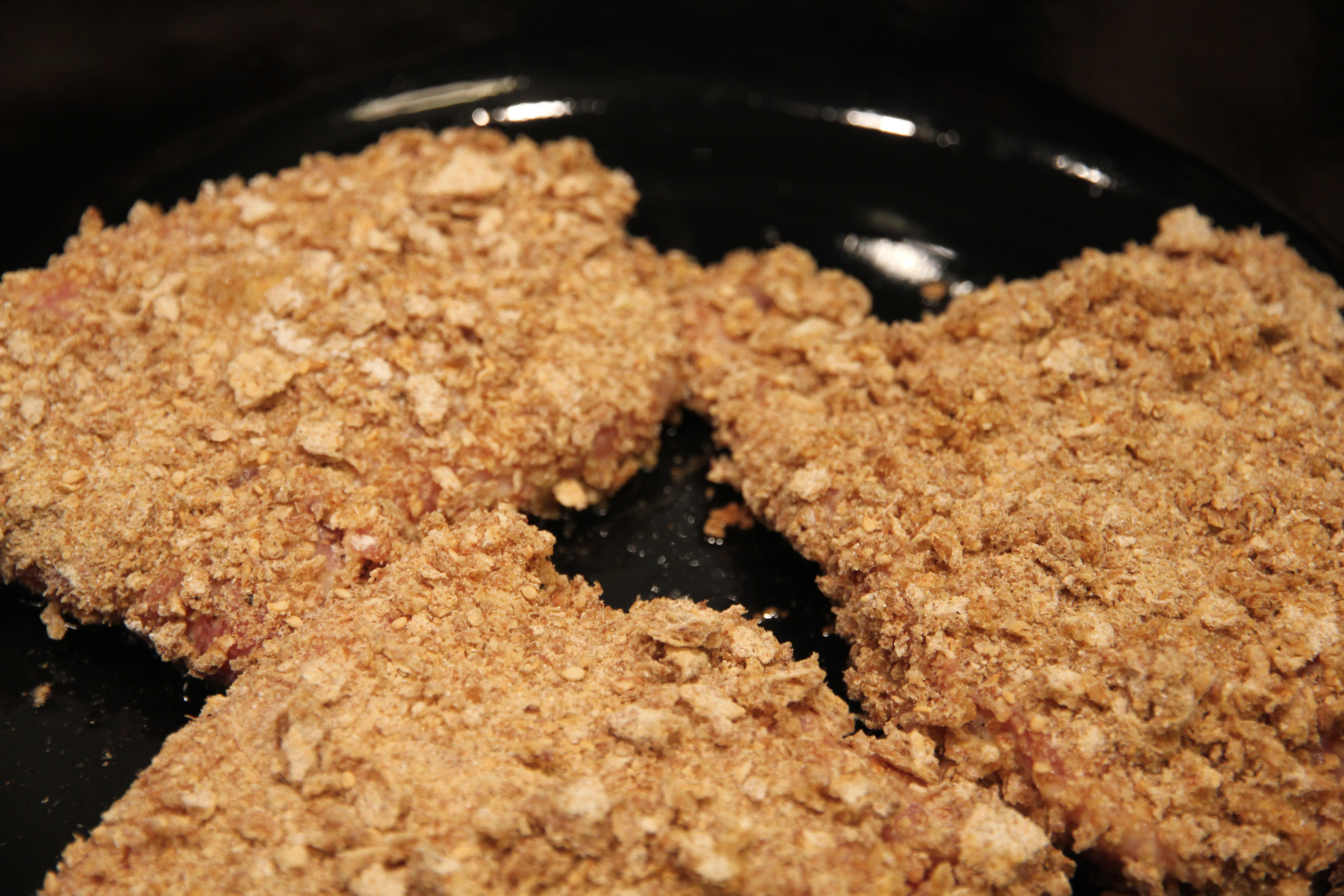 Für die gefüllten Schnitzel das Sesamknäckebrot in einem Beutel kleinschlagen. Zum Panieren der Schnitzel einen Teller mit dem Mehl, einen mit den Bröseln und einen weiteren mit einem Ei-Milch-Gemisch anrichten. Die Schnitzel in der Mitte längs einschneiden und mit der Teewurst bestreichen. Jetzt noch die klein geschnittenen Backpflaumen auf die Teewurstschicht legen und das Schnitzel wieder zuklappen, anschließend noch pfeffern und salzen. Danach die gefüllten Schnitzel panieren (Mehl -> Ei -> Brösel) und in einer heißen Pfanne von jeder Seite 5 Minuten goldbraun anbraten.