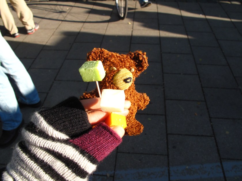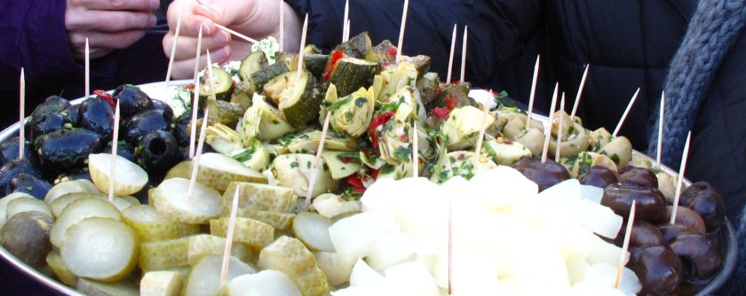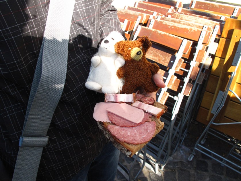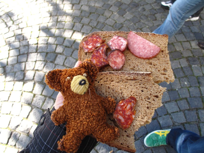 Eisigel und ich hatten uns extra zum Frühstück dezent zurückgehalten :-). Nach ein paar einleitenden Worten von unserer Markt-Führerin schlängelten wir uns vorbei an einem Bäckerstand, wo wir drei große Tüten Brot in Empfang nahmen, weiter zum Fleisch / Wurststand. Begleitet von interessanten Erzählungen zum Markt probierten wir unterschiedliche Wurstsorten.