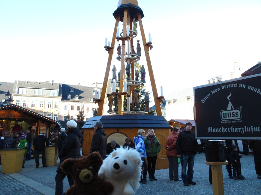 Am Sonntag kauften wir uns einen schönen Herrnhuter Stern und machten uns dann auf den Weg ins Erzgebirge nach Annaberg-Buchholz. Dies ist eine landschaftliche schöne Strecke, mit Schnee wärs noch schöner gewesen :-). Hier gabs auf dem kleinen Weihnachtsmarkt noch mehr Auswahl an erzgebirgischer Schnitzkunst.