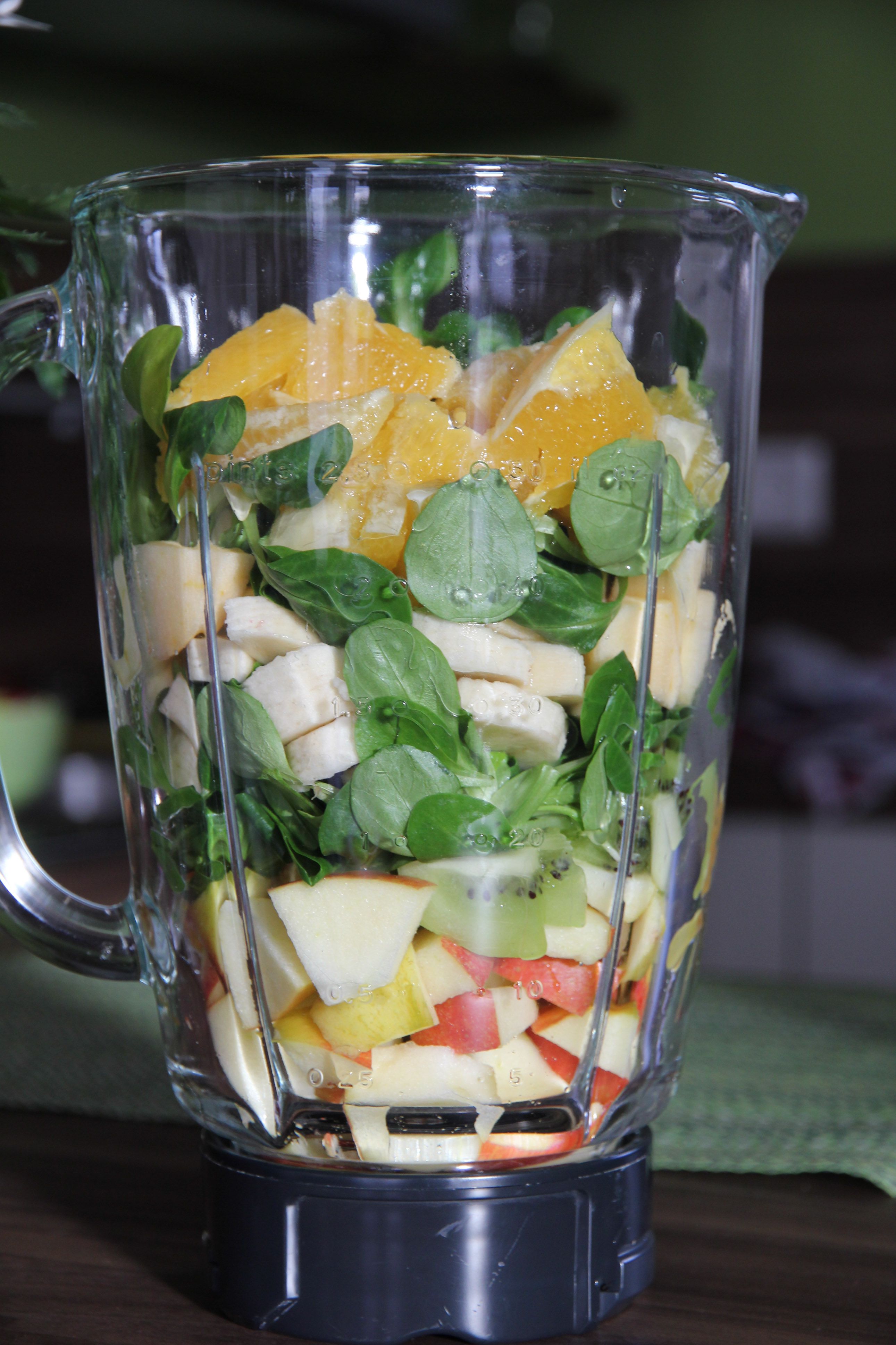 Die Orange, Kiwi und die Banane schälen und klein schneiden. Den kleinen Apfel ebenfalls klein schneiden und den Feldsalat kurz abbrausen. Das Ganze ab in den Mixer.