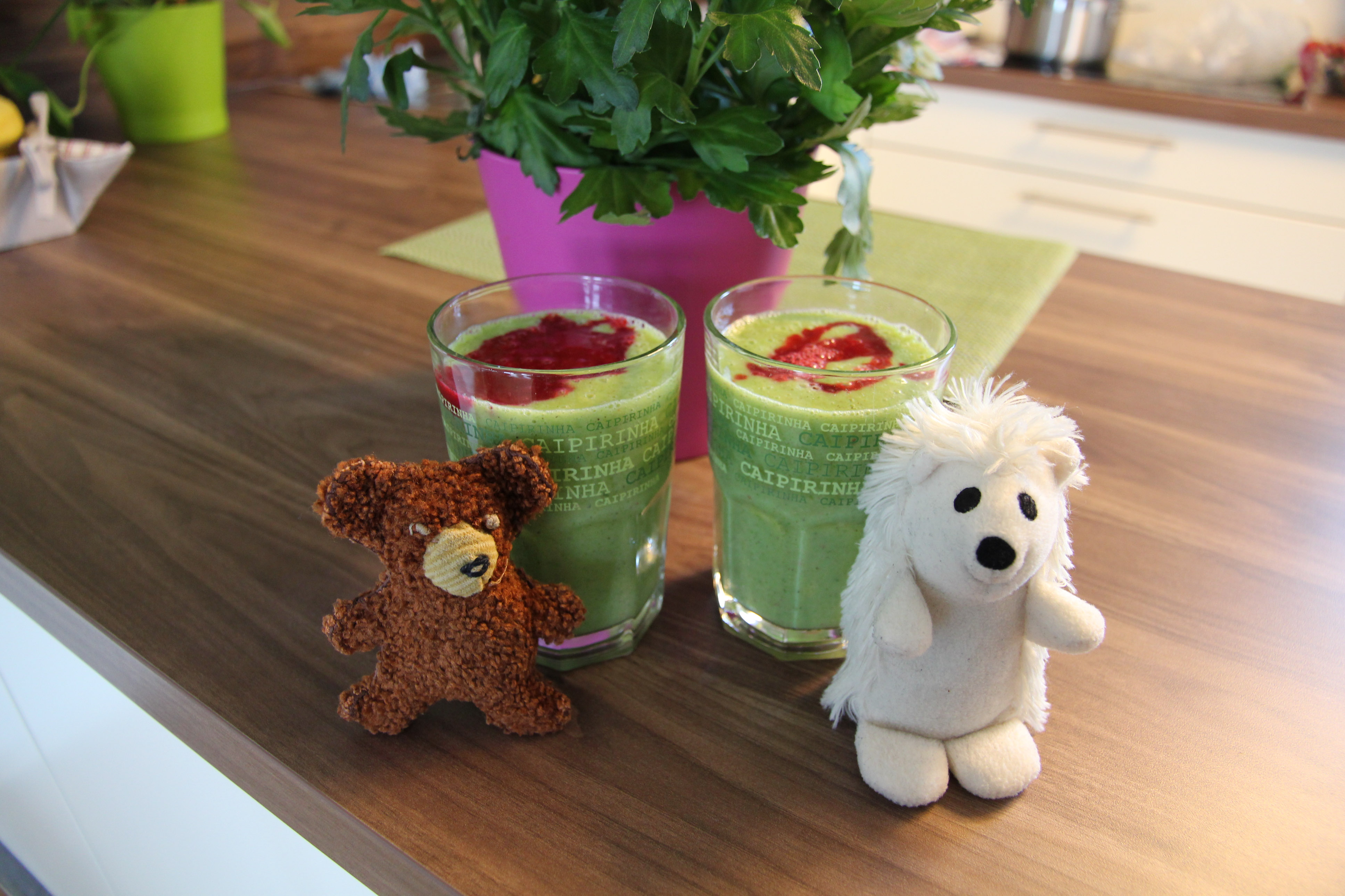Den fertig pürierten Smoothie in Gläser füllen und oben drauf das Himbeerpüree geben.