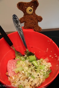 Da ich außer dem Koriander und der Minze leider keine anderen Kräuter hatte, hab ich mir mit Petersilie, klein gerupftem Salat und gewürfelten Paprikastückchen beholfen. Das ganze Grünzeug habe ich dann mit den Nudeln zusammen angerichtet. Zum Schluß noch die Bratlinge obedendrauf und das Ganze zusammen mit der selbstgemachten Fischsauce servieren.