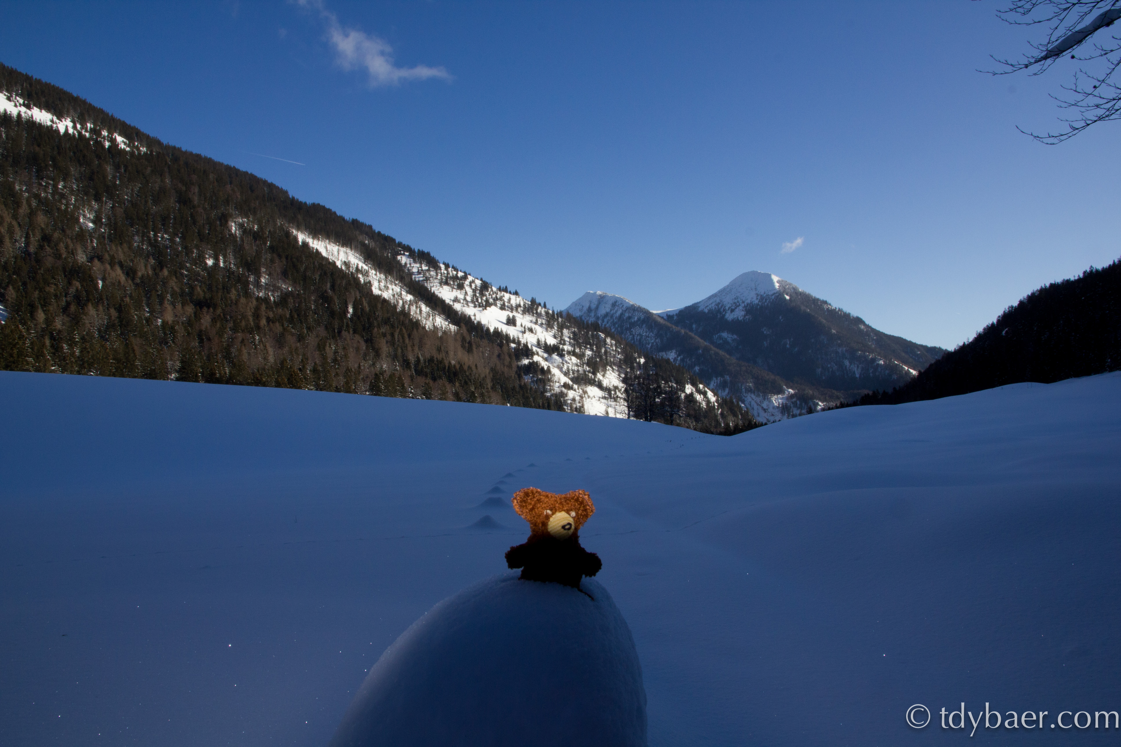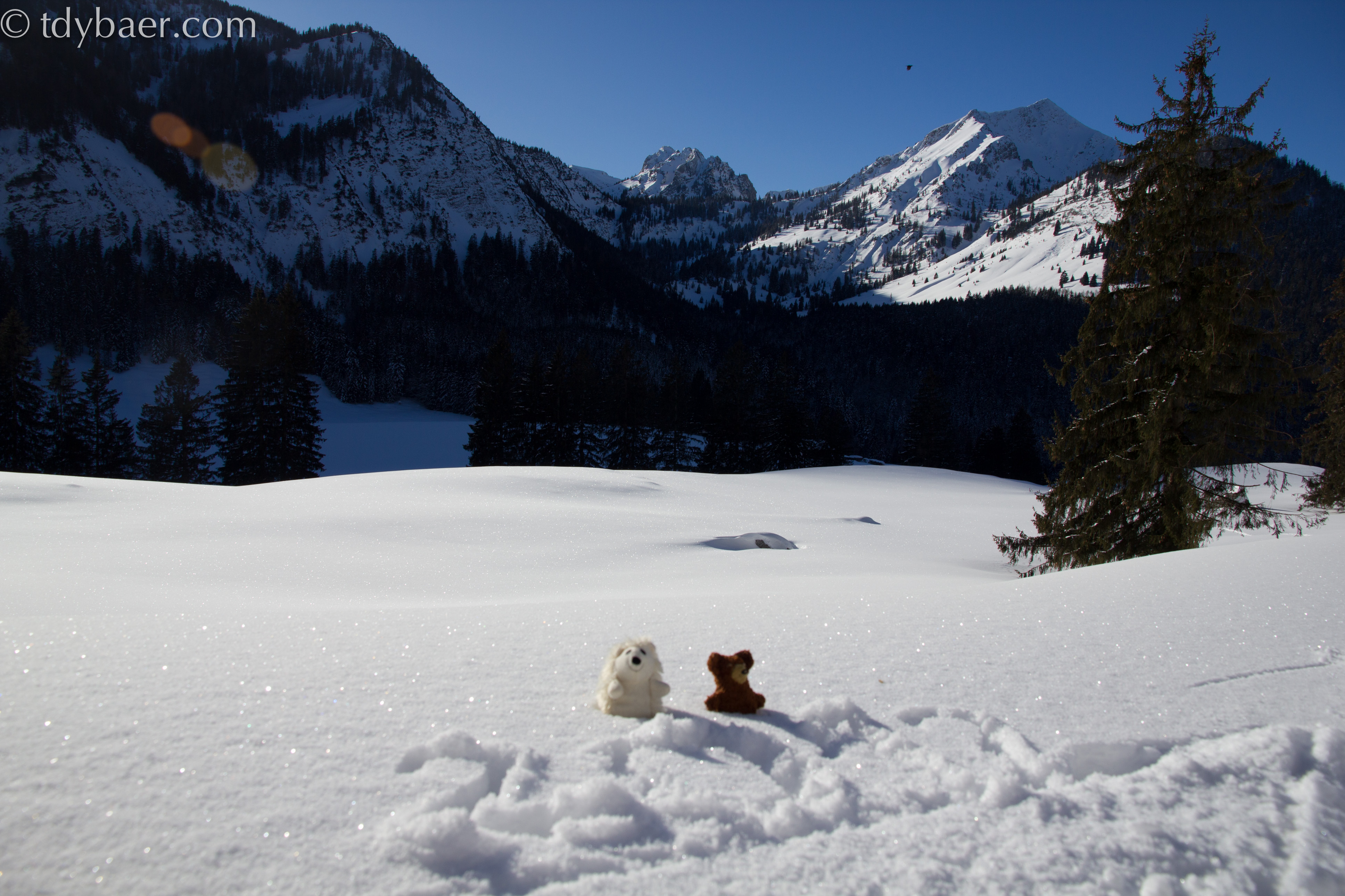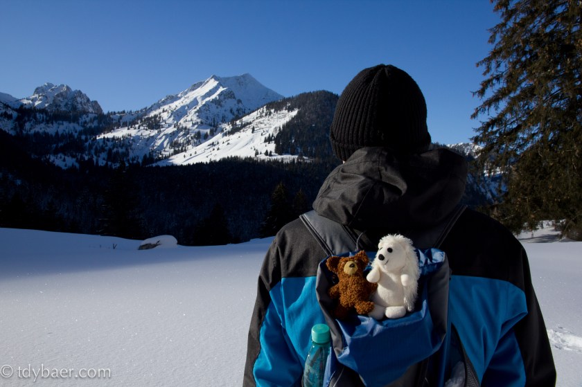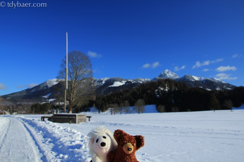 Liebe Freunde des Tdy Baers. Der erste Ausflug in diesem Jahr führt mich in die verschneiten Alpen zu den Schlierseer Bergen. Unser Ziel für heute war der Seeberg bei Bayrischzell. Um dem großen Ski-Ausflugsverkehr zu entgehen, machten wir uns früh los. Gegen 10 Uhr nach einer knappen Stunde Autofahrt stellten wir unser Reisemobil am Parkplatz des Segelflugplatzes von Geitau ab. Endlich Schnee unter den Tatzen 🙂 aber auch bibberkalt. Entlang des Segelflugplatzes erreicht man nach ca. 2km den Aufstieg zum Seeberg. Bis dorthin hat man einen schönen Blick auf den Wendelstein (die Bergspitze auf 1 Uhr *g*).