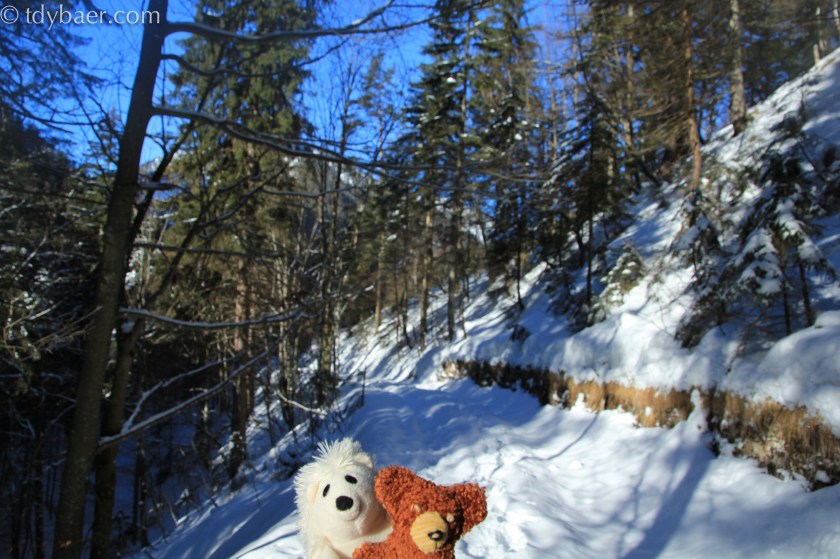 Im Wald nehmen wir bei der Schranke den linken Weg bergauf. Und schon geht das Schneegestapfere los. Bis dahin war der Schnee schön platt gelaufen. Mein „Head of Photography“ fing nach den ersten Metern schon das Fluchen an, weil man (oder Frau) bei jedem Schritt bis zu den Knien im Tiefschnee versank. Meine Zwei Großstädter und Alpenschnee-Unerfahrenen Begleiter kam alsbald der Gedanke, dass Schneeschuhe hier wohl die bessere Wahl gewesen wären :-). Aber Jammern kann ja jeder, also weiter bergauf. Hier ein Blick auf den verschneiten Aufstieg. Achja, das Wetter war übrigens wie bestellt: Sonnig und windstill :-).