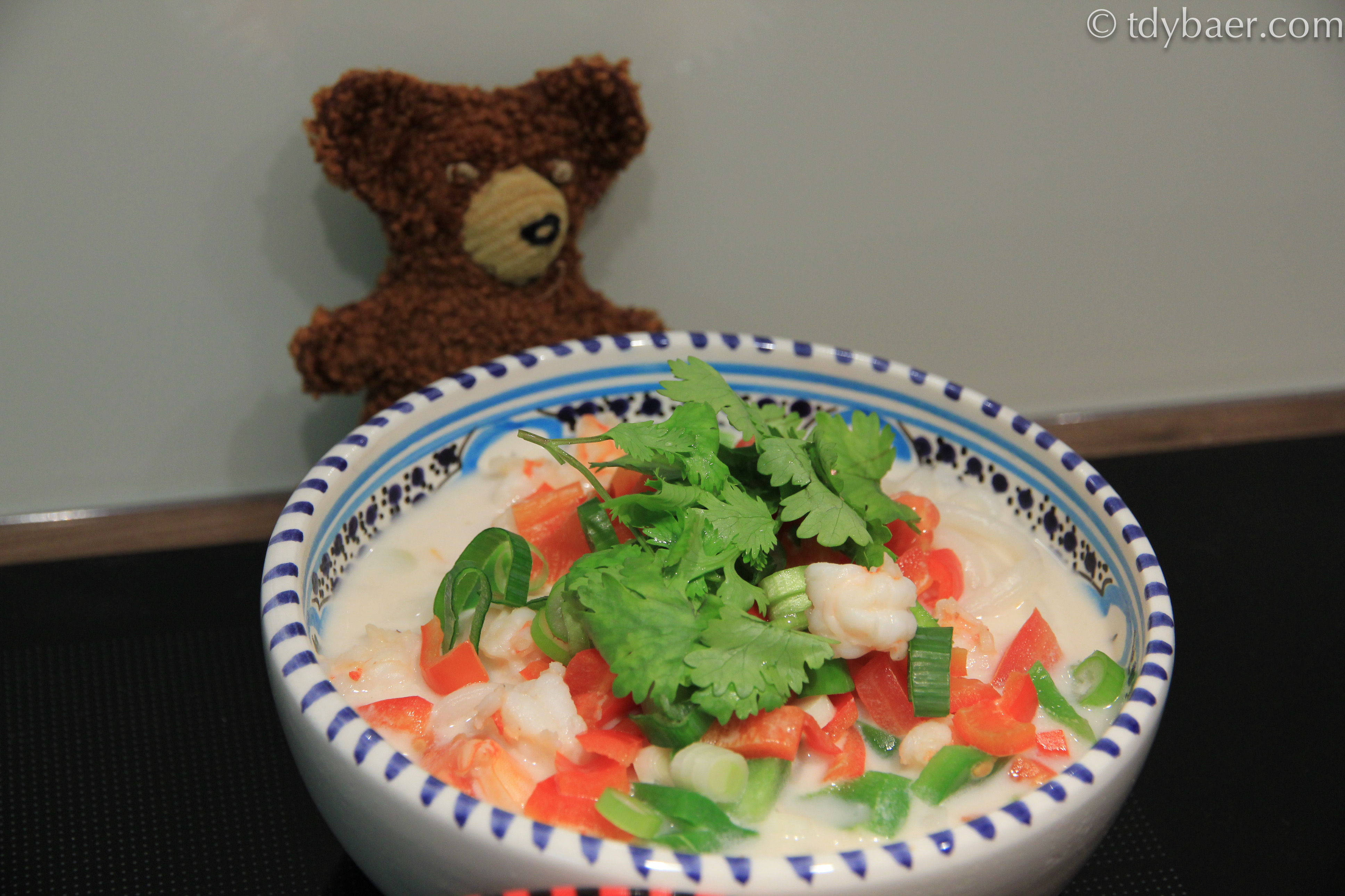 Los geht’s. In einem Topf, wo dann auch noch die Garnelen rein passen müssen , einfach das Wasser, die Milch, den Zucker und die Fischsauce verrühren und zum Kochen bringen. Immer schön umrühren :-). Anschließend die Kokosnussmilch mit dazutun und wieder kurz aufkochen. Jetzt die Garnelen reingeben und diese ca. 2-3 Minuten köcheln, bis sie gerade gar werden.