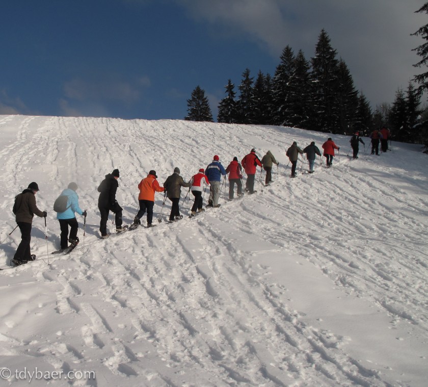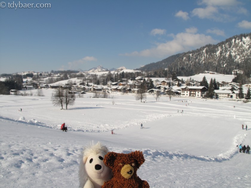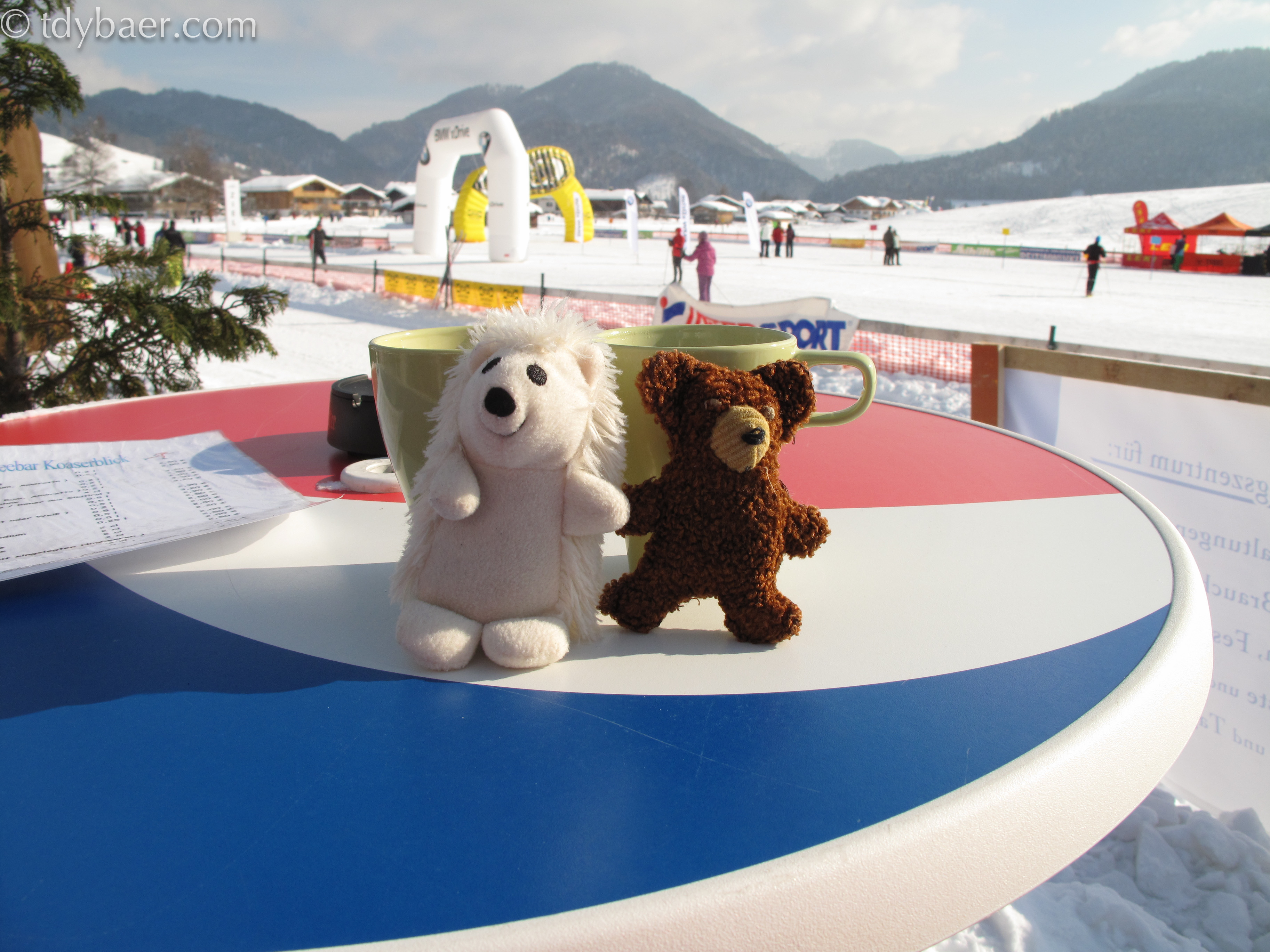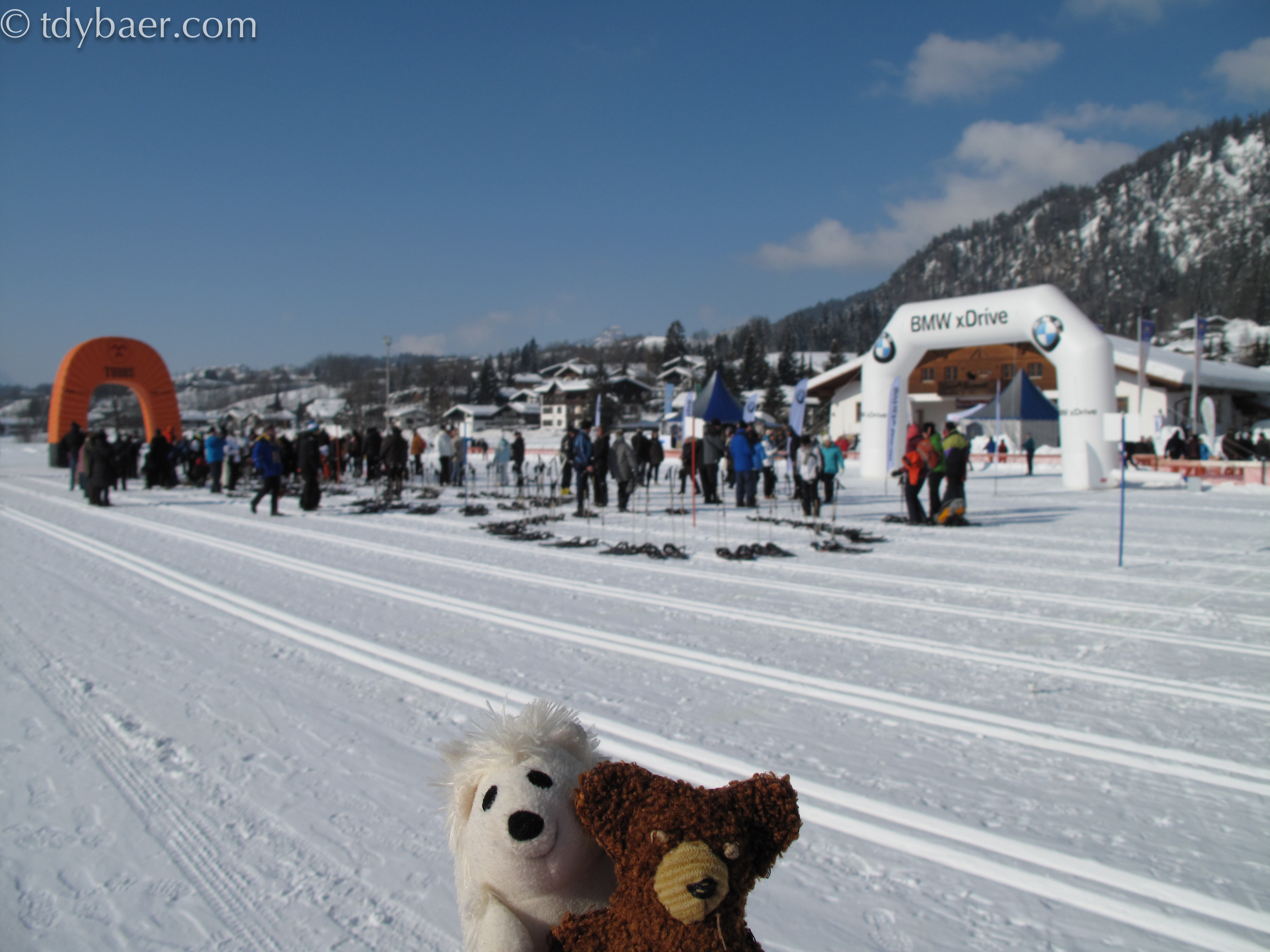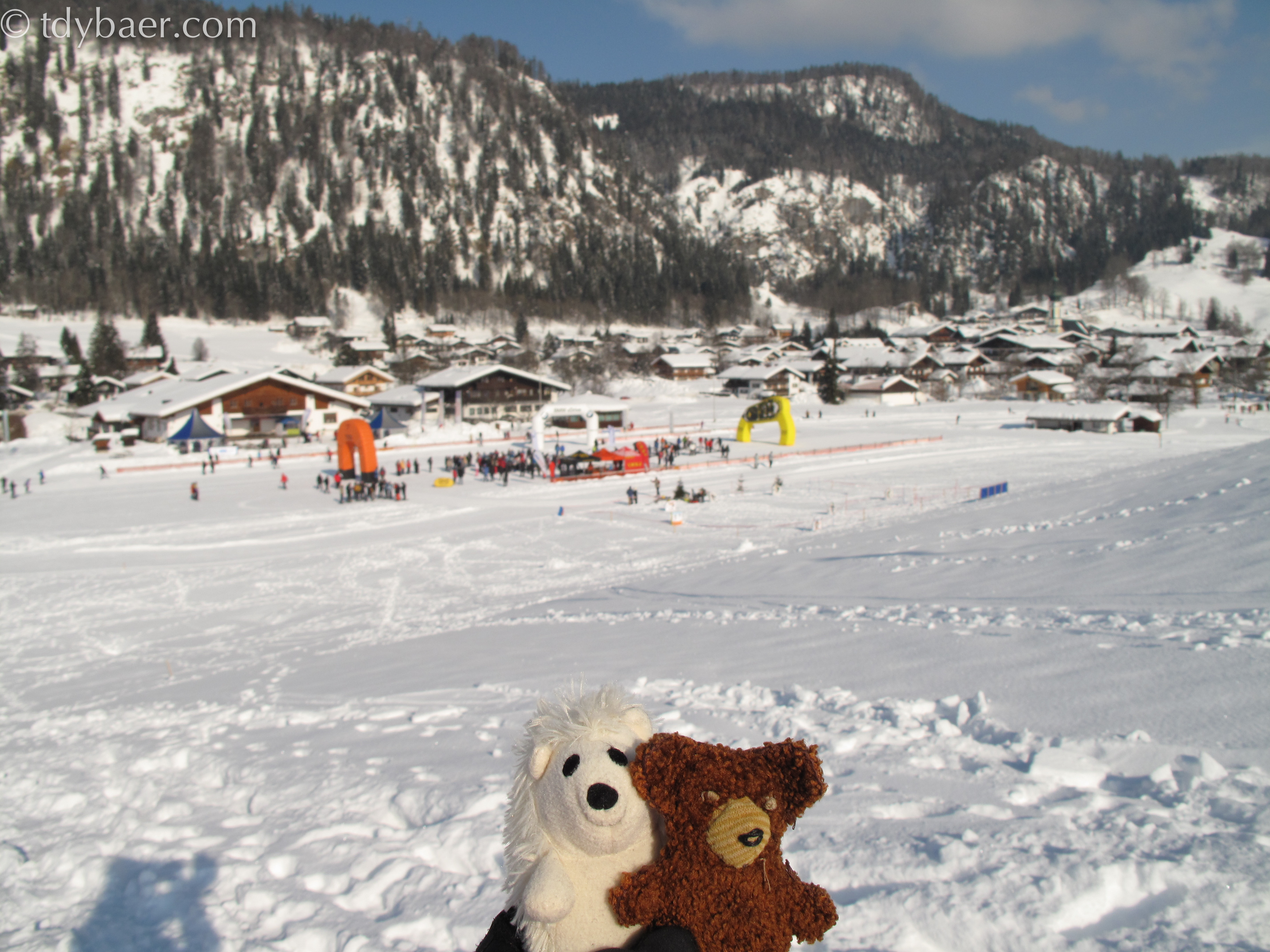 Hehe, wie bestellt weckte mich die Sonne an diesem schönen Morgen. Endlich ist es soweit, Schneeschuhe an die Tatzen und auf gehts :-). Die Leute von http://www.schneeschuherlebnis.de haben sich am Ski-Langlaufstadion in Reit im Winkl aufgestellt und bereits ab 10 Uhr für Stimmung gesorgt. Eisigel und ich holten uns das Teilnahmebändchen und freuten uns nun auf 12:30 Uhr, wo unsere Tour starten sollte. Bis dahin machten wir uns mit Gruppengymnastik warm und schlenderten noch ein wenig in der Gegend rum.
