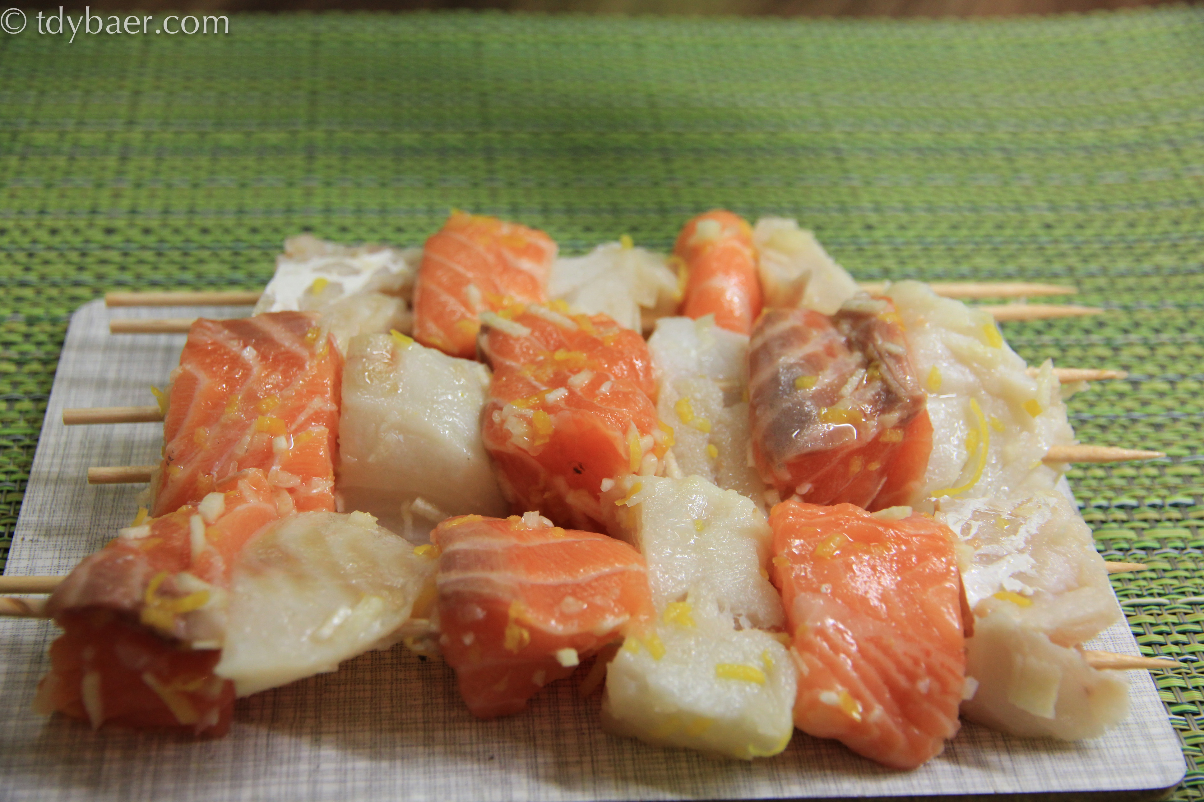 Für die Fischmarinade 2TL Schale von der Zitrone abreiben und mit 2EL Öl und dem Knoblauch in einer Schüssel vermischen. Die Fischstücke vorsichtig mit dem Knoblauch-Zitronen-Öl vermischen. Jetzt noch die Zitrone in Scheiben schneiden und die Scheiben auf einen Teller mit dem Zucker legen. Jetzt nimmt man 2 Spieße in die Hand und spießt damit gleichzeitig hintereinander abwechselnd (hä?) die Fischstückchen auf. Das sieht dann so aus: