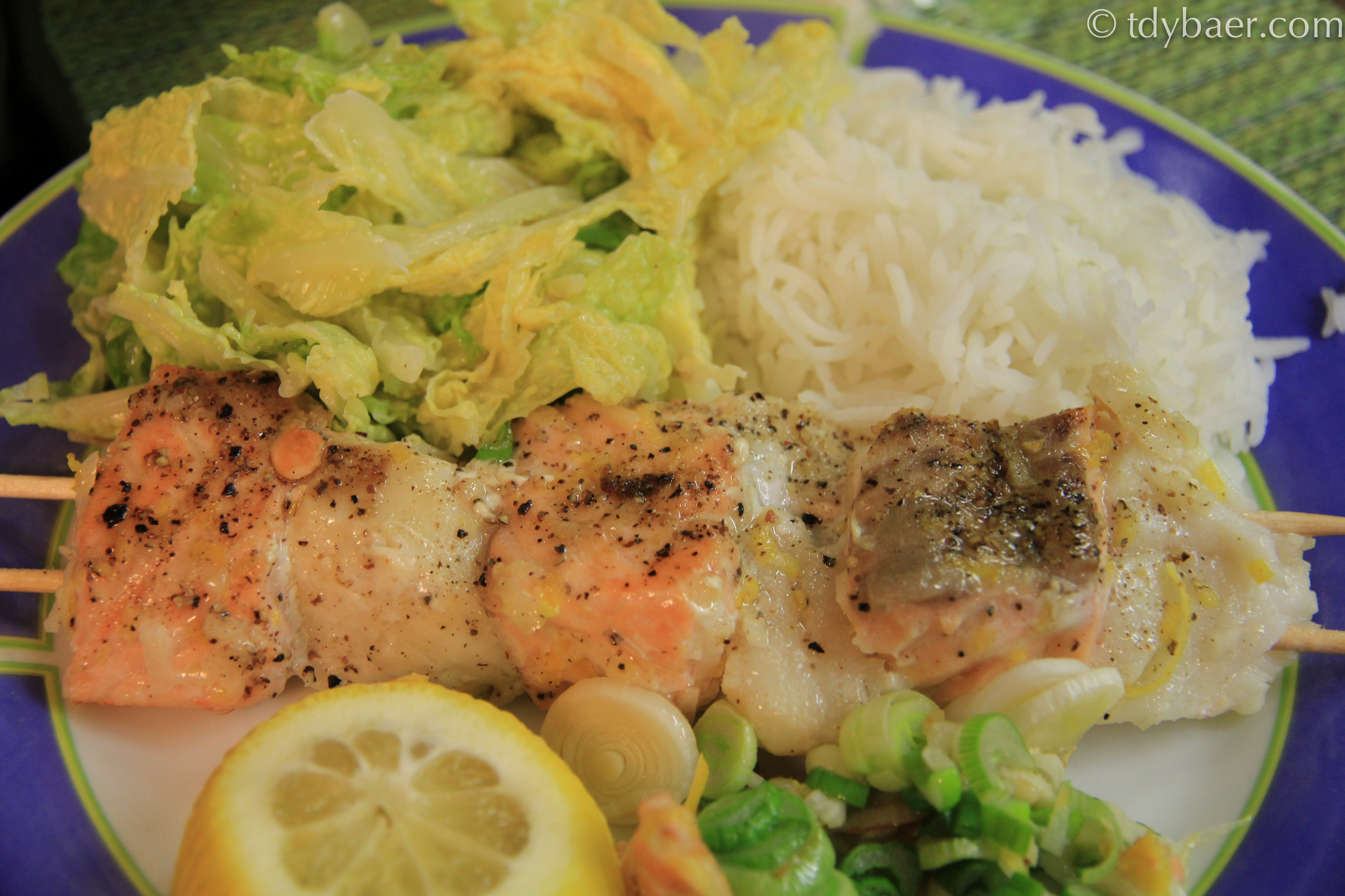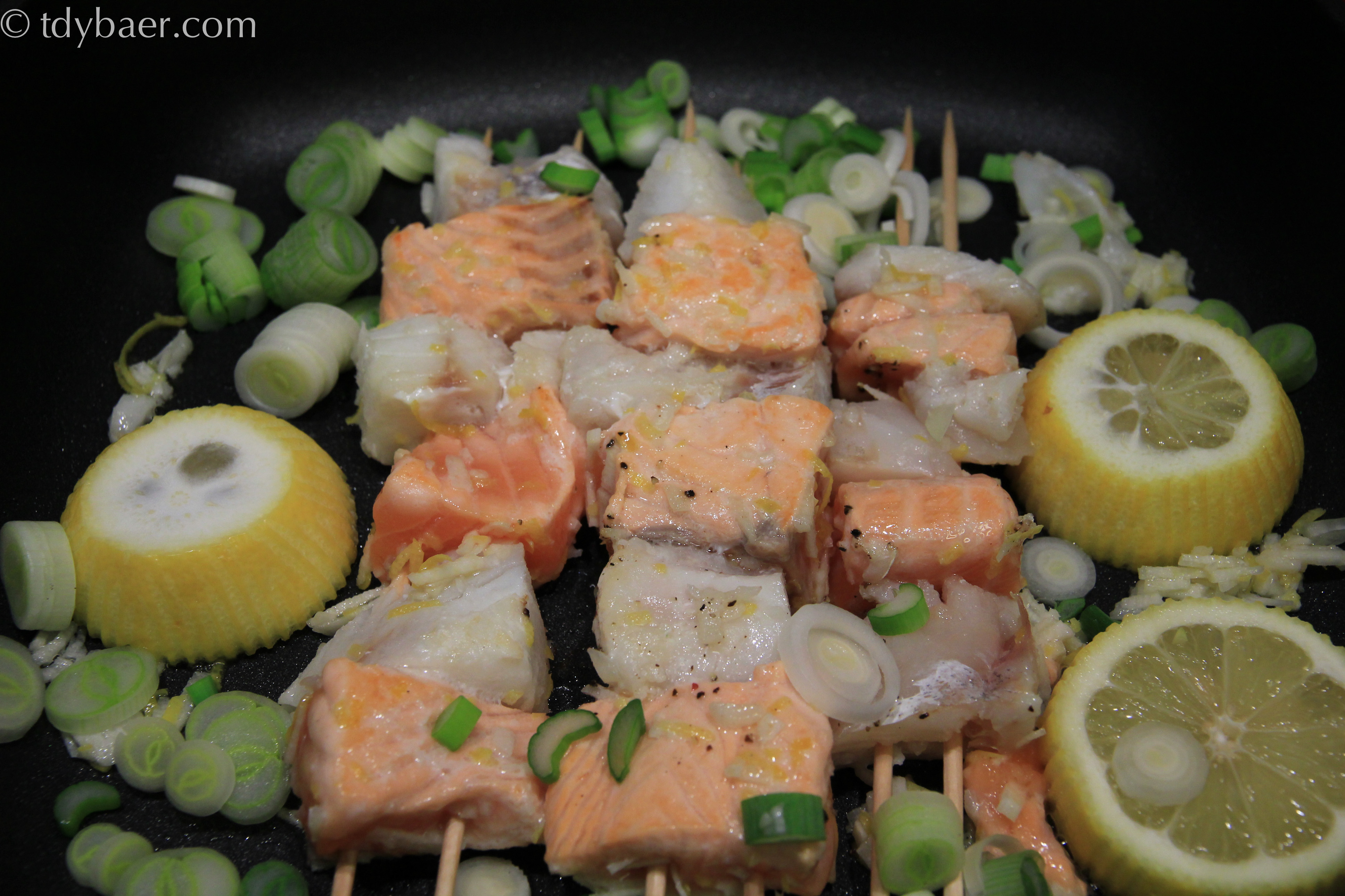 Die Fischspieße noch mit Salz und Pfeffer würzen und in die beschichtete Pfanne geben. Nach 2 Minuten die Zitronenscheiben mit dazugeben. Insgesamt brauchen die Spieße ca. 5 Minuten – dabei immer schön wenden :-).