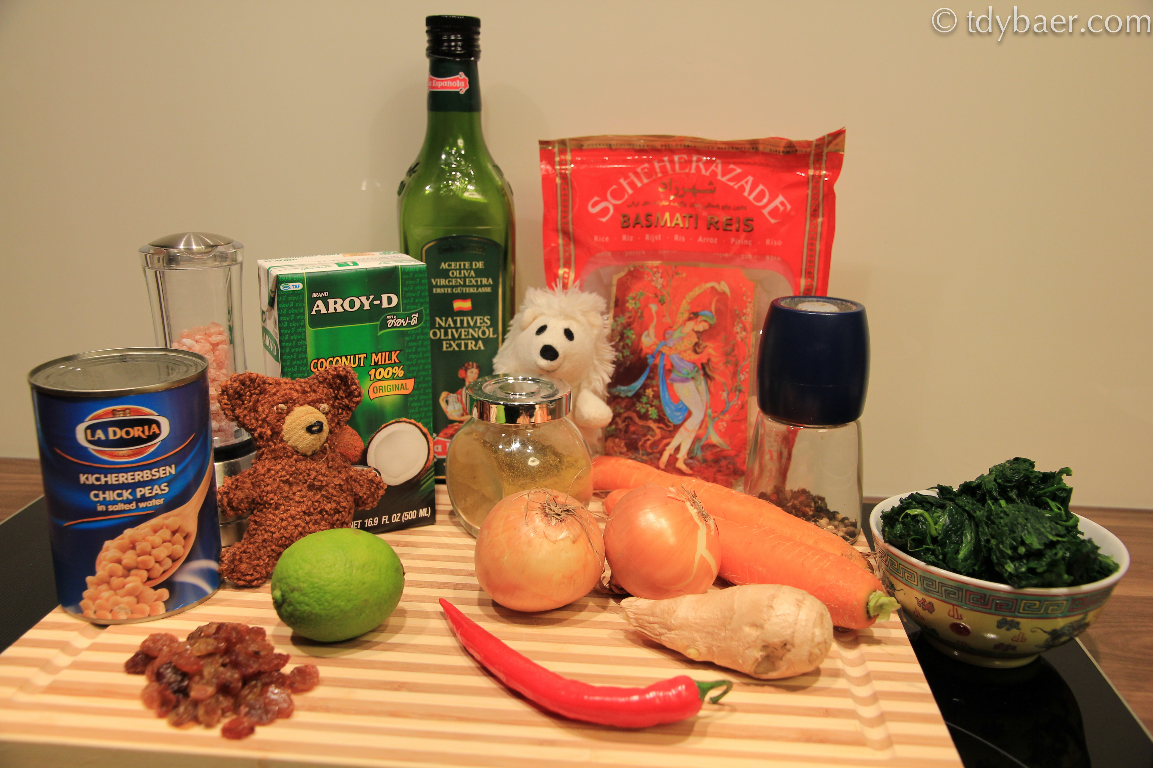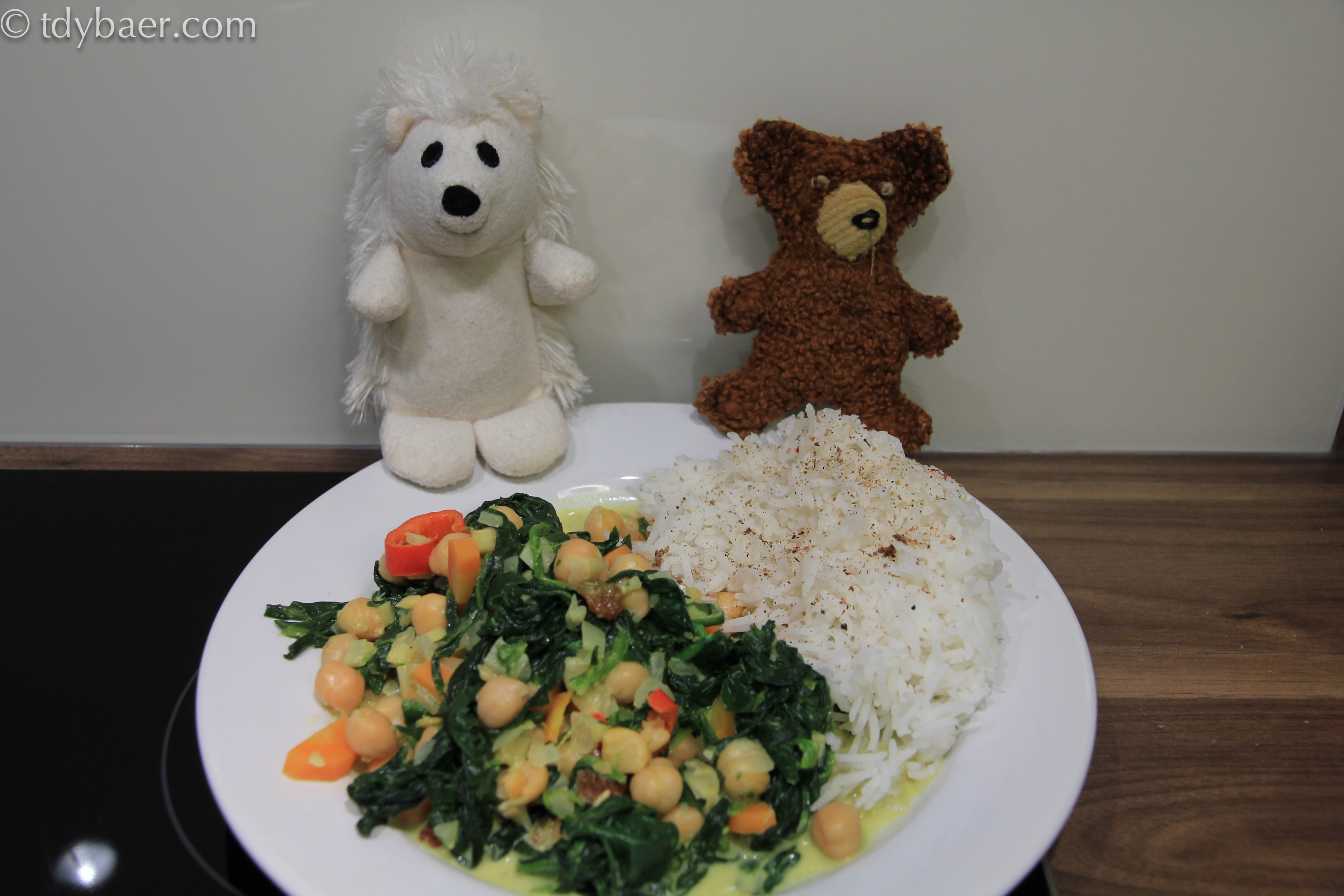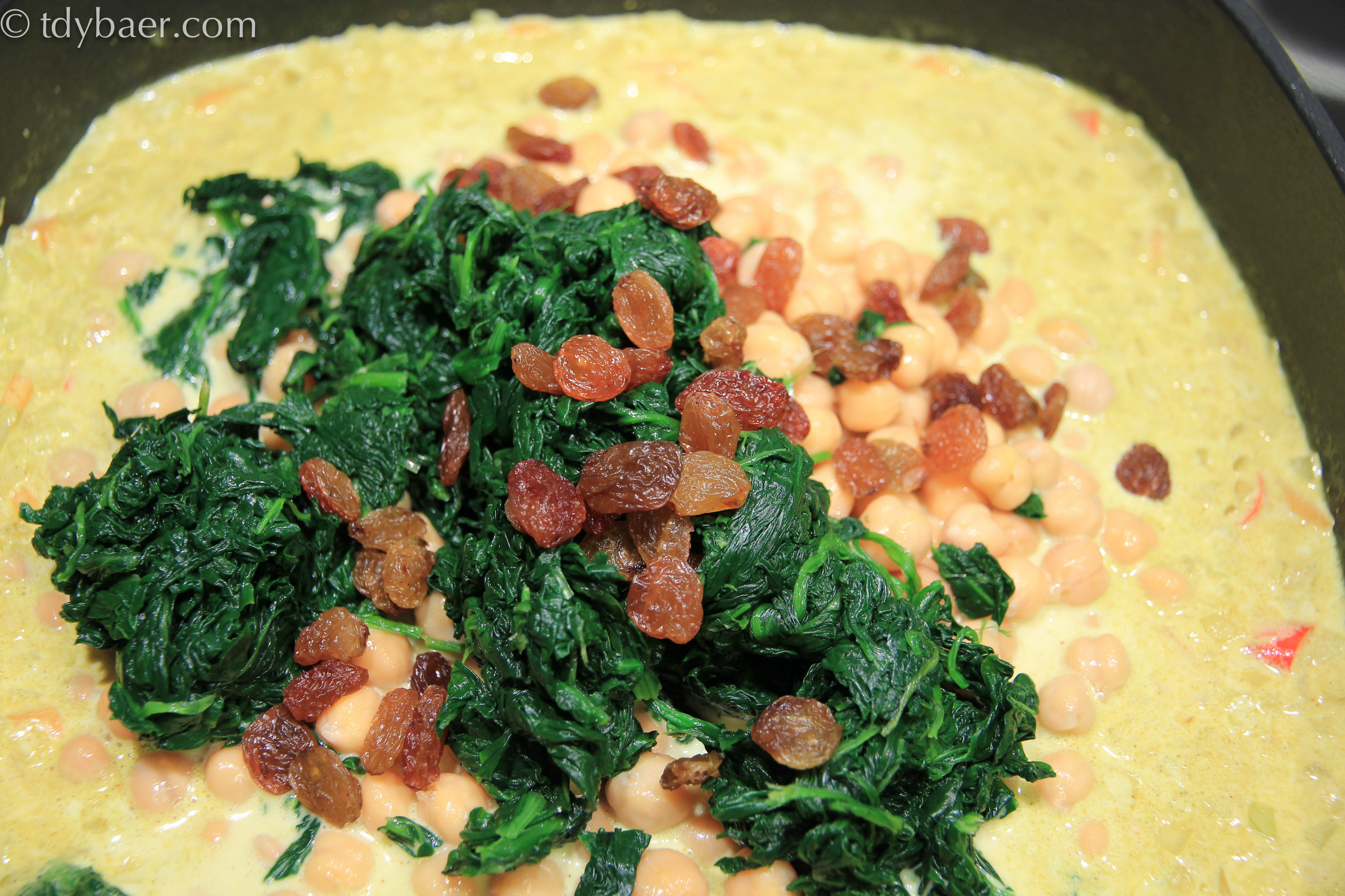 Danach das Currypulver dazugeben und kurz mitbraten. Jetzt die Kokosmilch und das Wasser hinzugeben und aufkochen. Den Spinat ausdrücken und zusammen mit den Rosinen und den abgespülten und abgetropften Kichererbsen untermischen und 8 Minuten köcheln lassen.