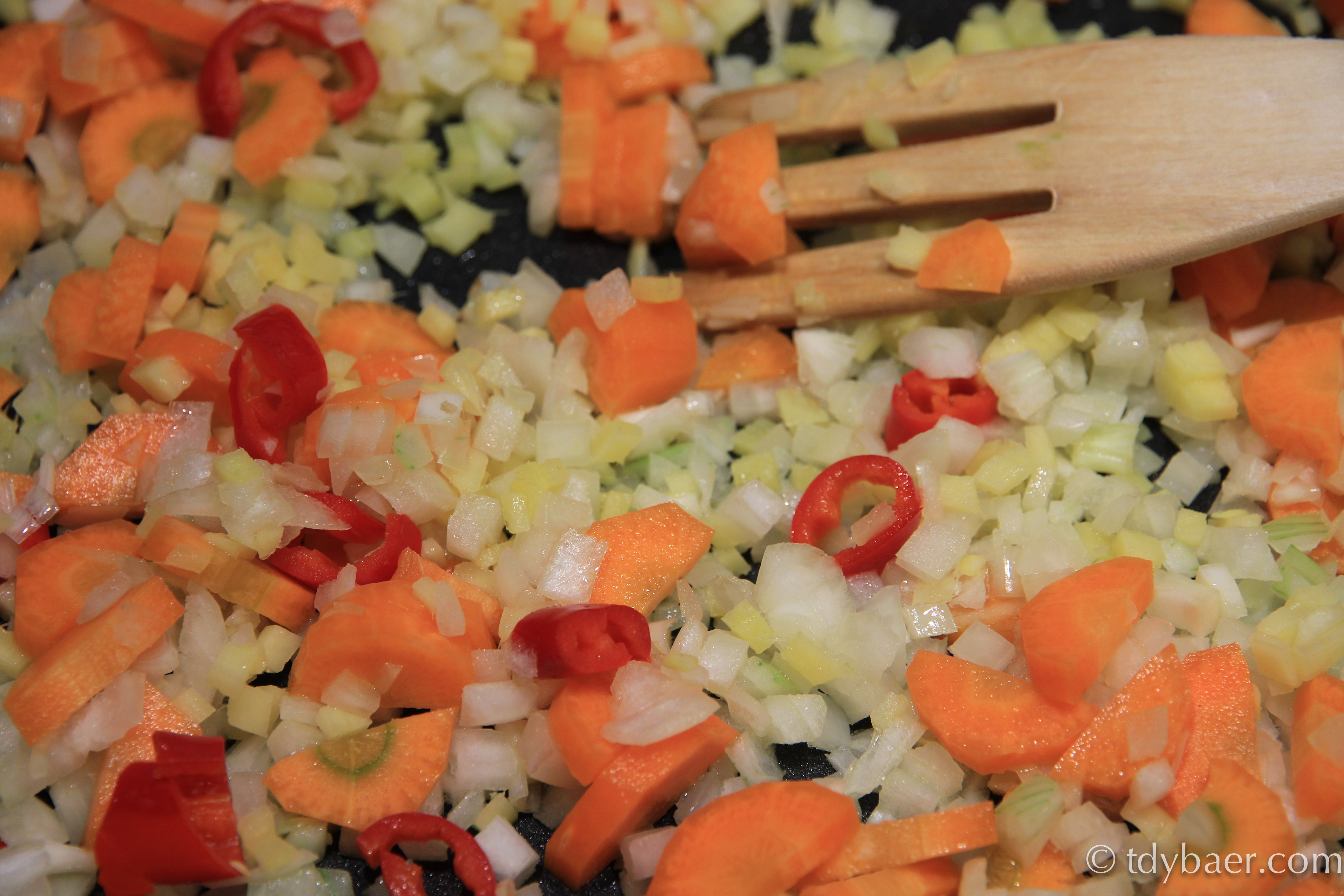 In einer Pfanne etwas Öl erhitzen und die Zwiebeln, den Ingwer, die Chili und die Möhren 4 Minuten dünsten.