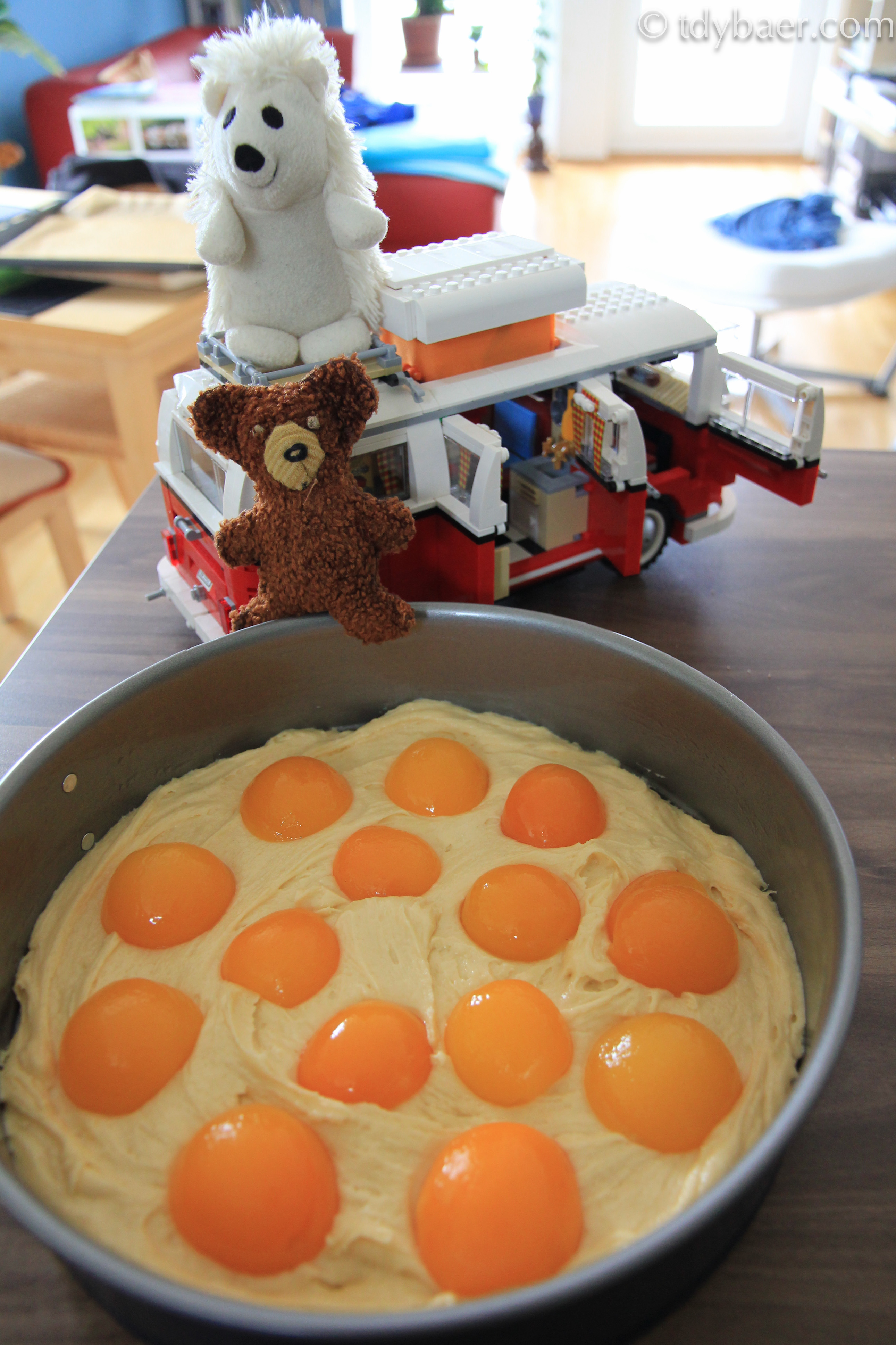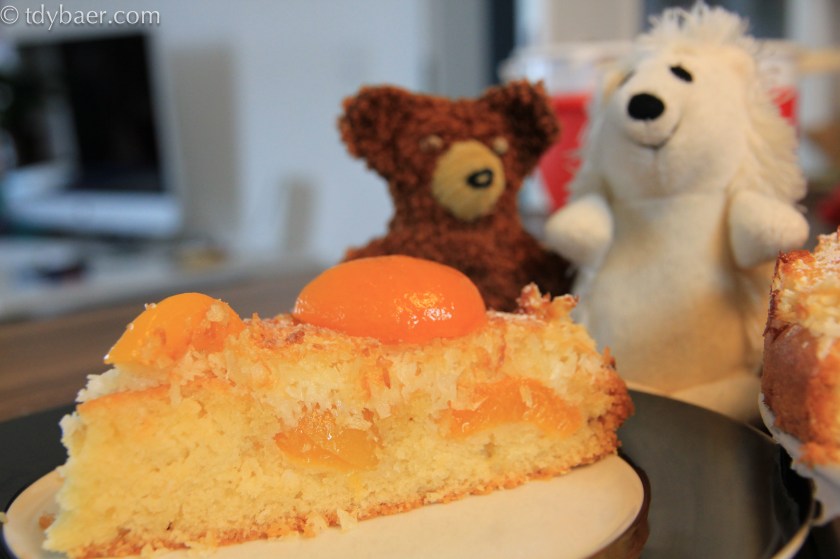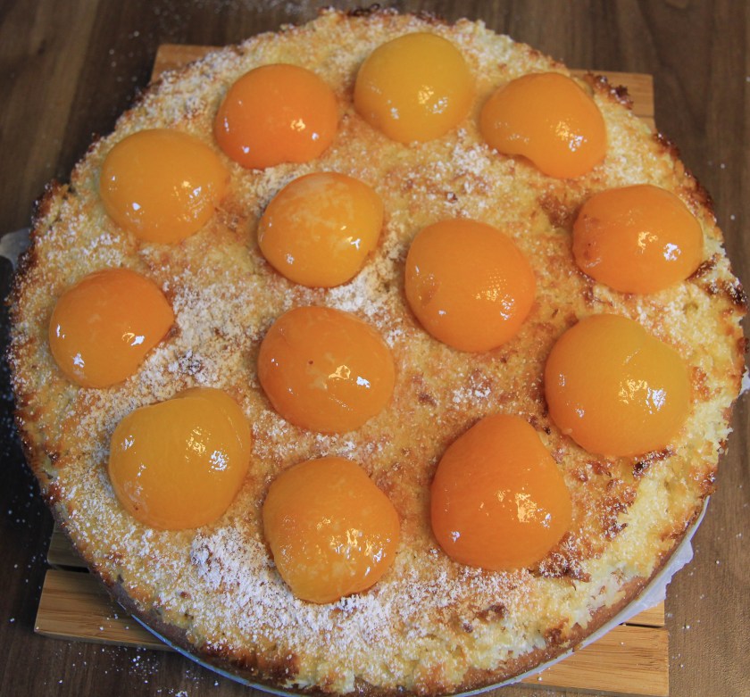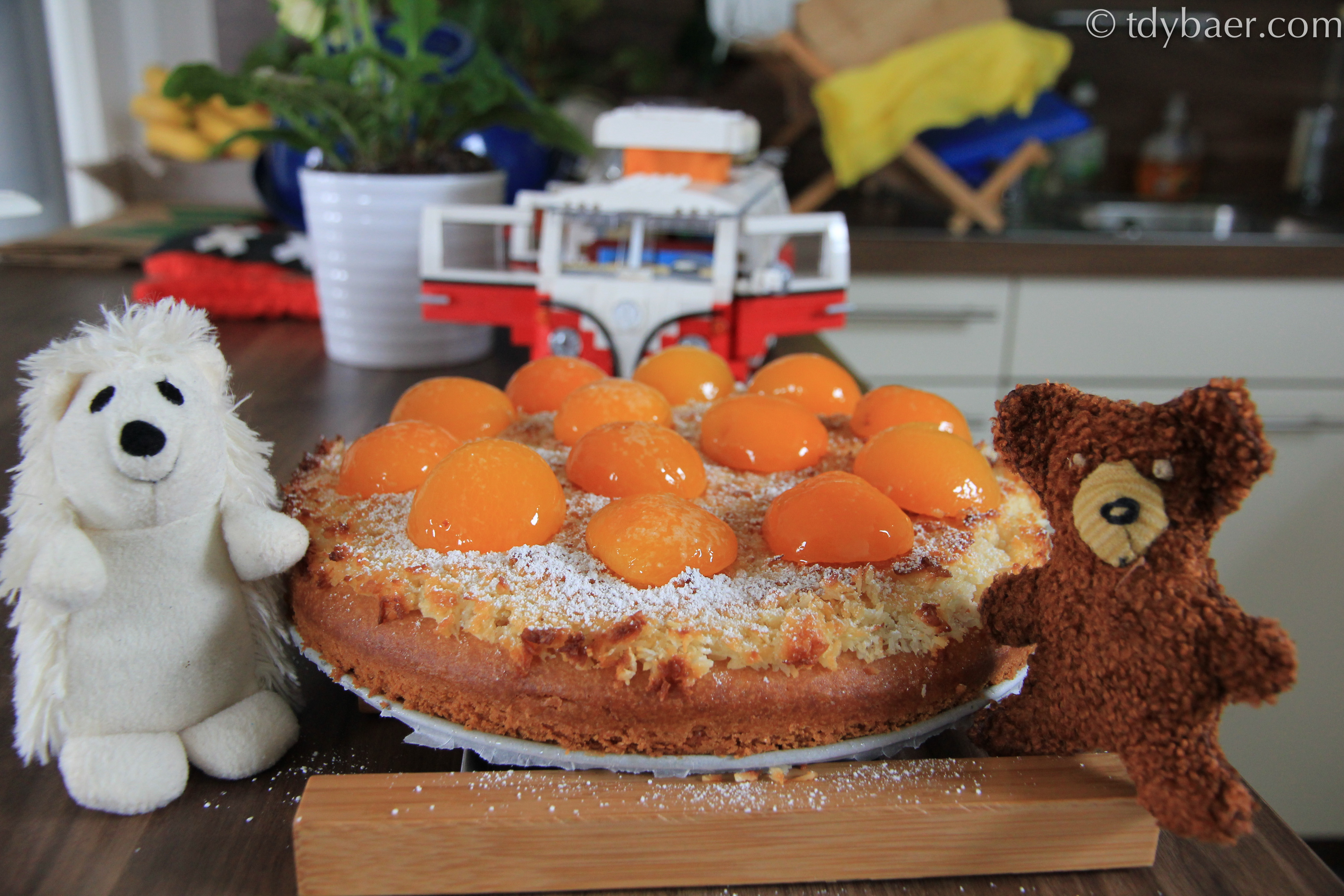 Eine Springform mit 26cm Durchmesser mit Backpapier auslegen und den Teig auf dem Boden glatt streichen. Mit 2/3 der Aprikosen belegen und ab damit in den Backofen für ca. 30 Minuten bei 175° –> auf der untersten Schiene.