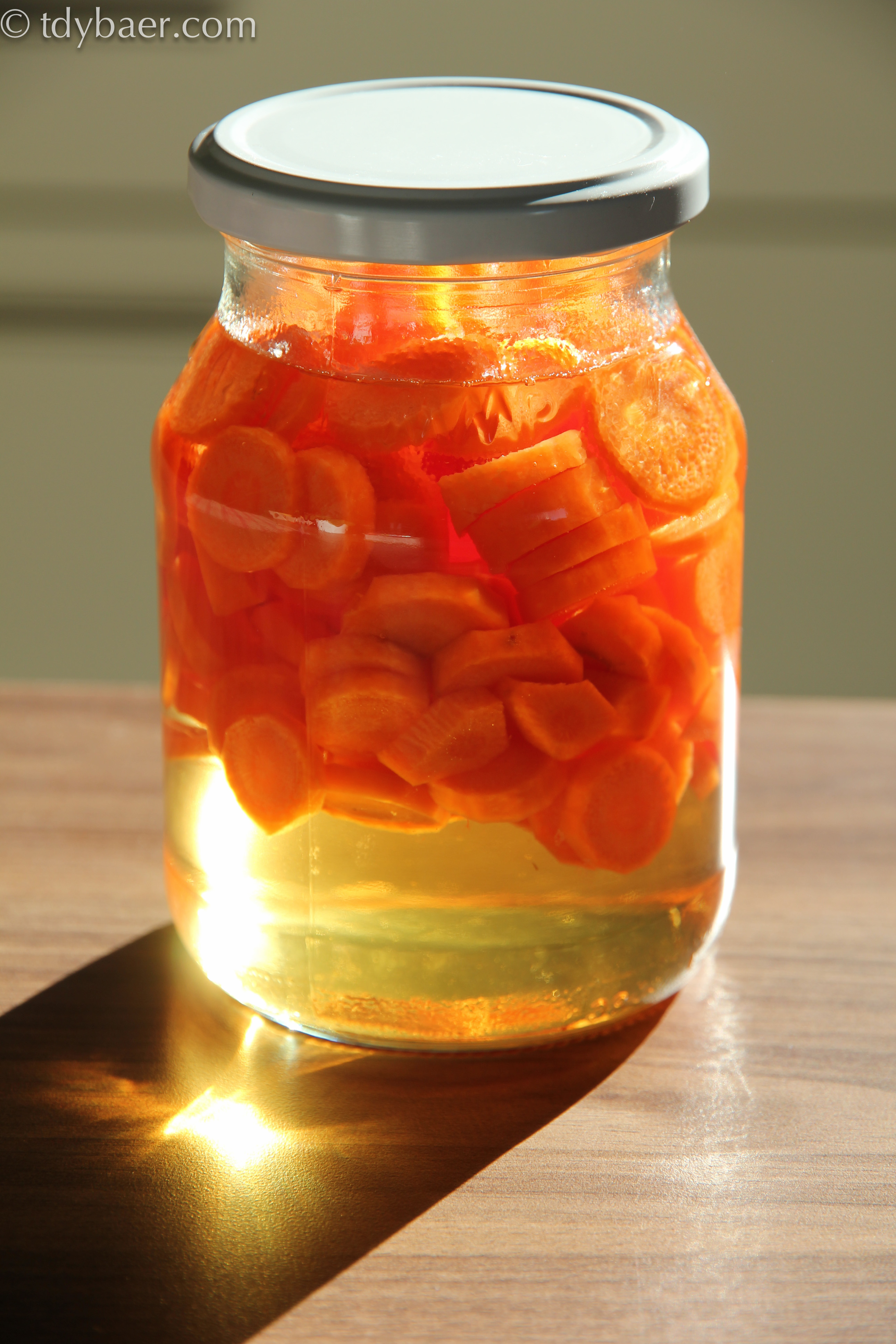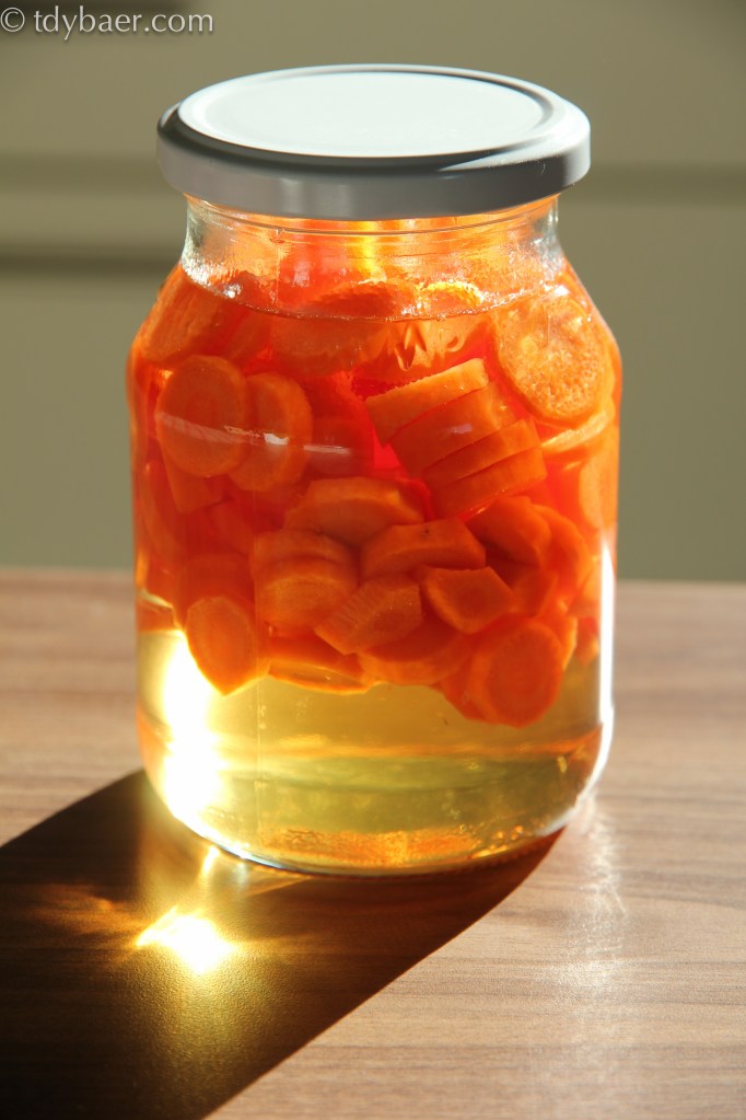 Jetzt hat man Zeit die Karotten zu schälen und in kleine Scheiben zu schneiden. Die Karotten in ein Einmachglas geben und die erkaltete Flüssigkeit drüber geben. Gut zuschrauben und über Nacht bei Raumtemperatur stehen lassen.