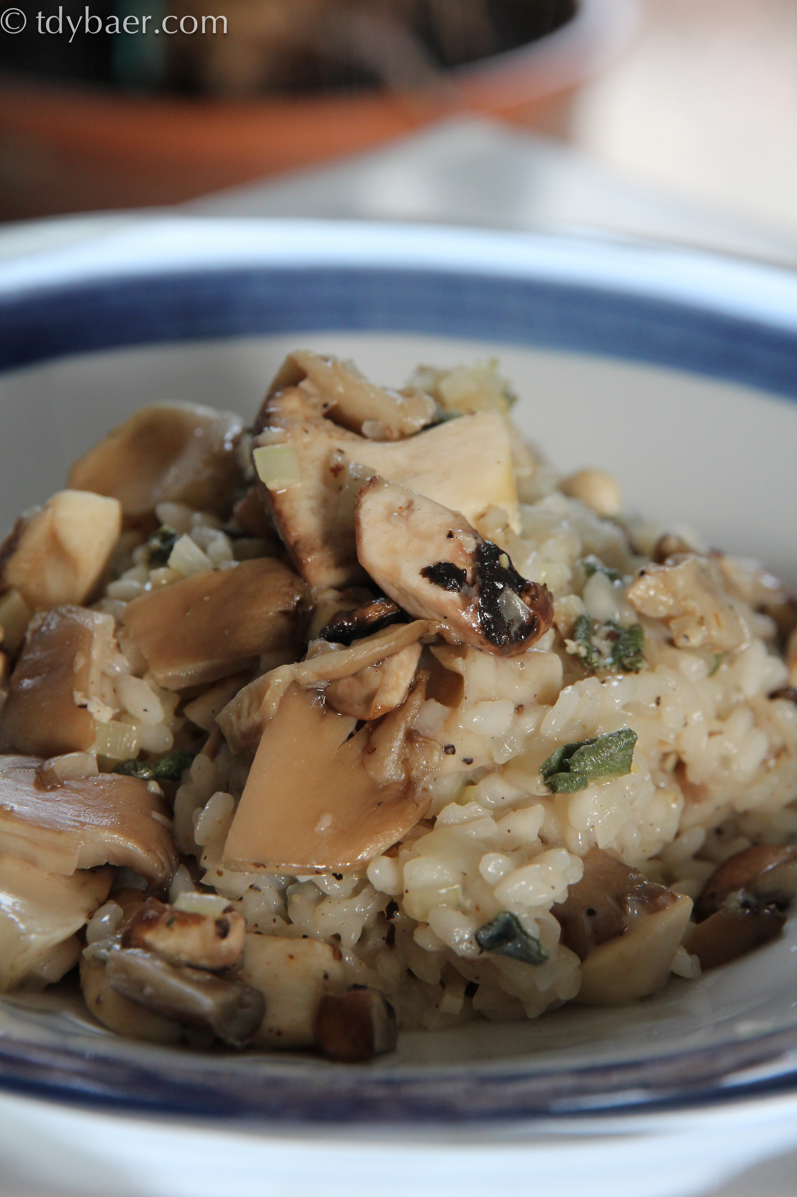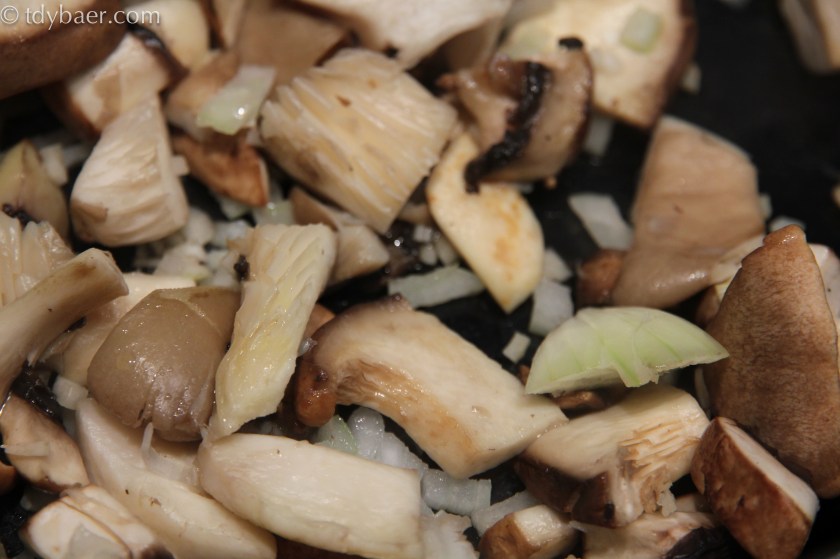 5 – 10 Minuten vor dem Ende der Garzeit des Risotto die Pilze in einer separaten Pfanne in 1 El anbraten. Die übrigen Zwiebeln und den Knoblauch dazugeben und 3-4 Minuten garen lassen.