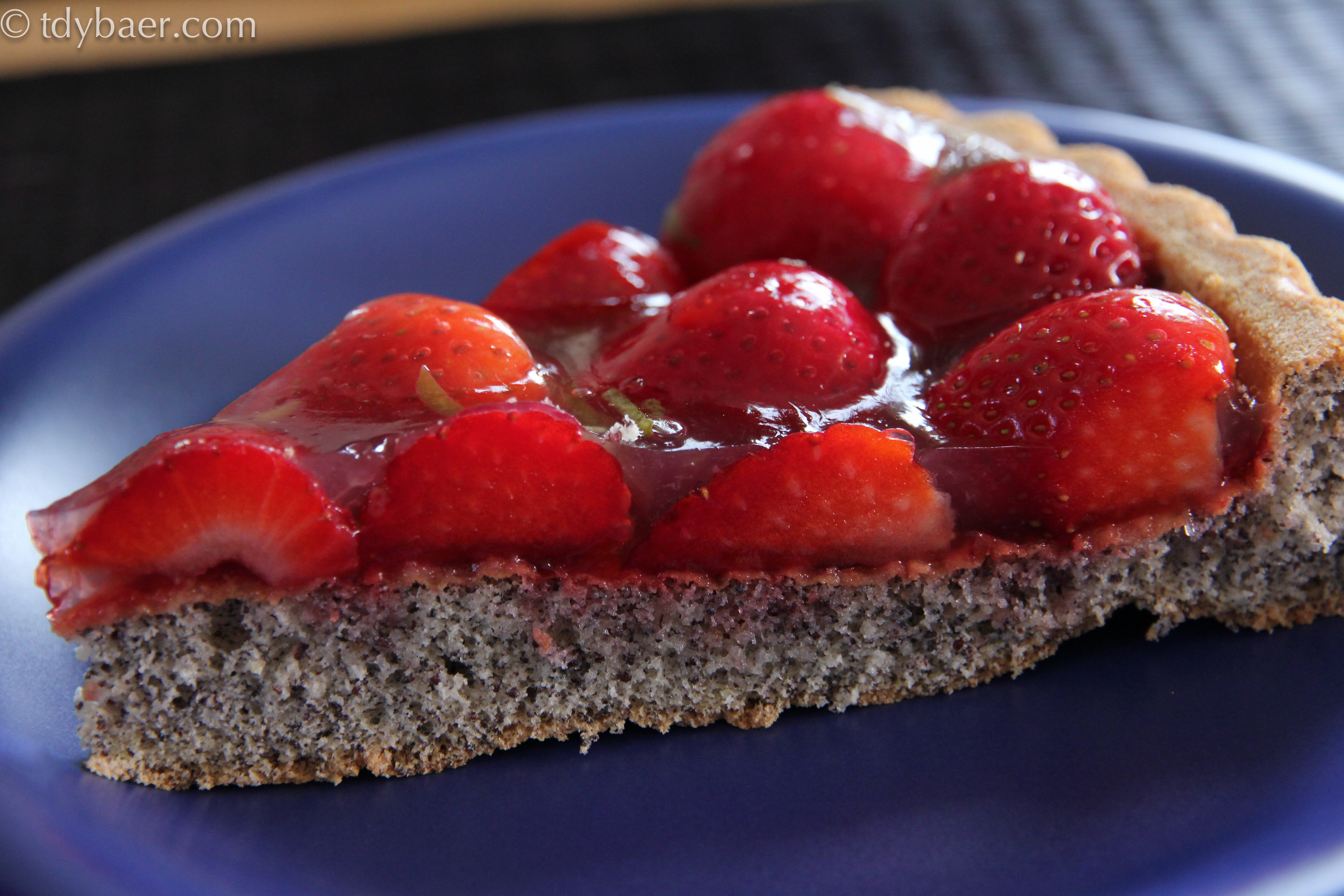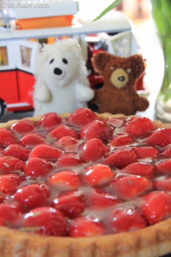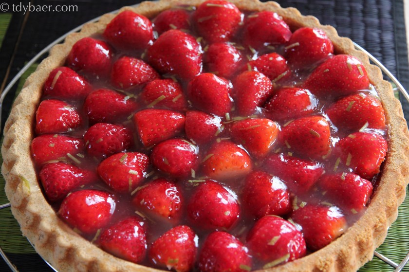 Zum Schluß noch 2 Tl Tortengusspulver mit 10g Zucker und 150 ml Wasser unter ständigem Rühren erhitzen. Von einer Limette die Schale abraspeln und mit 2 Tl Limettensaft zu dem Tortenguss in den Topf geben. Nur ganz kurz aufkochen und sofort über die Erdbeeren geben.