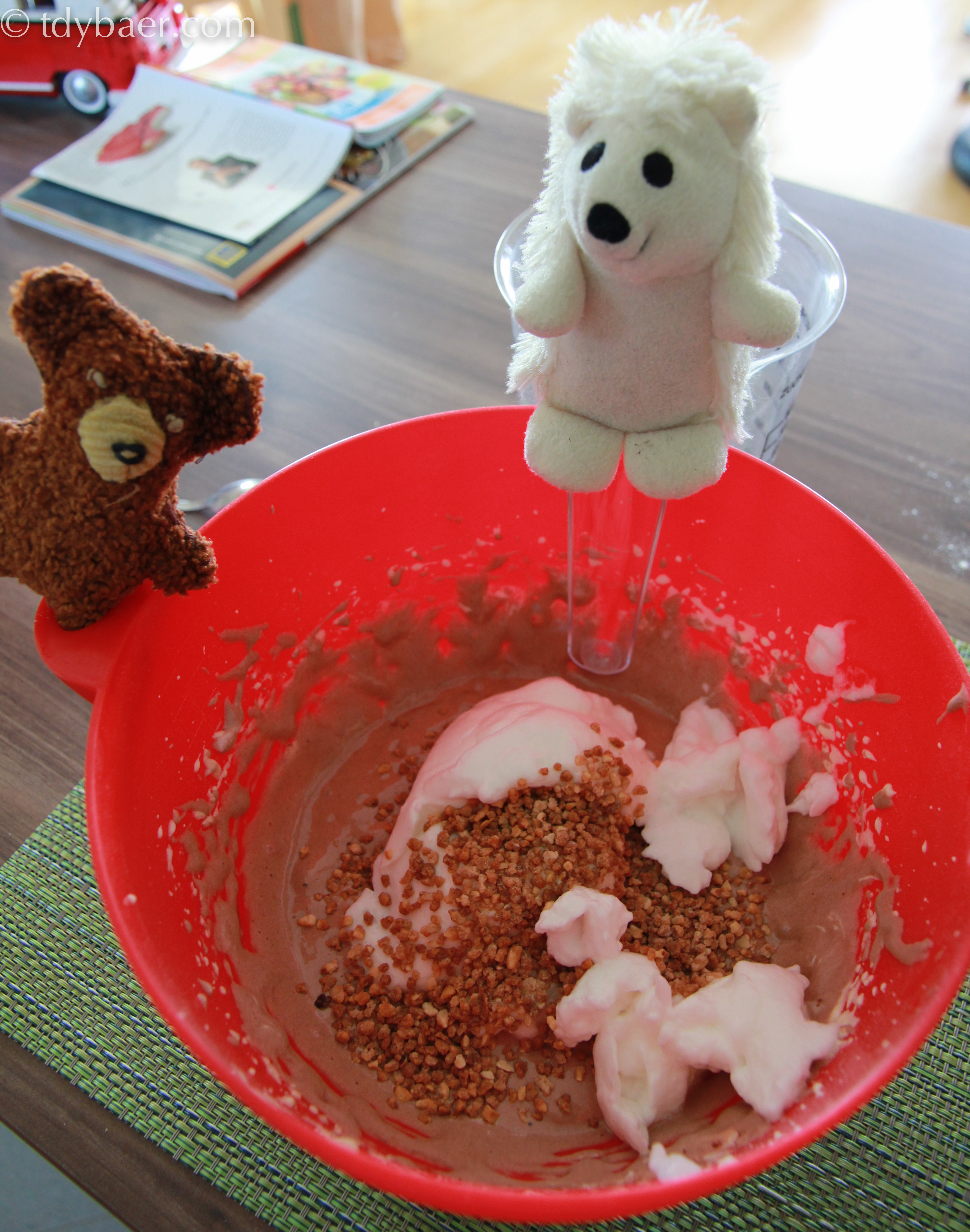 Für den Teig die 2 Eigelb, 2 EL Wasser und 100g Zucker 5 Minuten cremig rühren. Nun das Mehl mit dem Kakao und dem Backpulver mischen und in die Eimasse sieben. Alles schön verrühren. Jetzt noch das Eiweiß mit einer Prise Salz steif schlagen und zum Schluss noch 2 El Zucker unterrühren. Jetzt 1/3 des Eischnees unter den Teig rühren. Als letztes das Krokant mit dem restlichen Eischnee vorsichtig unterheben.