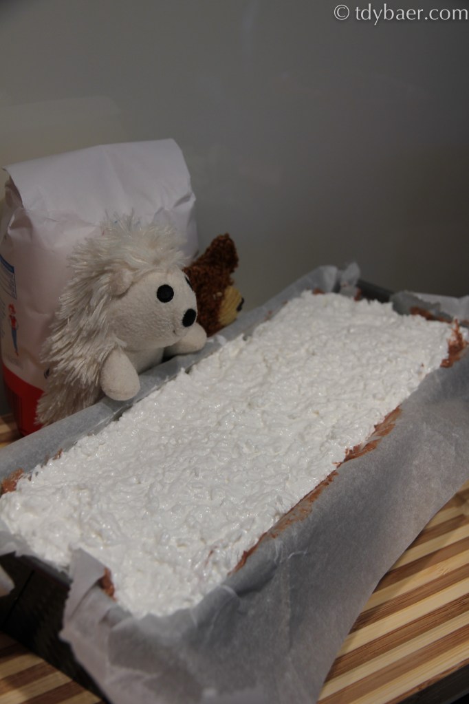 Die zwei Eiweiß mit einer Prise Salz steif schlagen und danach 2 Minuten lang den Puderzucker unterrühren. Anschließend die Kokosraspel unterrühren und dann die Baiser-Masse auf den Teig in der Kastenform streichen.