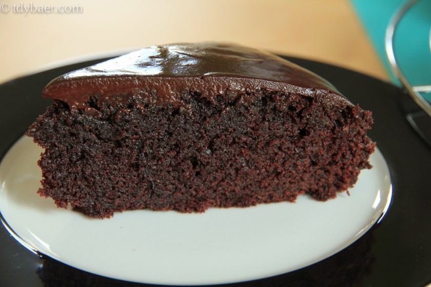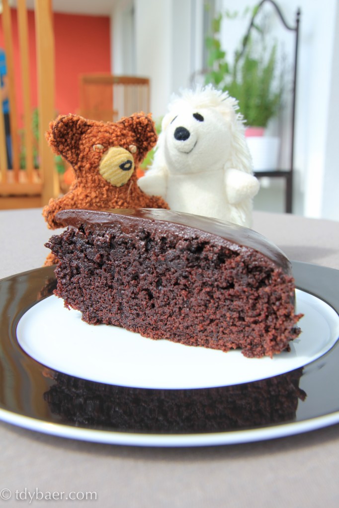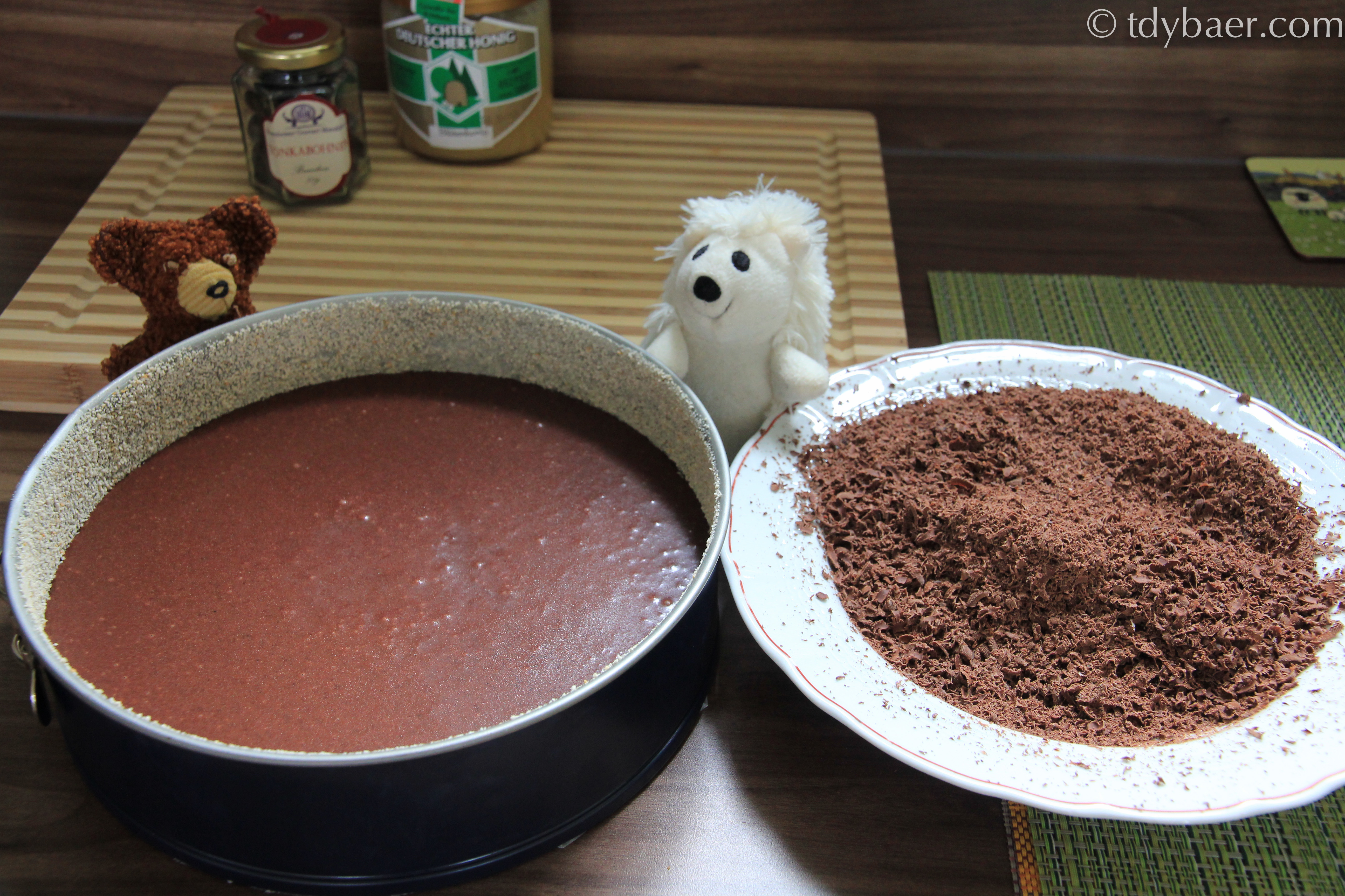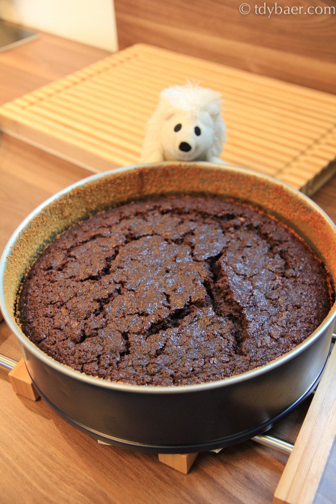 Die dunkle Kuvertüre habe ich in der Zwischenzeit mit der Reibe schön fein gerieben – ganz wichtig. Nach der Backzeit mit dem Holzstäbchen in den Kuchen piecksen und schauen ob er fertig ist. Schaut doch super aus: