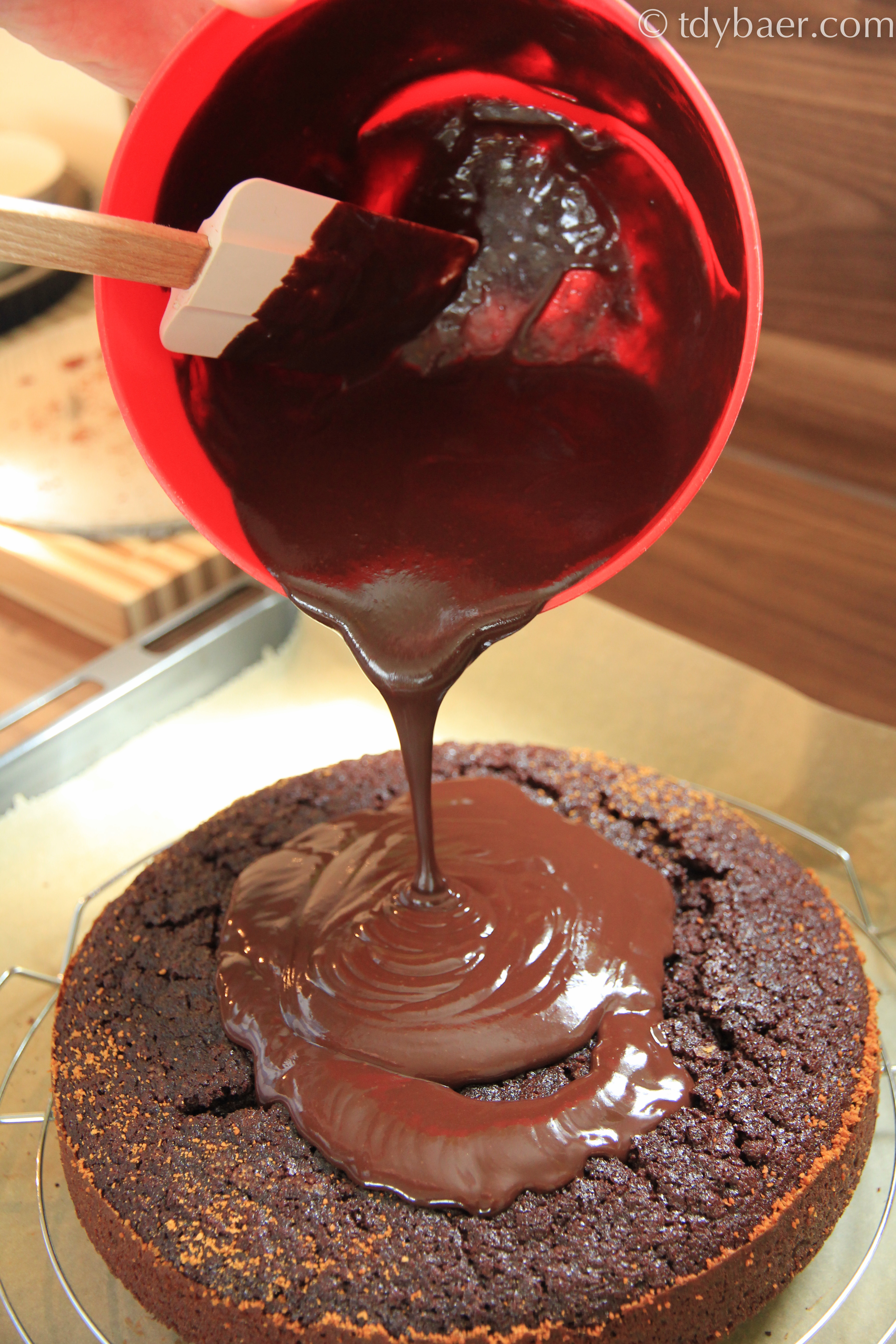 Den Kuchen 15 Minuten in der Form ruhen lassen und dann erst auf dem Kuchengitter abkühlen lassen (Backpapier entfernen). Jetzt kann man sich um die Glasur kümmern. Die Milch und die Sahne in einem Topf mit den Tonkabohnen erwärmen und kurz aufkochen lassen. Die Bohnen rausnehmen, gut abspülen und trocknen lassen (für die nächsten 7-10 Kuchen). Die geriebene Kuvertüre in eine Schüssel geben und die warme Milch darüber gießen, eine Minute warten und dann vorsichtig umrühren. Anschließend den Honig und die Butter dazutun und zu einer schönen cremigen Masse vermischen. Jetzt die Kakao-Kuvertüre von der Mitte aus über den Kuchen gießen und vorsichtig verteilen.
