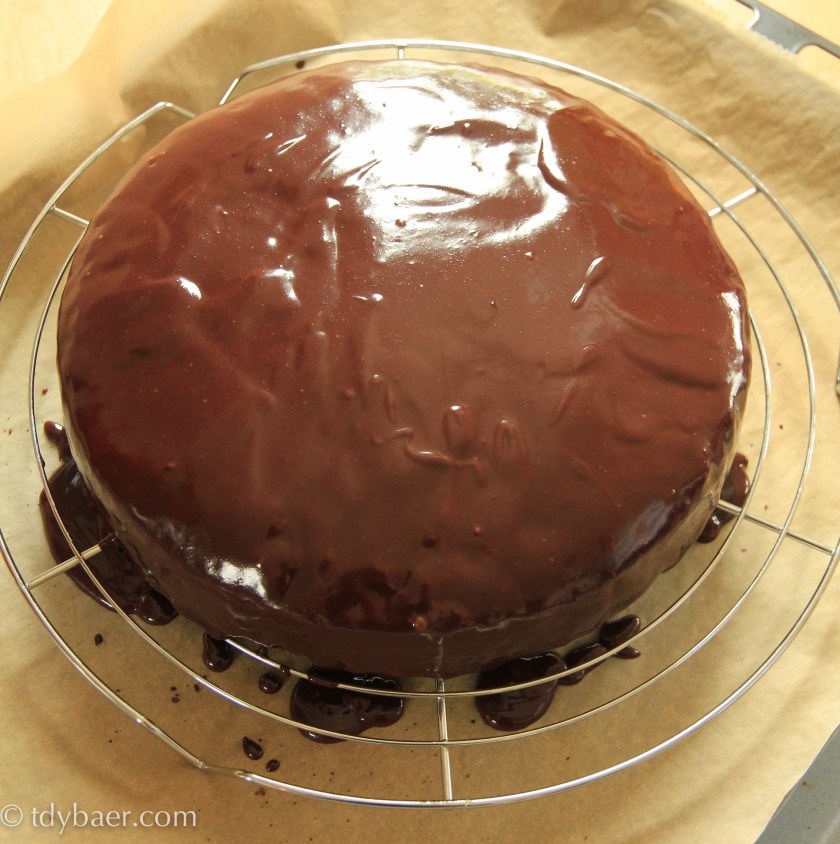 Den Kuchen mit der Glasur abkühlen lassen und danach mit voller Vorfreude anschneiden und guten Freunden servieren.