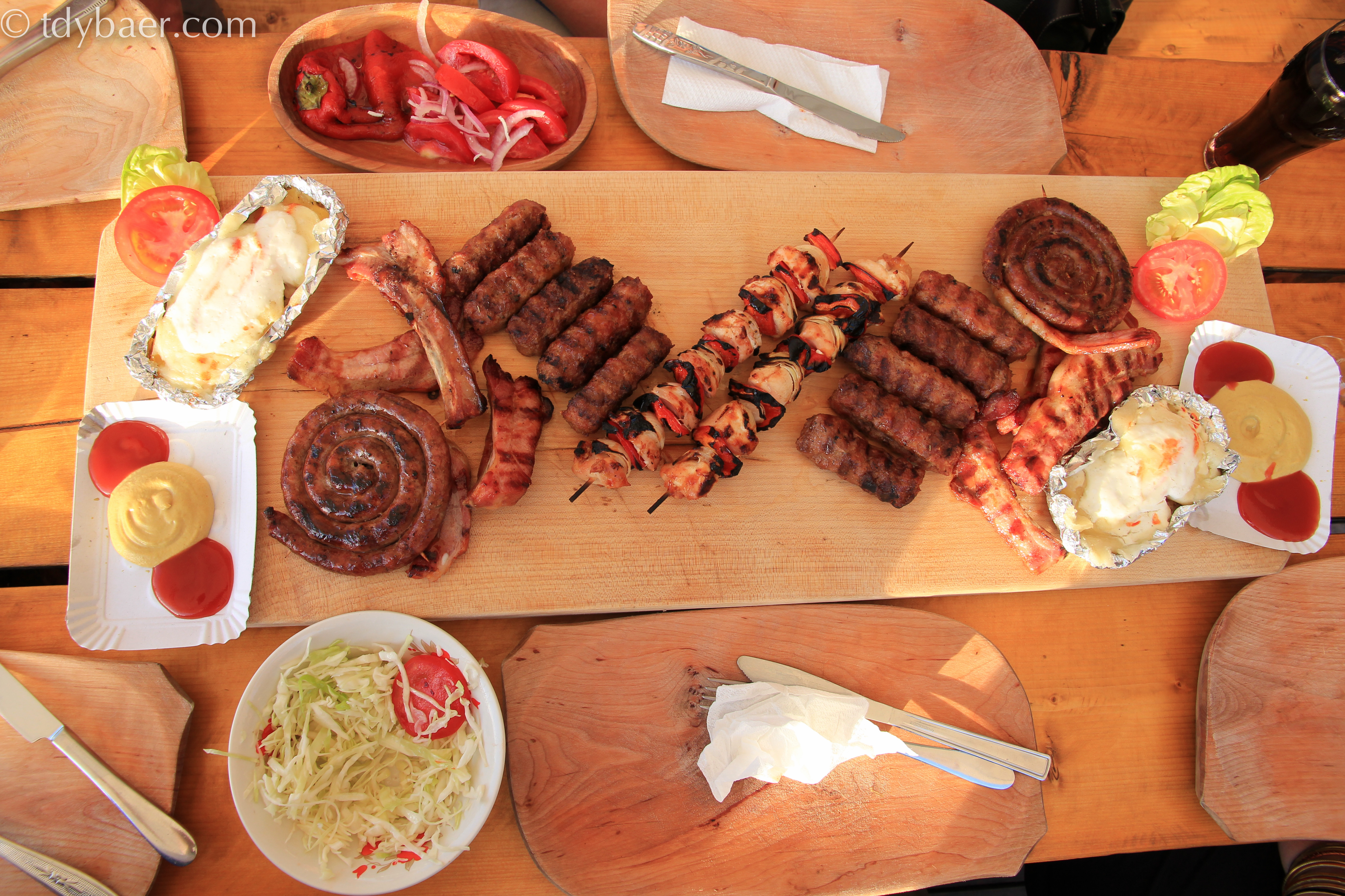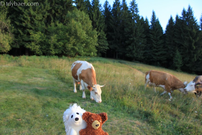 Hungrig? 🙂 Die Salate drum herum, insbesondere der Weißkraut-Tomatensalat war immer ein Gedicht. Nach der Hauptmahlzeit leisteten uns auch ein paar Kühe Gesellschaft, die aus dem Wald heraus kamen und nach Hause wollten.