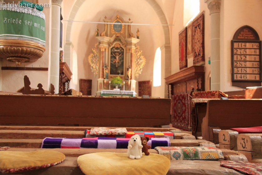 Und hier ein Bild vom Inneren der Kirche. Toll fand ich die bunten Kissen und die etwas anderen Sitzbänke :-).
