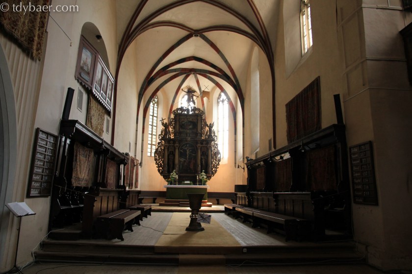 Der nächste Stopp war die Klosterkirche, gleich neben dem Turm. Sie ist eine von acht Kirchen in der Burgstadt und wurde 1298 erstmals erwähnt. Die einst dem Dominikanerorden gehörende Kirche war über einen Kreuzgang mit dem daneben liegenden Kloster verbunden. Bemerkenswert ist der Barockaltar von 1680 und das bronzene Taufbecken von 1440. Auf dem Abendmahlsbild des Altars sollen die Jünger die Gesichtszüge der damaligen Ratsmitglieder und des Stadtpfarrers tragen.