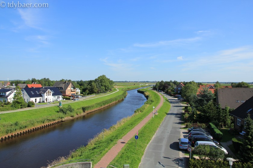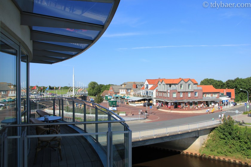 Das wars auch schon aus Emden, denn wir wollen ja hoch an die Nordsee. Ein guter Ausgangspunkt für Tagesausflüge zu den ostfriesischen Inseln ist die kleine Stadt Bensersiel, die wir nun ansteuerten. Da wir noch eine Unterkunft brauchten, versuchten wir es direkt gleich mal im Hotel Benser Hof. Wir hatten Glück 🙂 und kurze Zeit später bezogen wir ein wunderschönes großes Zimmer mit Panoramablick ins Inland auf das Benser Tief (das Flüsschen) und auf den Hafen.