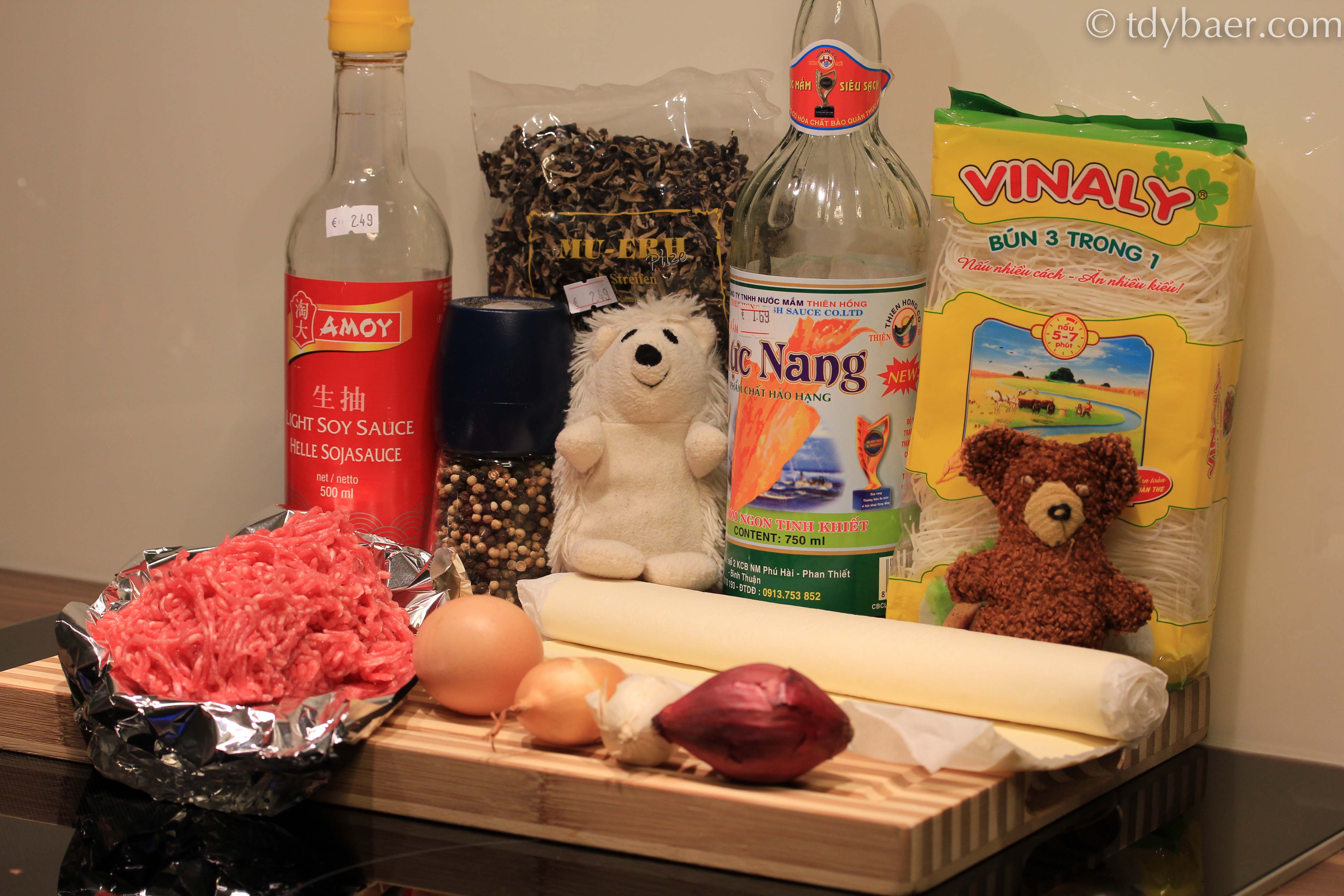 Nun in einer Schüssel das Hackfleisch, die Pilze, die Glasnudeln, die Schalotten, die Fischsauce, die Sojasauce und den Pfeffer gut vermengen. Jetzt den Ofen auf 160 °C vorheizen.